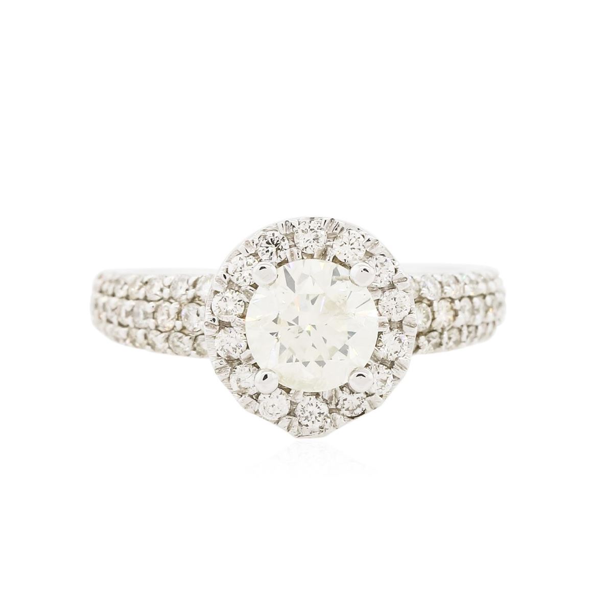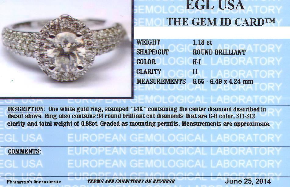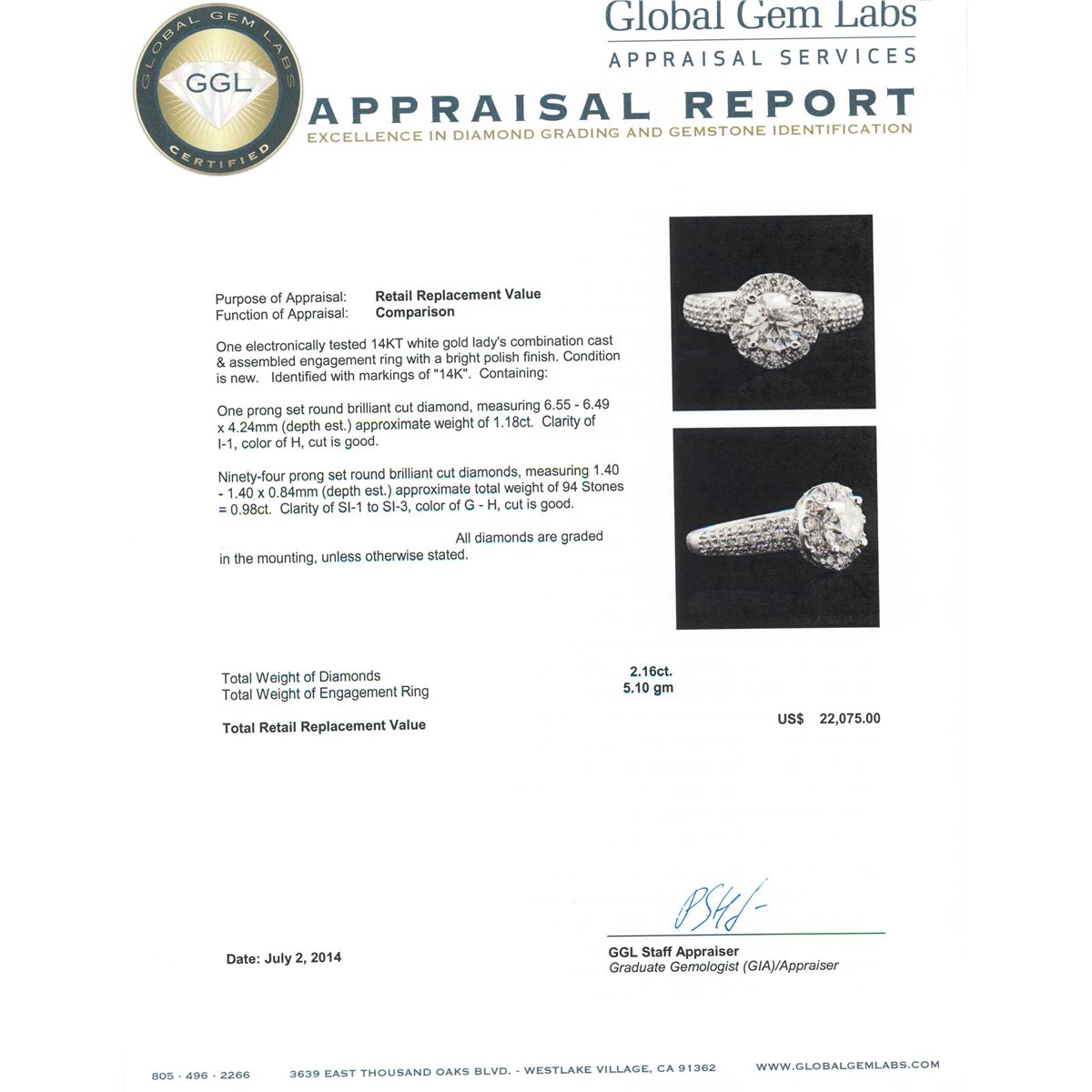 One electronically tested 14KT white gold Ladies combination cast & assembled engagement ring with a bright polish finish. Condition is new. Identified with markings of "14K". Containing: One prong set round brilliant cut diamond, measuring 6.55 - 6.49 x 4.24mm (depth est.) approximate weight of 1.18ct. Clarity: I-1. Color: H, Cut is Good. Ninety-Four prong set round brilliant cut diamonds, measuring 1.40 - 1.40 x 0.84mm (depth est.) approximate. Total Weight of 94 Stones = 0.98ct. Clarity: SI-1 to SI-3. Color: G - H, Cut is Good. EGL USA GEM ID# US 911348413D. All diamonds are graded in the mounting, unless otherwise stated. Total Weight of Diamonds 2.16ct. Total Weight of Engagement Ring 5.10 grams. GGL Appraised at $22,075.00.