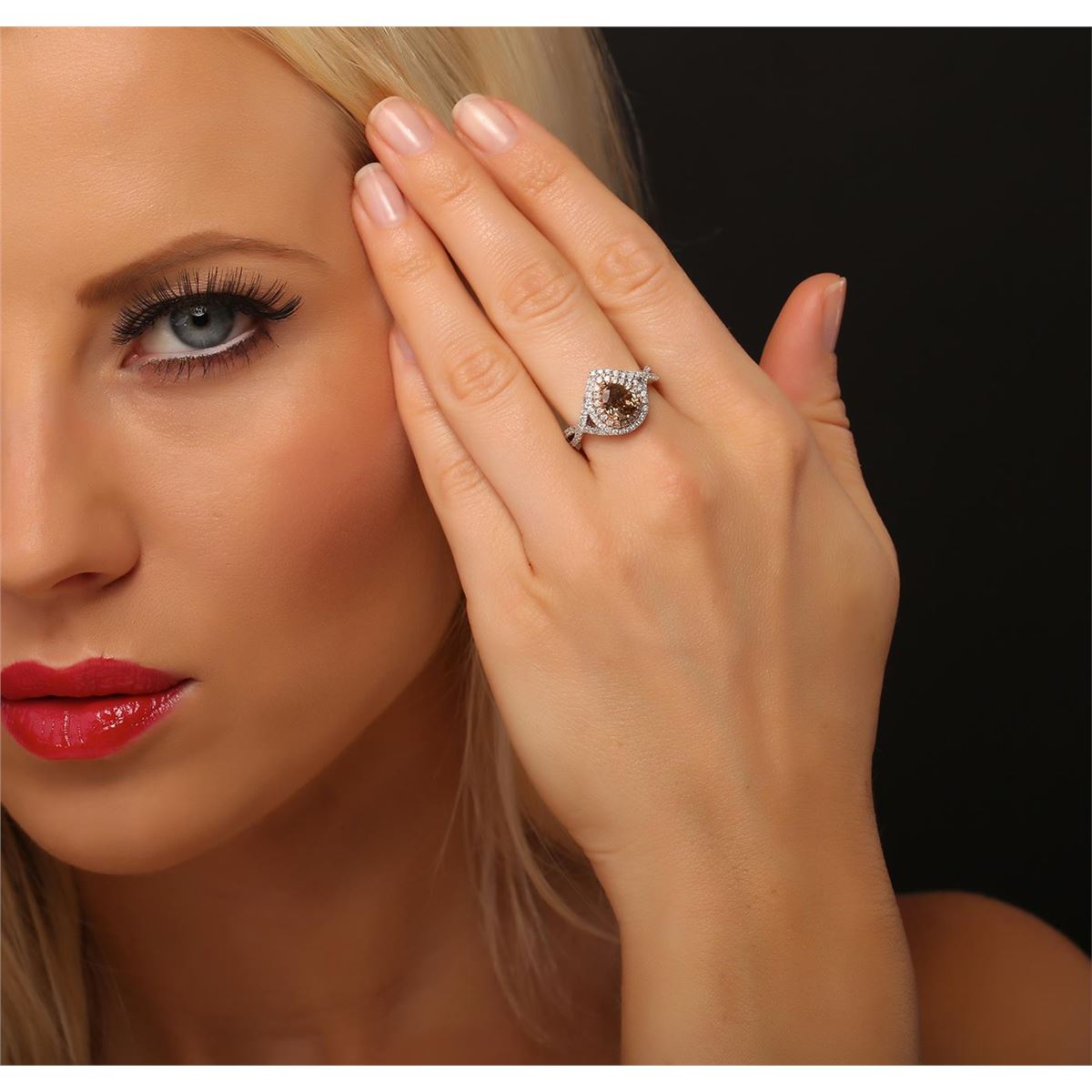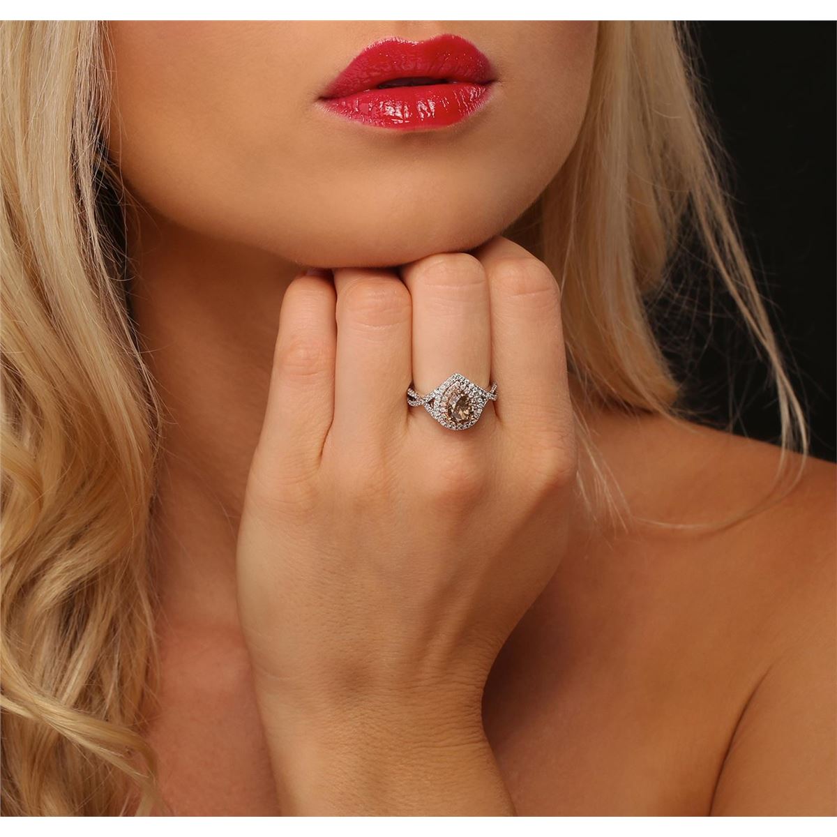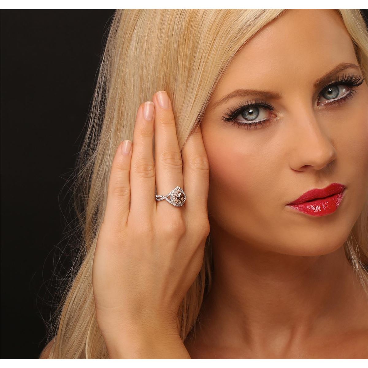 One electronically tested 14KT white gold ladies cast diamond ring. Condition is new, good workmanship. The featured diamond is set within tiered diamond bezels supported by intertwining diamond set shoulders, completed by a two and one-half millimeter wide band. Bright polish finish with rose gold accents. Trademark is CJ. Identified with markings of "14K". Containing: One prong set pear shaped cut diamond, measuring 7.60 x 6.10 x 4.20mm (depth est.), 20.00% GTCF approximate weight of 1.62ct. Graded in the setting. Clarity VS-2. Depth 68.9%. Table 59.0%. Eighty prong set round brilliant cut diamonds, measuring 1.20 - 1.10 x 0.69mm (depth est.) approximate total weight of 80 Stones = 0.54ct. Graded in the setting. Clarity SI-2 to I-2. Color G - I. Total Weight of Diamonds 2.16 ct. Total Weight of Ring 6.27 grams. AIG Appraised at $21,765.00.