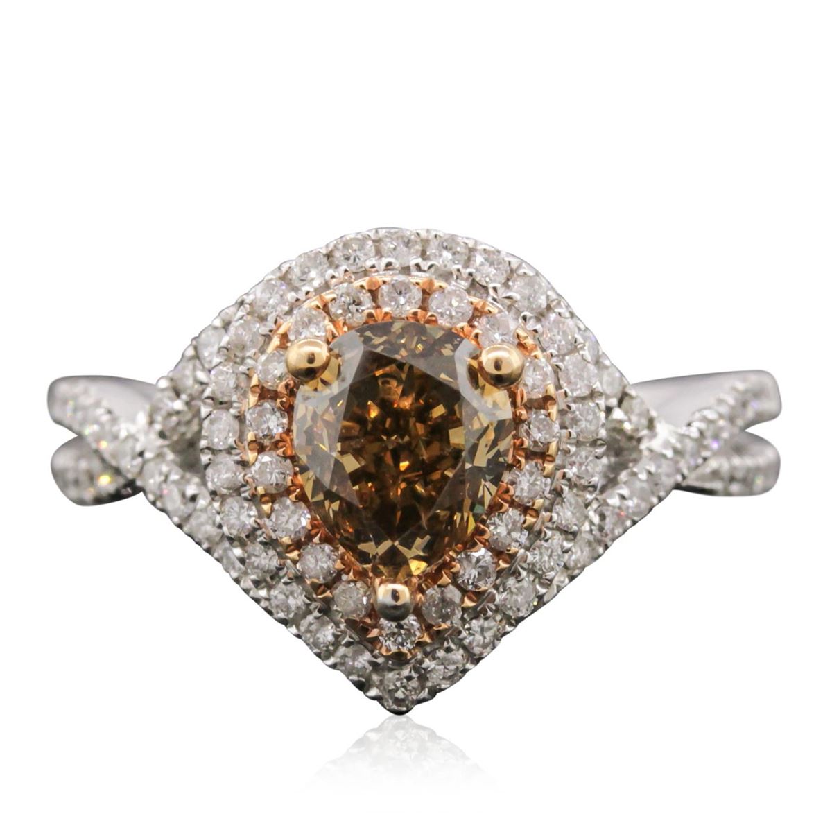 One electronically tested 14KT white gold ladies cast diamond ring. Condition is new, good workmanship. The featured diamond is set within tiered diamond bezels supported by intertwining diamond set shoulders, completed by a two and one-half millimeter wide band. Bright polish finish with rose gold accents. Trademark is CJ. Identified with markings of "14K". Containing: One prong set pear shaped cut diamond, measuring 7.60 x 6.10 x 4.20mm (depth est.), 20.00% GTCF approximate weight of 1.62ct. Graded in the setting. Clarity VS-2. Depth 68.9%. Table 59.0%. Eighty prong set round brilliant cut diamonds, measuring 1.20 - 1.10 x 0.69mm (depth est.) approximate total weight of 80 Stones = 0.54ct. Graded in the setting. Clarity SI-2 to I-2. Color G - I. Total Weight of Diamonds 2.16 ct. Total Weight of Ring 6.27 grams. AIG Appraised at $21,765.00.