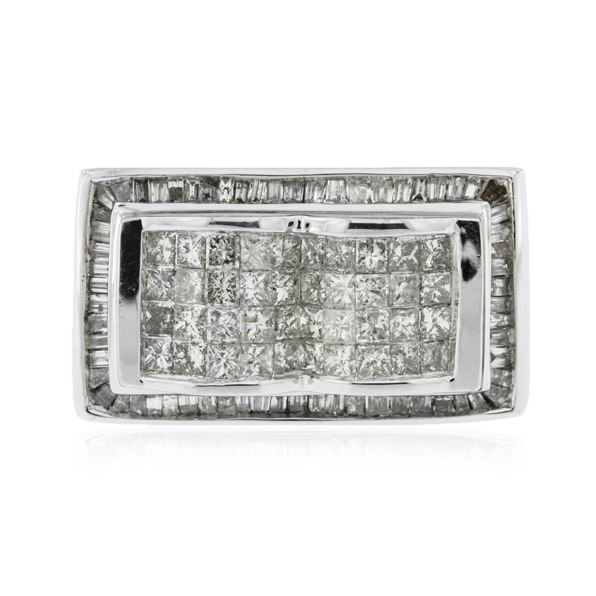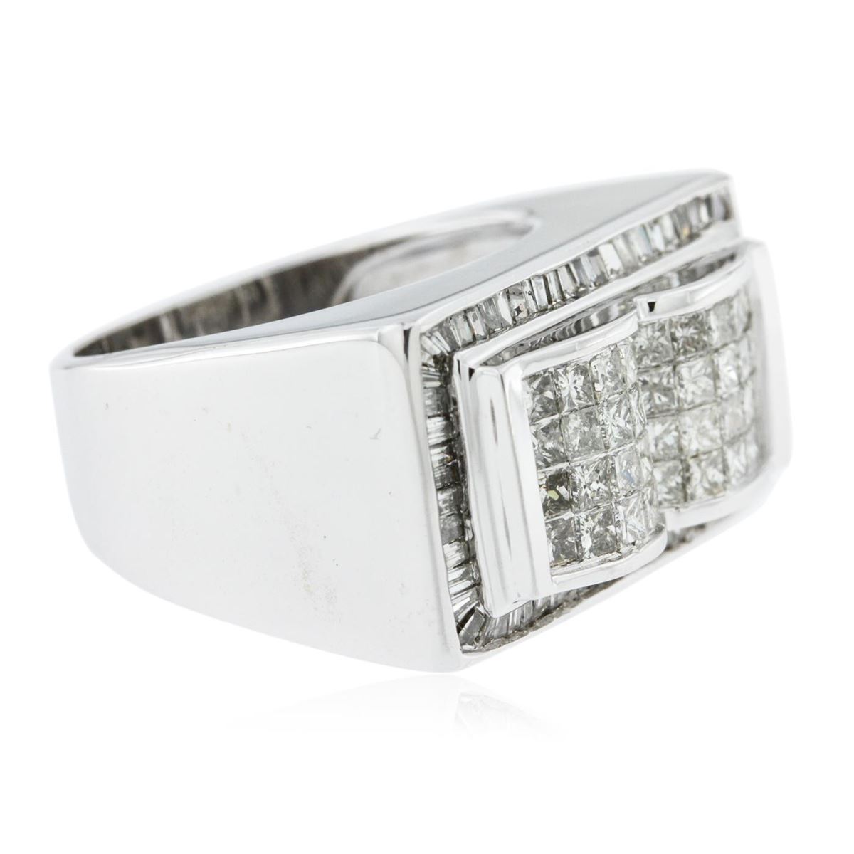 One electronically tested 14KT white gold man's combination cast & assembled ring with a bright polish finish. Condition is new. Identified with markings of "14K". Containing: Forty pave' set princess cut diamonds, measuring 2.00 x 1.70 x 1.28mm (depth est.) approximate. Total Weight of 40 Stones = 1.42ct. Clarity: SI-1 to I-1. Color: H - J, Cut is Good. Sixty-Four channel set baguette cut diamonds, measuring 1.50 x 1.00 x 0.85mm (depth est.) approximate. Total Weight of 64 Stones = 0.74ct. Clarity: SI-1 to I-1. Color: H - I, Cut is Good. Total Weight of Diamonds 2.17ct. Total Weight of Ring 21.50gm. GGL Appraised at $12,270.00.