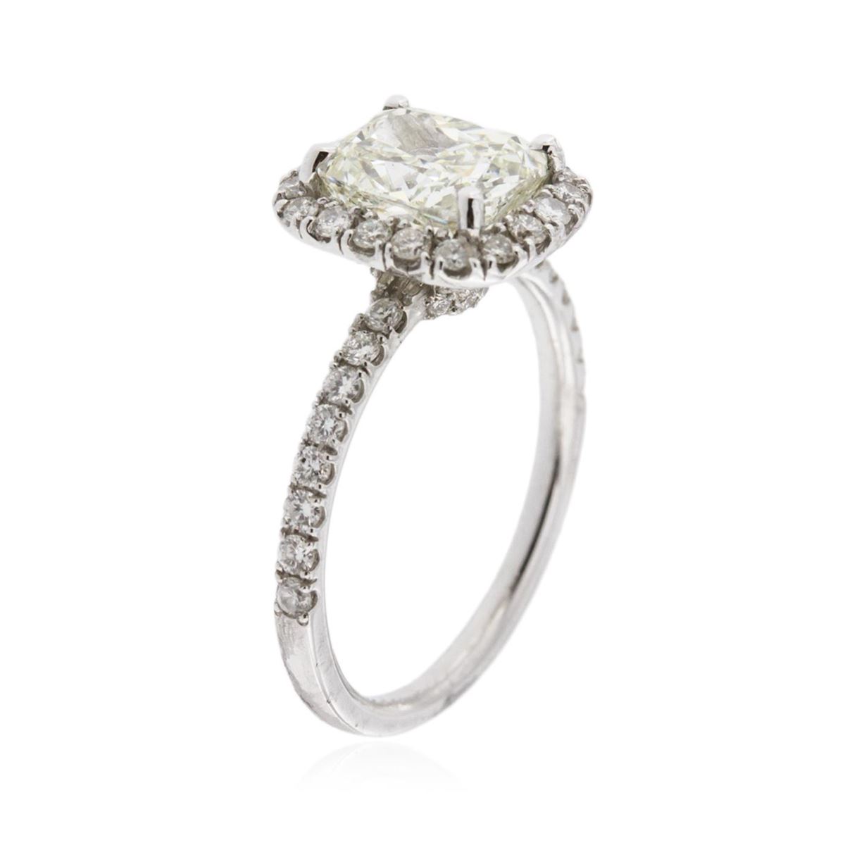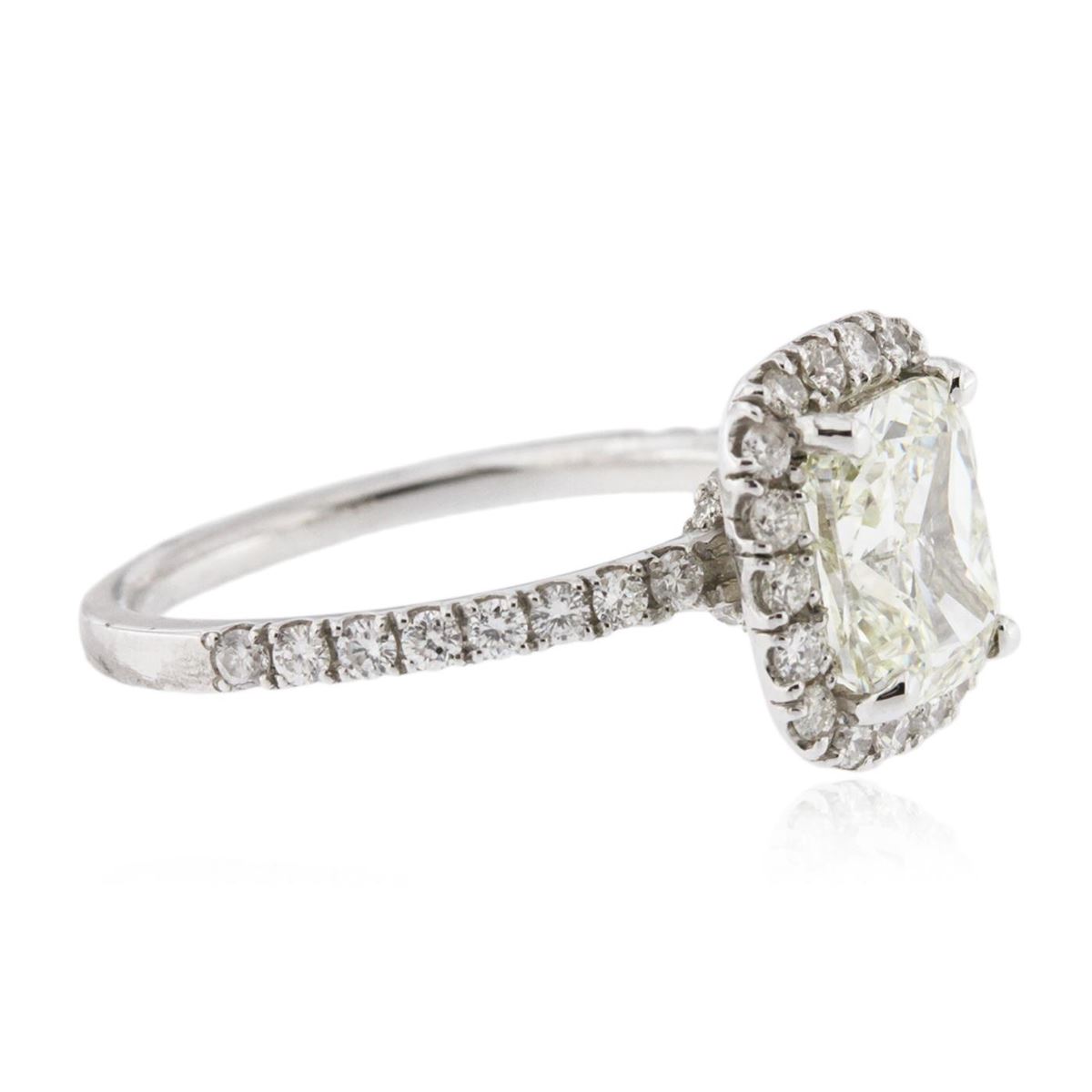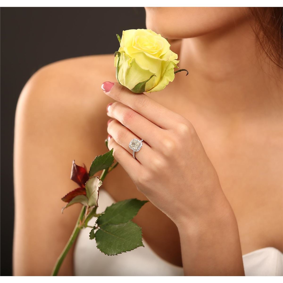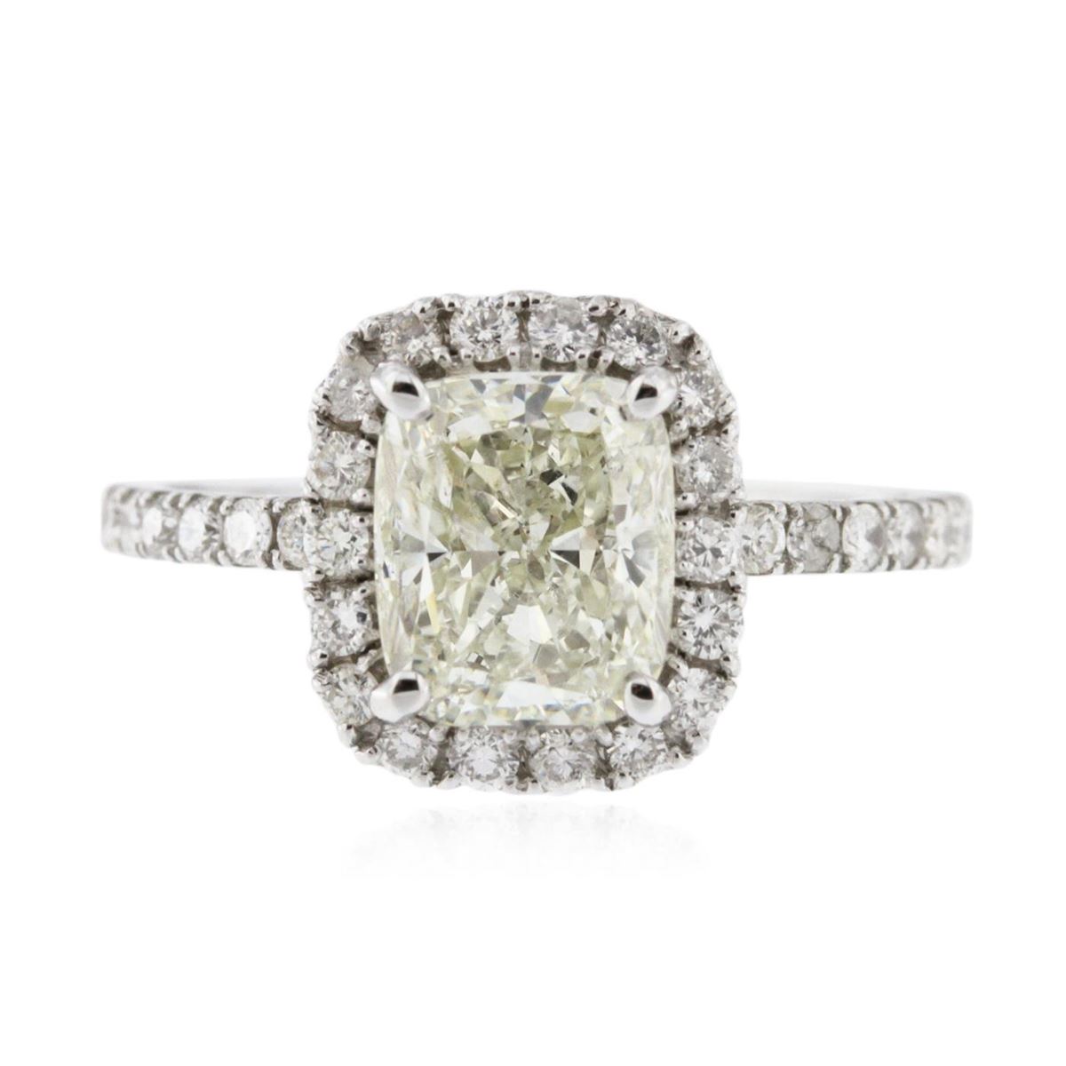 One electronically tested 14KT white gold ladies cast & assembled diamond unity ring with a bright polish finish. Condition is new, good workmanship. The featured diamond is set within a diamond is set within a diamond bezel supported by diamond set shoulders, completed by a one and one-half millimeter wide band. Identified with markings of "14K". Containing: One prong set cushion cut diamond, measuring 8.00 x 6.70 x 4.50mm (depth est.) approximate weight of 2.17ct. Diamond grading report attaché. Graded in the setting. Clarity I-1 to Color L. Depth 67.2%. Table 64.2%. Fifty-four prong set round brilliant cut diamonds, measuring 1.50 - 1.40 x 0.87mm (depth est.) approximate total weight of 54 stones = 0.61ct. Graded in the setting. Clarity SI-1 to I-1. Color G-I. Total weight of Diamonds 2.8ct. Total weight of Ring 2.98gm. AIG Appraised at $21,765.00.