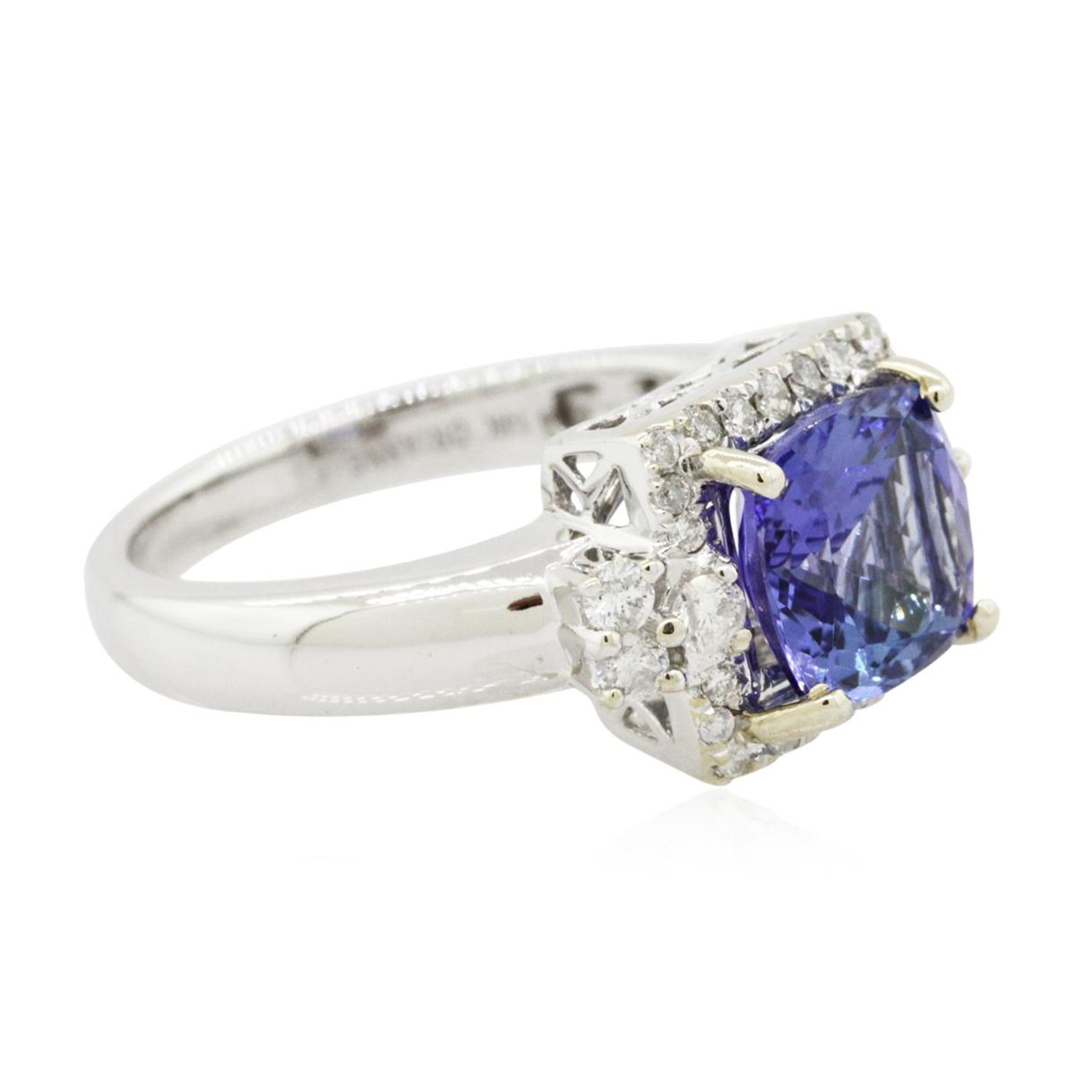 One electronically tested 14KT white gold ladies cast tanzanite & diamond ring with a bright finish. The featured tanzanite is set within a diamond bezel, supported by an elaborate white gold lattice under gallery, completed by a two and one half millimeter wide band. Trademark is ORIANNE. Identified with markings of "14K". Condition is new, very good workmanship. Containing: One prong set oval cut natural tanzanite, measuring 7.90 x 7.68 x 4.90mm, 9%. bulge factor, approximate weight of 2.17ct., clarity is eye clean, type I, medium dark, very slightly grayish, violetish blue color, (GIA vB 6/3), cut is good. Transmitting light with no distortion, transparent. Graded in the setting. Tanzanite is a very rare gemstone that is only found in the country of Tanzania. Originally discovered in 1967. Tiffany & Company, named the stone Tanzanite. It is found in the Usumburu Mountains that border the Umba Valley of northern Tanzania. Tanzanite occurs in gray, brown, violet, blue, reddish-purple, & green. The gem is interesting because of its exceptional pleochroism. Rotated in different directions a tanzanite will exhibit multiple changes of color. Tanzanite has a low tolerance to ultrasonic cleaning, and should not be cleaned using this method. Twenty-Eight prong set round brilliant cut diamonds, measuring 2.20 - 1.00. x 0.96mm (depth est.) approximate total weight of 28 Stones = 0.35ct. Graded in the setting. Clarity: SI-2 to I-2 . Color: H - I. Total Weight of Colored Stones 2.17ct. Total Weight of Diamonds 0.35ct. Total Weight of Ring 5.64 grams. AIG Appraised at $6,400.00.