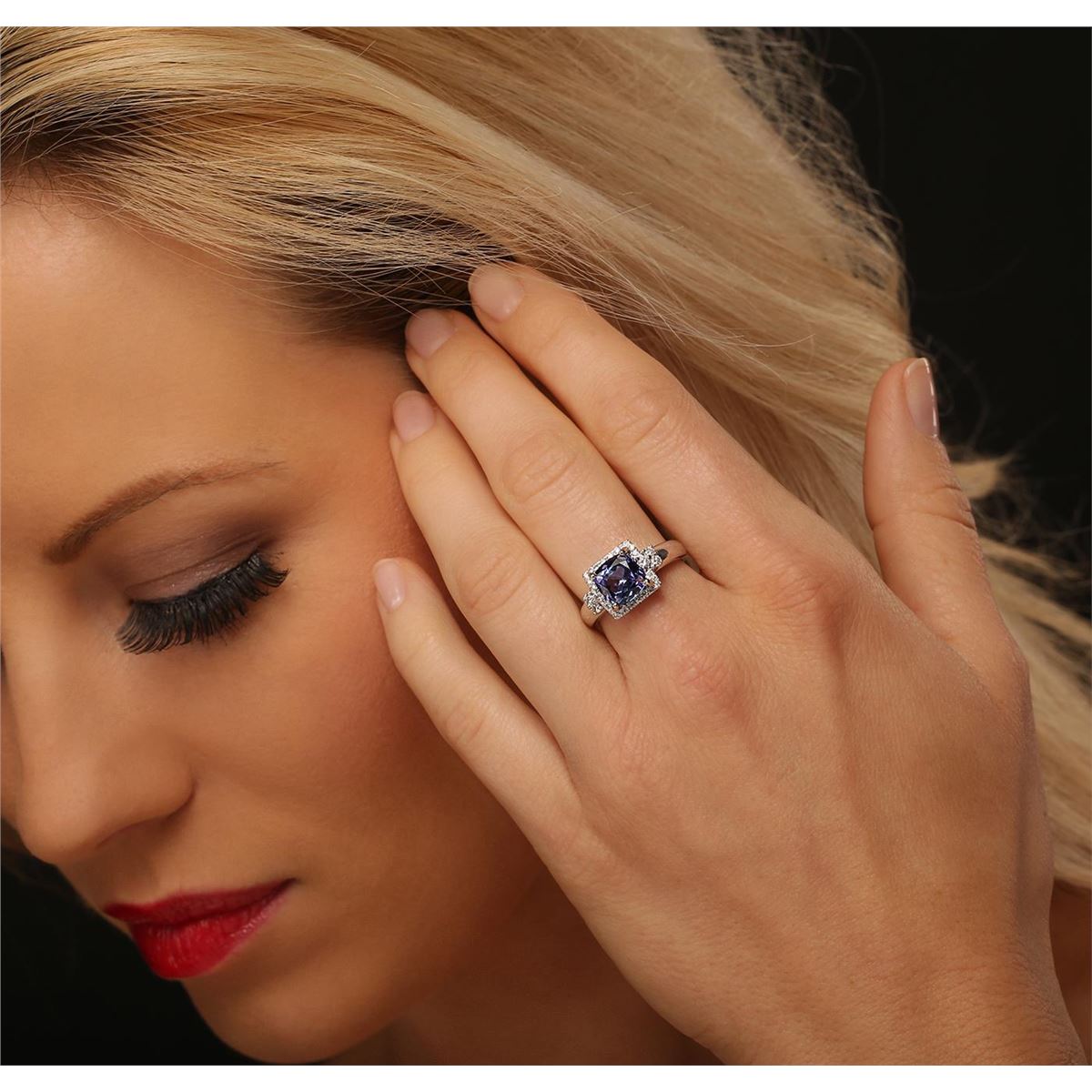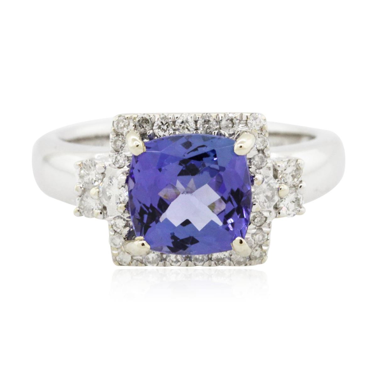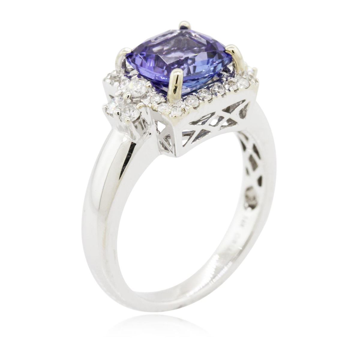 One electronically tested 14KT white gold ladies cast tanzanite & diamond ring with a bright finish. The featured tanzanite is set within a diamond bezel, supported by an elaborate white gold lattice under gallery, completed by a two and one half millimeter wide band. Trademark is ORIANNE. Identified with markings of "14K". Condition is new, very good workmanship. Containing: One prong set oval cut natural tanzanite, measuring 7.90 x 7.68 x 4.90mm, 9%. bulge factor, approximate weight of 2.17ct., clarity is eye clean, type I, medium dark, very slightly grayish, violetish blue color, (GIA vB 6/3), cut is good. Transmitting light with no distortion, transparent. Graded in the setting. Tanzanite is a very rare gemstone that is only found in the country of Tanzania. Originally discovered in 1967. Tiffany & Company, named the stone Tanzanite. It is found in the Usumburu Mountains that border the Umba Valley of northern Tanzania. Tanzanite occurs in gray, brown, violet, blue, reddish-purple, & green. The gem is interesting because of its exceptional pleochroism. Rotated in different directions a tanzanite will exhibit multiple changes of color. Tanzanite has a low tolerance to ultrasonic cleaning, and should not be cleaned using this method. Twenty-Eight prong set round brilliant cut diamonds, measuring 2.20 - 1.00. x 0.96mm (depth est.) approximate total weight of 28 Stones = 0.35ct. Graded in the setting. Clarity: SI-2 to I-2 . Color: H - I. Total Weight of Colored Stones 2.17ct. Total Weight of Diamonds 0.35ct. Total Weight of Ring 5.64 grams. AIG Appraised at $6,400.00.