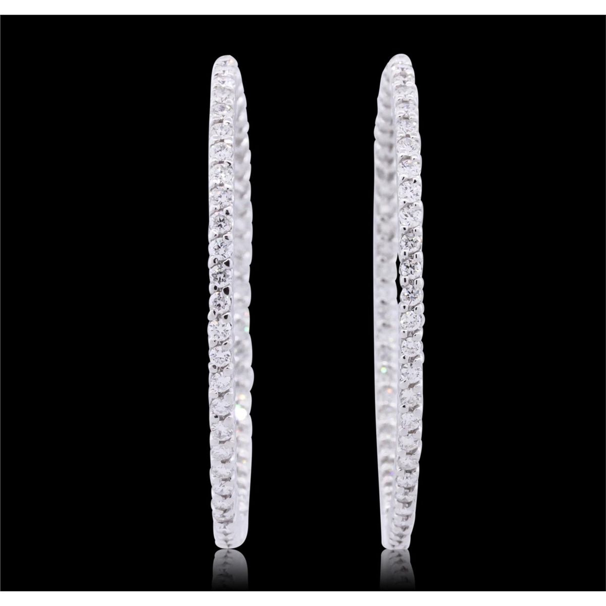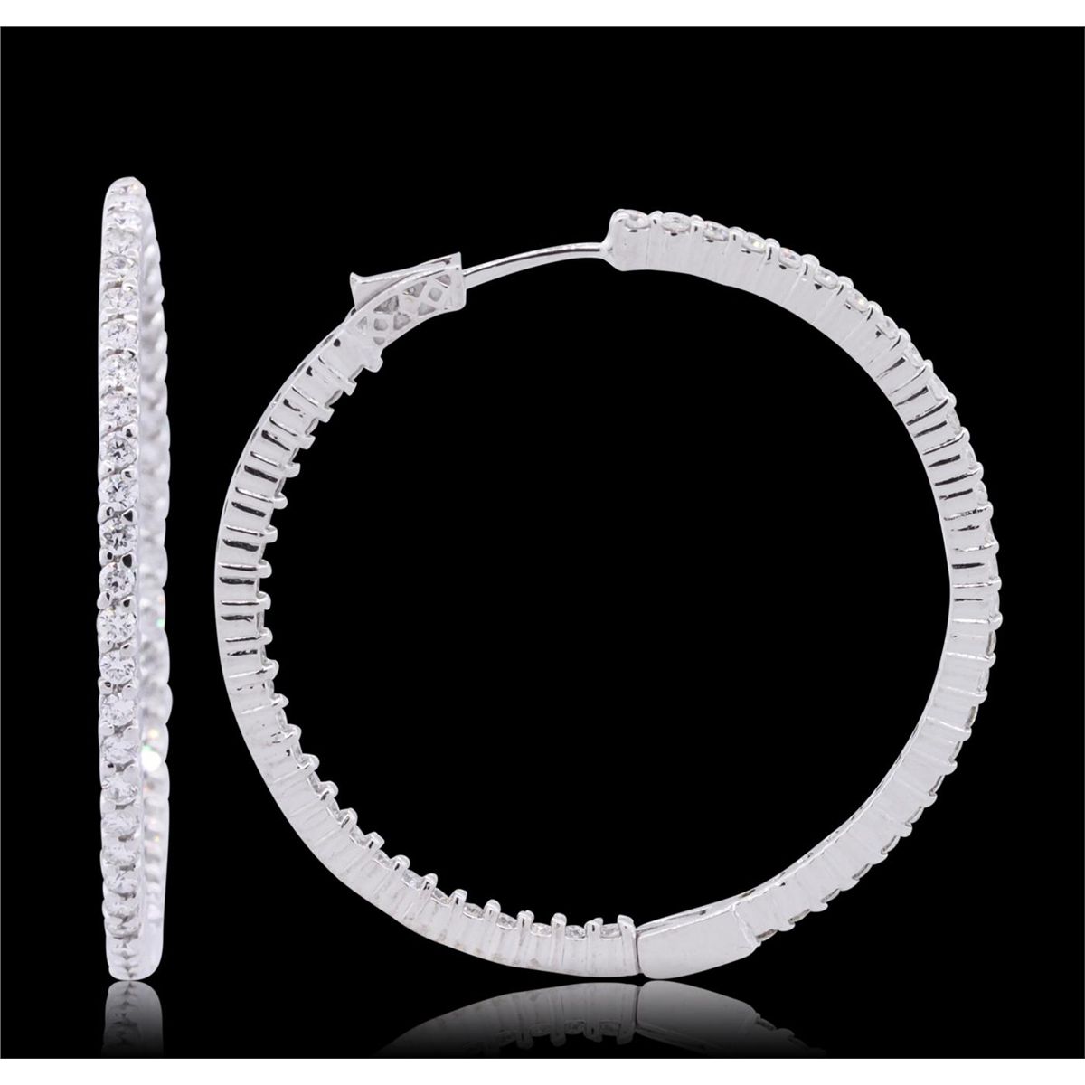 One pair electronically tested 14KT white gold ladies combination cast & assembled hoop earrings with hinged clip backs with a bright polish finish. Condition is new. Containing: One Hundred Two prong set round brilliant cut diamonds, measuring 1.80 - 1.80 x 1.08mm (depth est.) approximate total weight of 102 Stones = 2.17ct. Clarity: SI-2 to I-1. Color: H - J, Cut is Good. All diamonds are graded in the mounting, unless otherwise stated. Total Weight of Diamonds 2.17ct. Total Weight of Earrings 17.40 grams. GGL Appraised at $8,345.00.