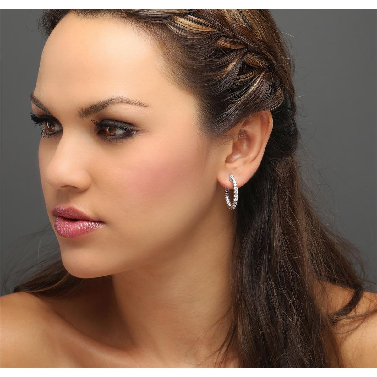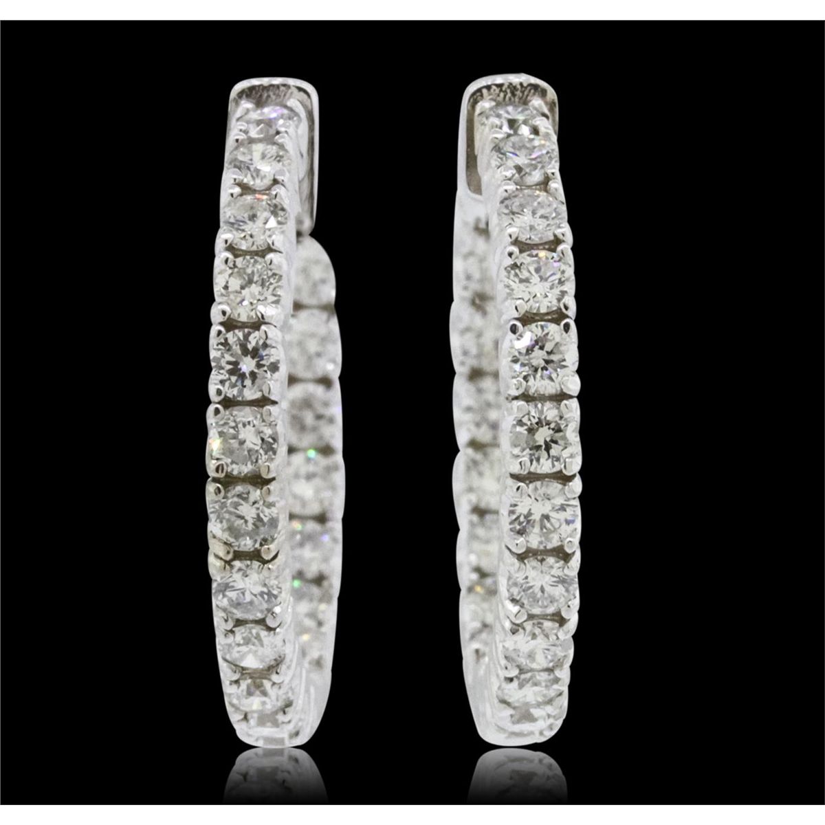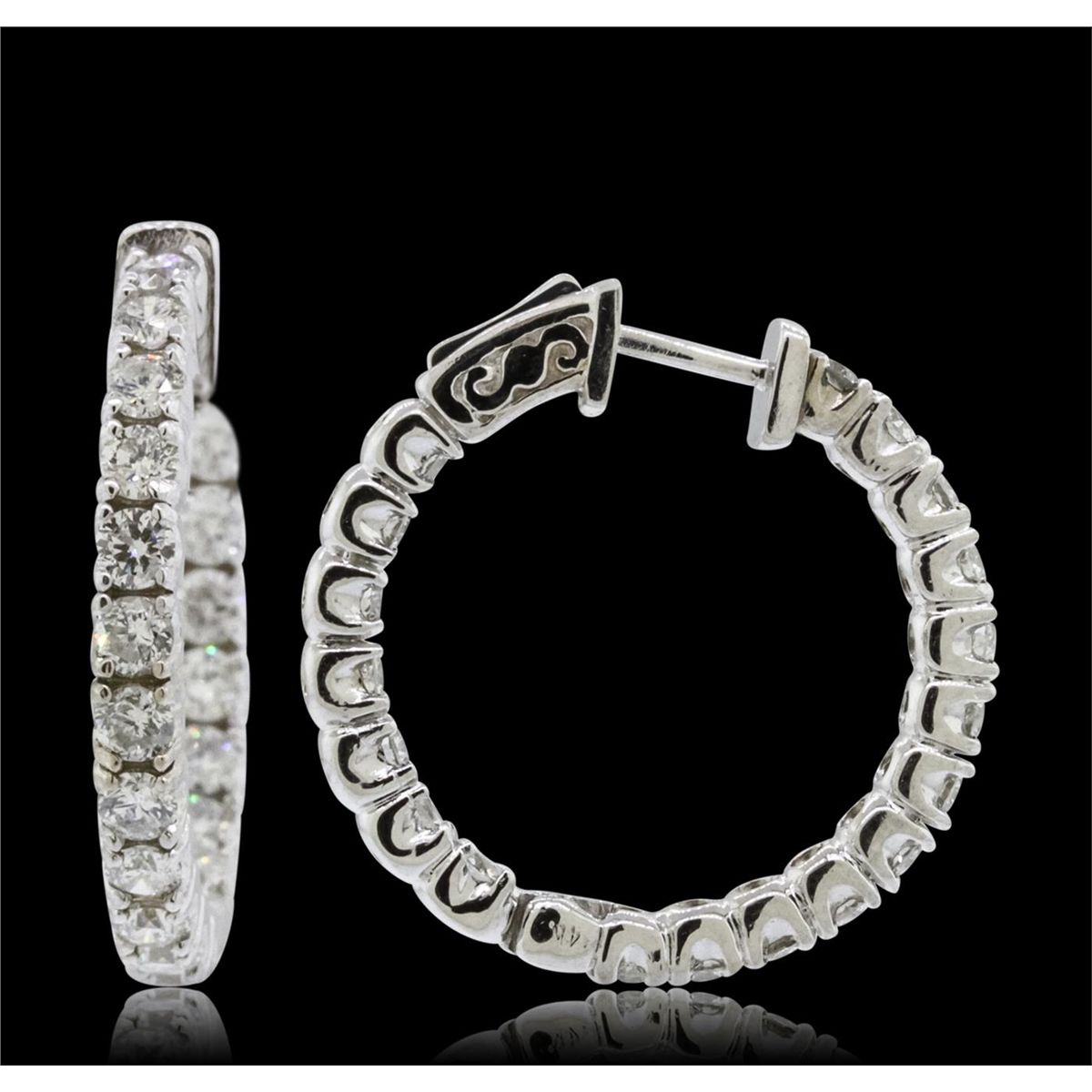 One pair electronically tested 14KT white gold ladies combination cast & assembled hoop earrings with hinged clip backs with a bright polish finish. Identified with markings of "14K". Condition is new. Containing: Thirty-Eight prong set round brilliant cut diamonds, measuring 2.50 - 2.50 x 1.50mm (depth est.) approximate total weight of 38 Stones = 2.17ct. Clarity: SI-2 to I-1. Color: I - J, Cut is Good. All diamonds are graded in the mounting, unless otherwise stated. Total Weight of Diamonds 2.17ct. Total Weight of Earrings 9.00 grams. GGL Appraised at $7,725.00.