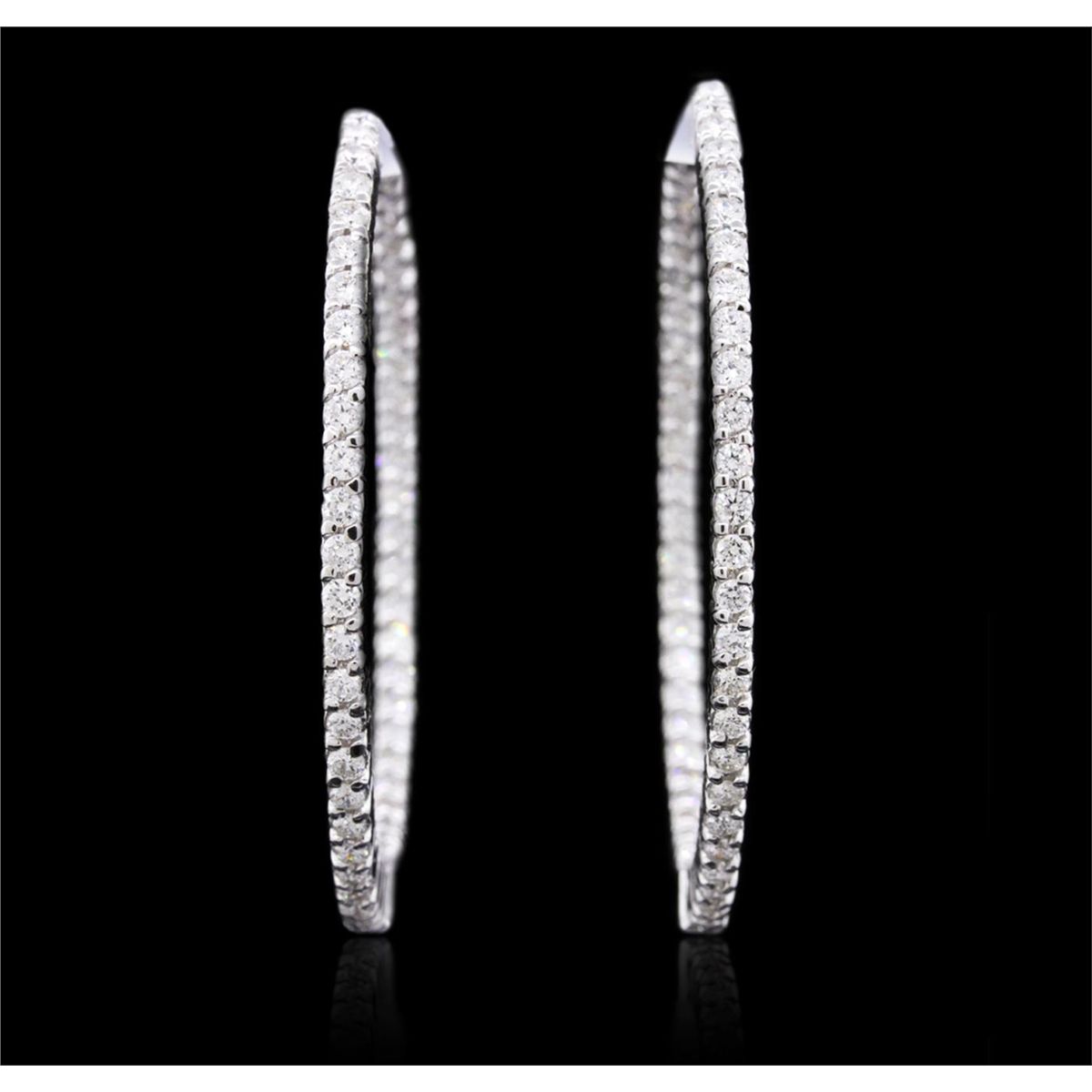 One pair electronically tested 14KT white gold ladies combination cast & assembled hoop earrings with hinged clip backs with a bright polish finish. Condition is new. Containing: One Hundred Two prong set round brilliant cut diamonds, measuring 1.80 - 1.80 x 1.08mm (depth est.) approximate total weight of 102 Stones = 2.17ct. Clarity: SI-2 to I-1. Color: H - J, Cut is Good. All diamonds are graded in the mounting, unless otherwise stated. Total Weight of Diamonds 2.17ct. Total Weight of Earrings 17.40 grams. GGL Appraised at $8,345.00.