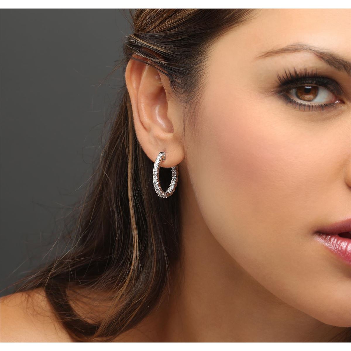 One pair electronically tested 14KT white gold ladies combination cast & assembled hoop earrings with hinged clip backs with a bright polish finish. Identified with markings of "14K". Condition is new. Containing: Thirty-Eight prong set round brilliant cut diamonds, measuring 2.50 - 2.50 x 1.50mm (depth est.) approximate total weight of 38 Stones = 2.17ct. Clarity: SI-2 to I-1. Color: I - J, Cut is Good. All diamonds are graded in the mounting, unless otherwise stated. Total Weight of Diamonds 2.17ct. Total Weight of Earrings 9.00 grams. GGL Appraised at $7,725.00.