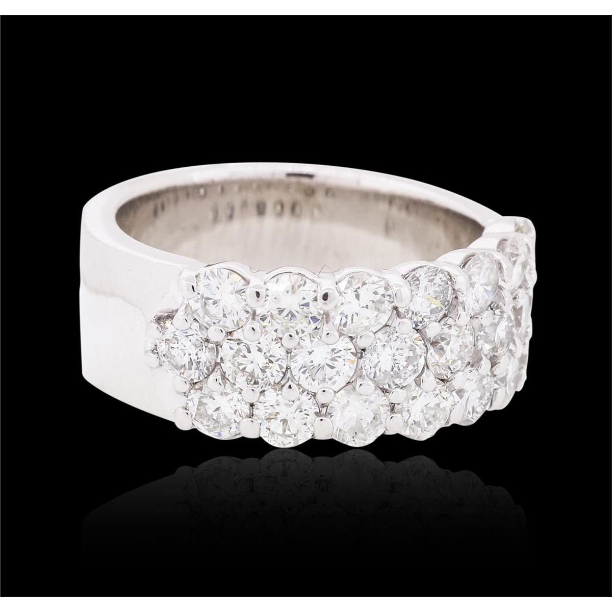 One electronically tested 14KT white gold ladies cast diamond ring with a flat shank with a bright polish finish. Identified with markings of "14K". Condition is new. Containing: Twenty-Two prong set round brilliant cut diamonds, measuring 3.00 - 3.00 x 1.80mm (depth est.) approximate total weight of 22 Stones = 2.17ct. Clarity: SI-2 to I-1. Color: I - J, Cut is Good. All diamonds are graded in the mounting, unless otherwise stated. Total Weight of Diamonds 2.17ct. Total Weight of Ring 9.40 grams. GGL Appraised at $6,345.00.