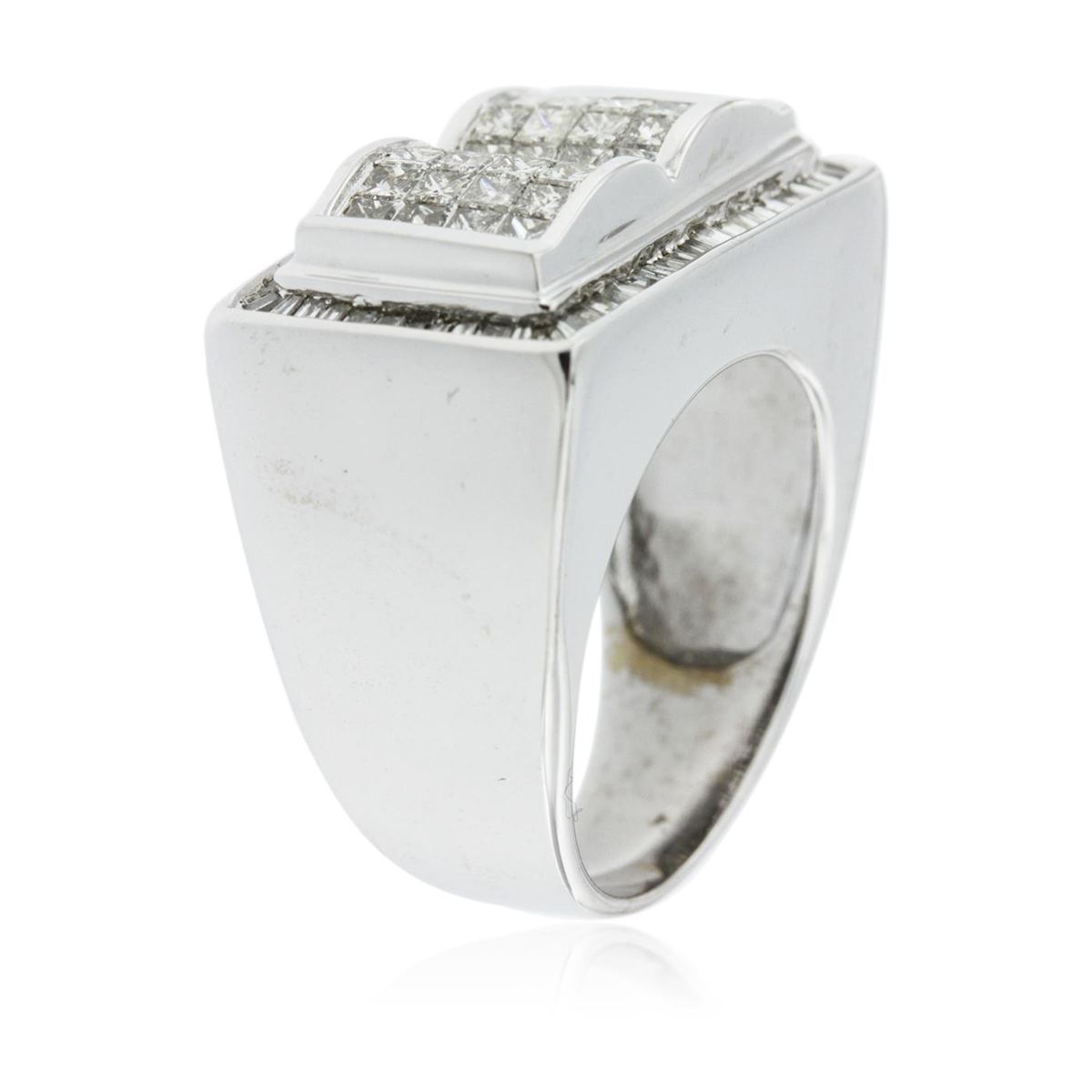 One electronically tested 14KT white gold man's combination cast & assembled ring with a bright polish finish. Condition is new. Identified with markings of "14K". Containing: Forty pave' set princess cut diamonds, measuring 2.00 x 1.70 x 1.28mm (depth est.) approximate. Total Weight of 40 Stones = 1.42ct. Clarity: SI-1 to I-1. Color: H - J, Cut is Good. Sixty-Four channel set baguette cut diamonds, measuring 1.50 x 1.00 x 0.85mm (depth est.) approximate. Total Weight of 64 Stones = 0.74ct. Clarity: SI-1 to I-1. Color: H - I, Cut is Good. Total Weight of Diamonds 2.17ct. Total Weight of Ring 21.50gm. GGL Appraised at $12,270.00.