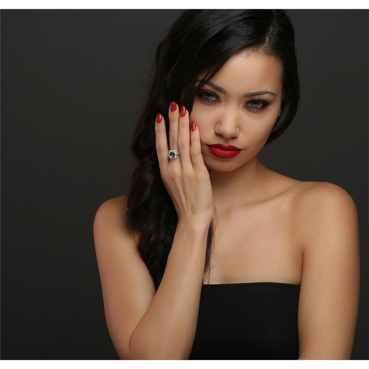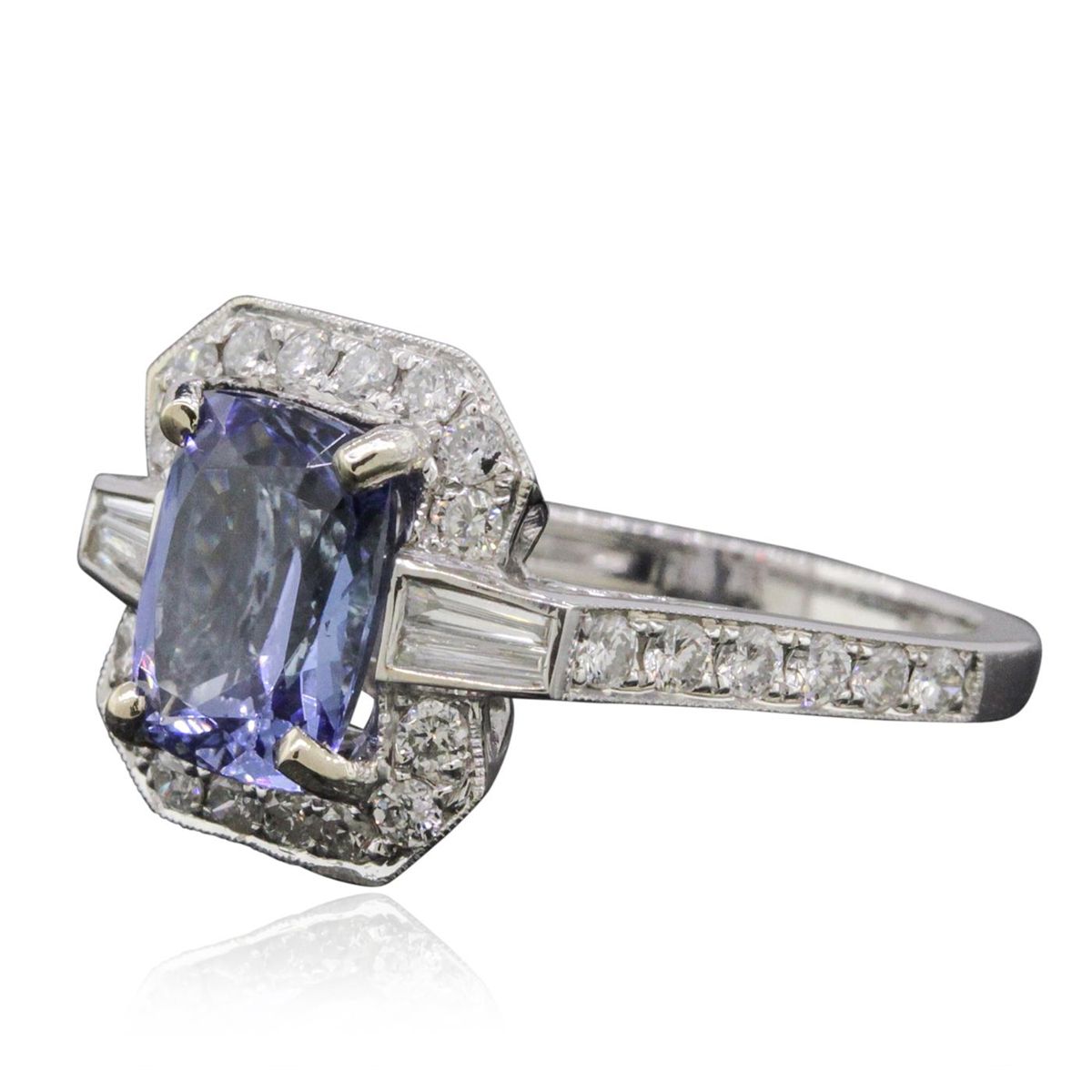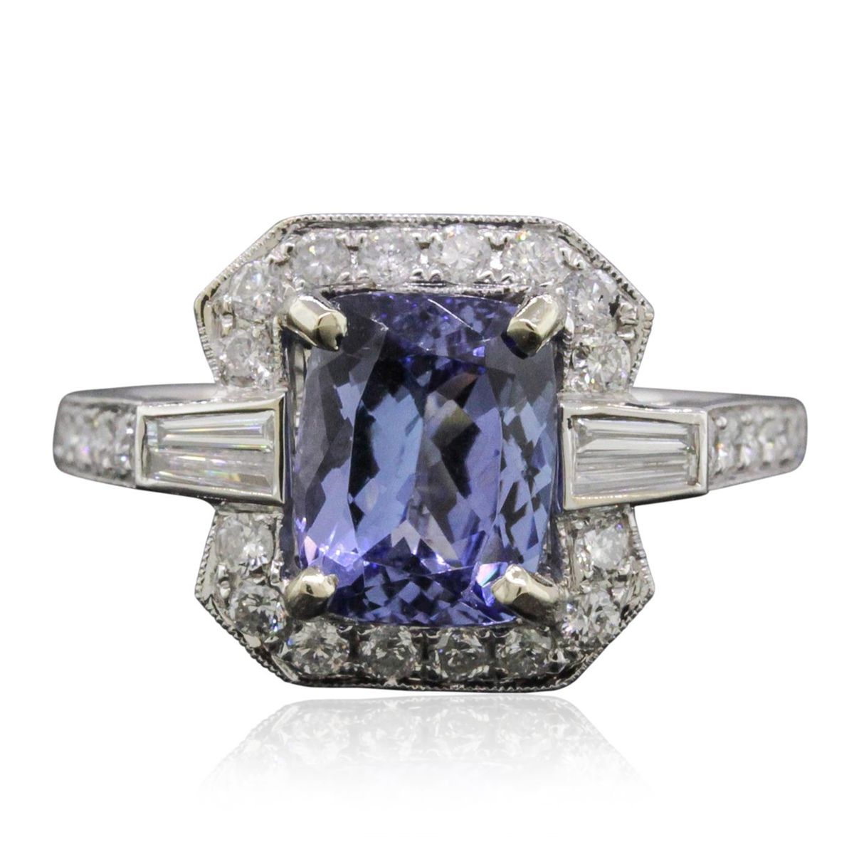 One electronically tested 14KT white gold ladies combination cast & assembled tanzanite and diamond ring with a flat shank with a bright polish finish. Identified with markings of "14K". Condition is new. Containing: One prong set rectangular cushion modified brilliant cut natural tanzanite, measuring 9.05 x 6.88 x 4.45mm, approximate weight of 2.18ct., clarity is eye clean, type I, medium, very slightly grayish, violet color, (GIA V 5/3), cut is good. Twenty-Six prong set round brilliant cut diamonds, measuring 1.50 - 1.50 x 0.90mm (depth est.) approximate total weight of 26 Stones = 0.32ct. Clarity: SI-1 to I-1. Color: I - J, Cut is Good. Four channel set baguette cut (tapered) diamonds, measuring 4.00 x 1.10 x 0.94mm (depth est.) approximate total weight of 4 Stones = 0.15ct. Clarity: VS-2. Color: I, Cut is Good. Colored gemstones are presumed to have been subjected to commonly used enhancement processes. All diamonds and colored gemstones are graded in the mounting, unless otherwise stated. Total Weight of Colored Stones 2.18ct. Total Weight of Diamonds 0.47ct. Total Weight of Ring 4.40 grams. GGL Appraised at $6,215.00.