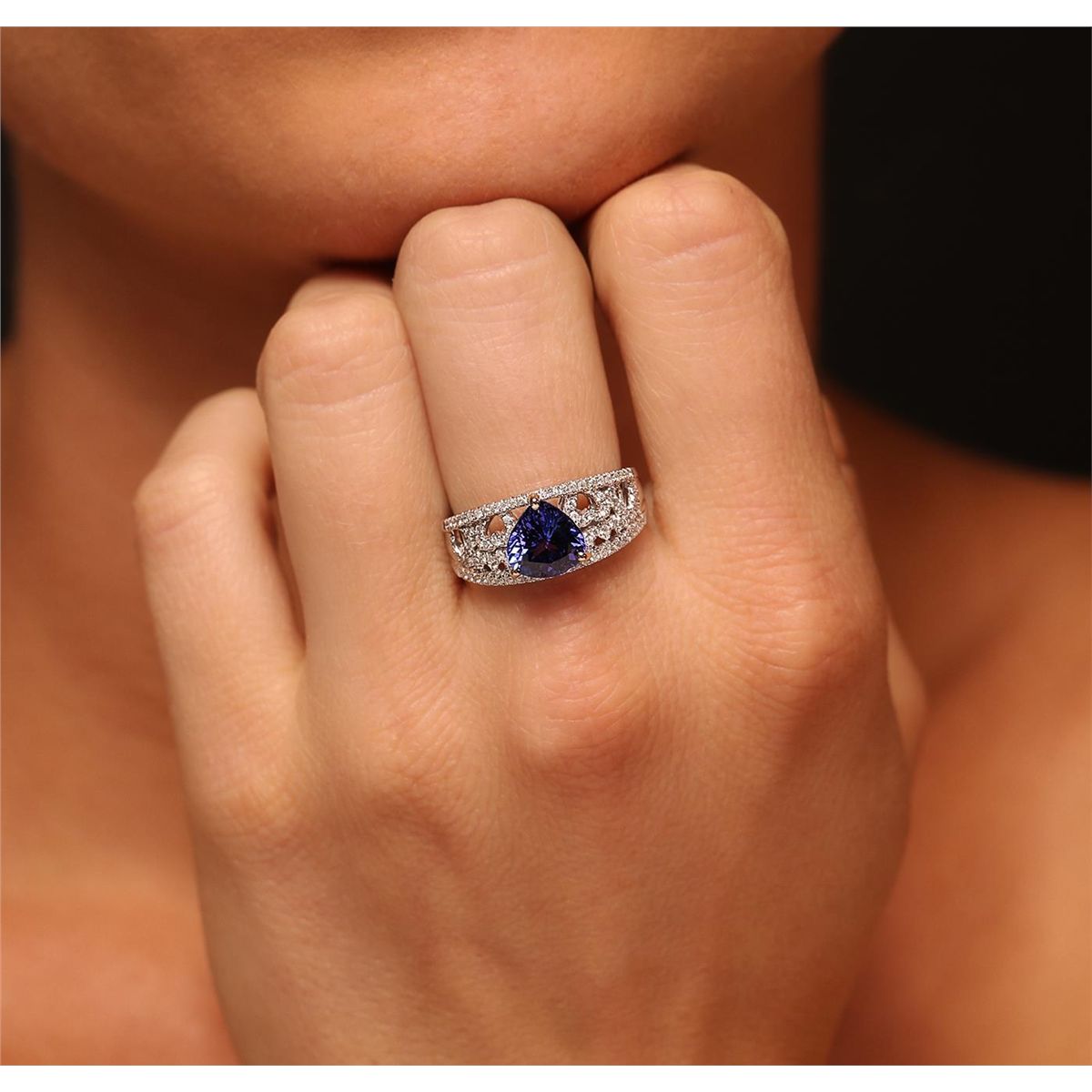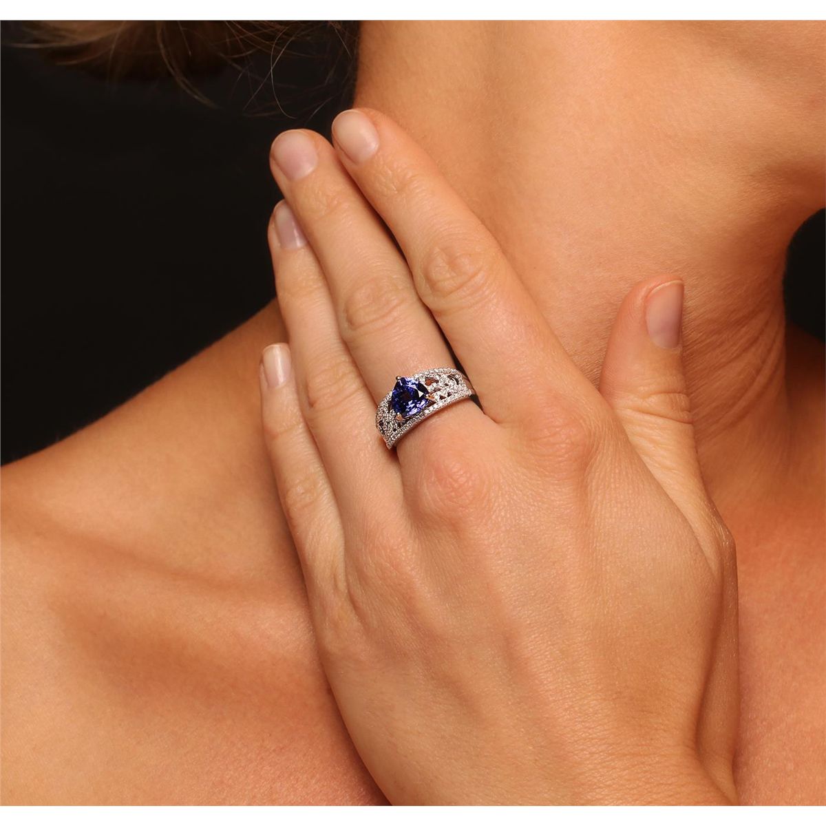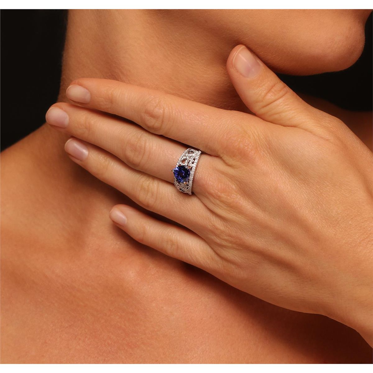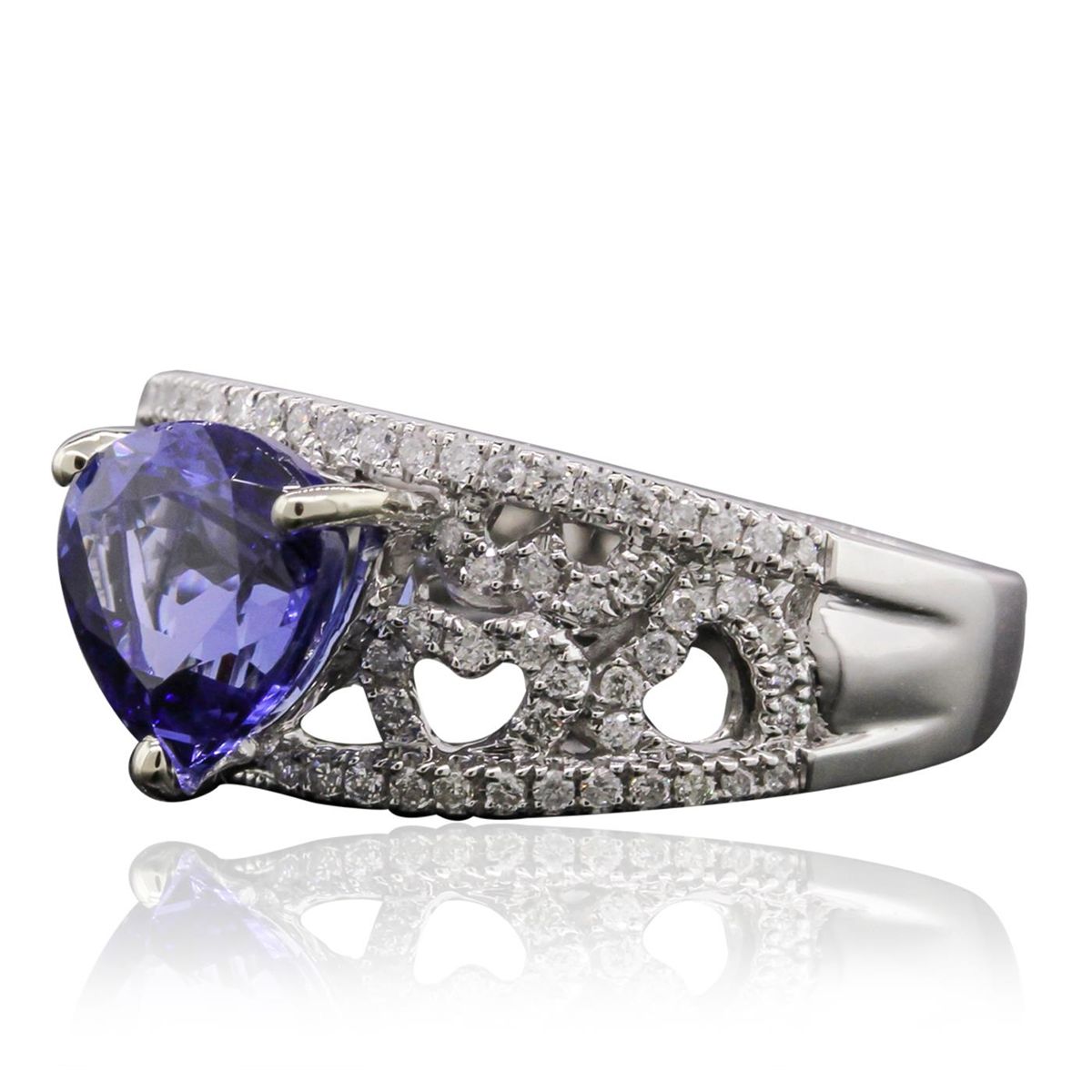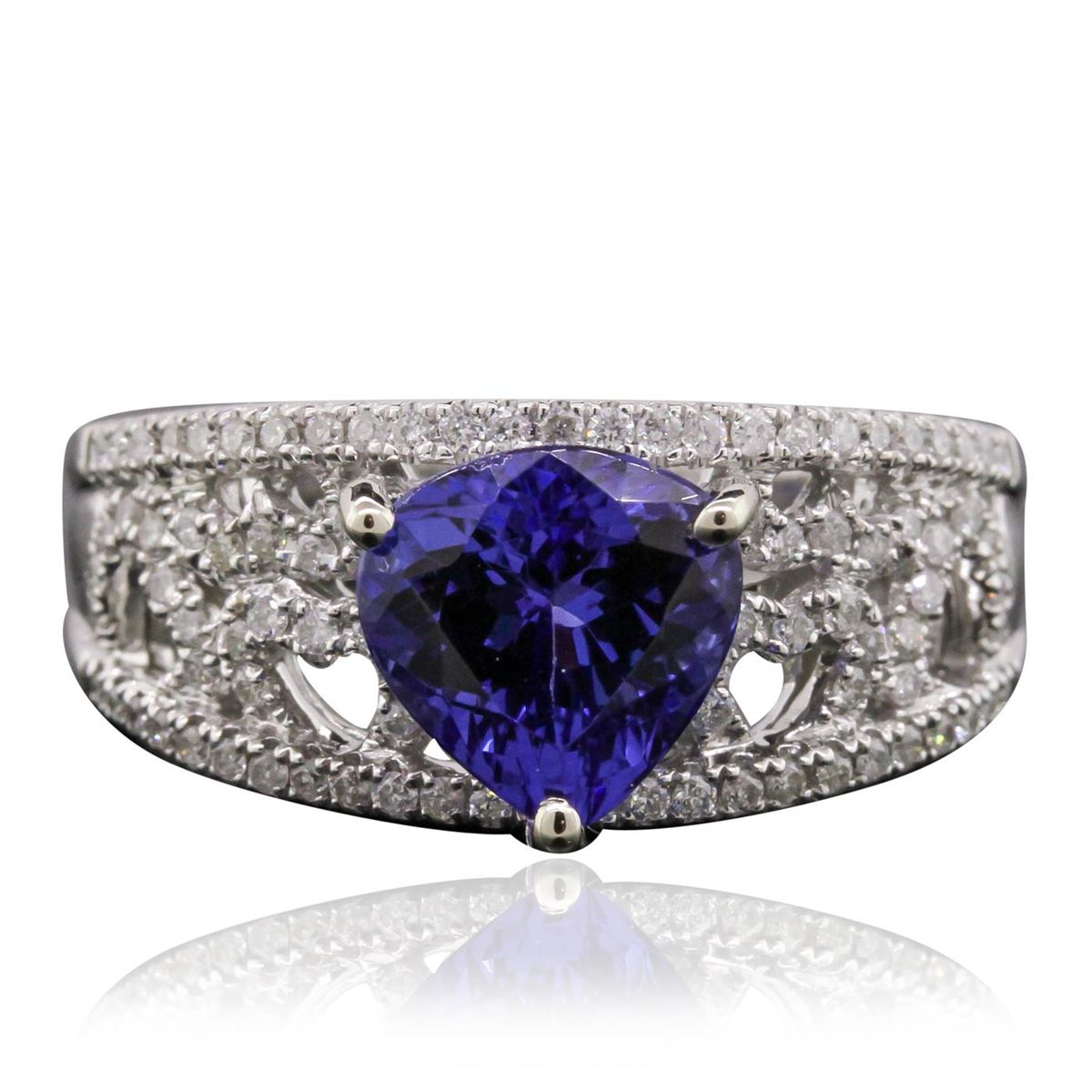 One electronically tested 14KT white gold Ladies combination cast & assembled ring with a bright polish finish. Condition is new. Identified with markings of "14K". Containing: Ninety bead set round brilliant cut diamonds, measuring 0.90 - 0.90 x 0.54mm (depth est.) approximate. Total Weight of 90 Stones = 0.40ct. Clarity: I-1 to I-2. Color: H - I, Cut is Good. One prong set pear modified mixed cut natural tanzanite, measuring 8.00 x 8.00 x 5.20mm, approximate weight of 2.18ct., clarity is eye clean, medium, moderately strong, violetish blue color, (GIA vB 5/4), cut is good. Colored gemstones are presumed to have been subjected to commonly used color/clarity enhancement processes. Total Weight of Colored Stones 2.18ct. Total Weight of Diamonds 0.40ct. Total Weight of Ring 5.40 grams. GGL Appraised at $5,475.00.