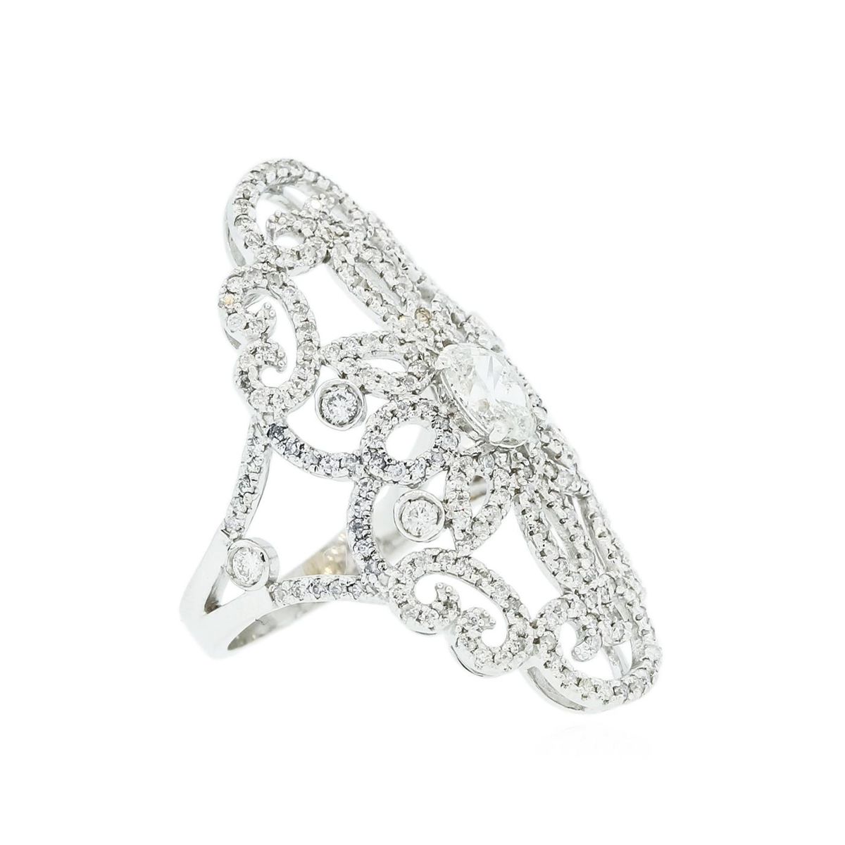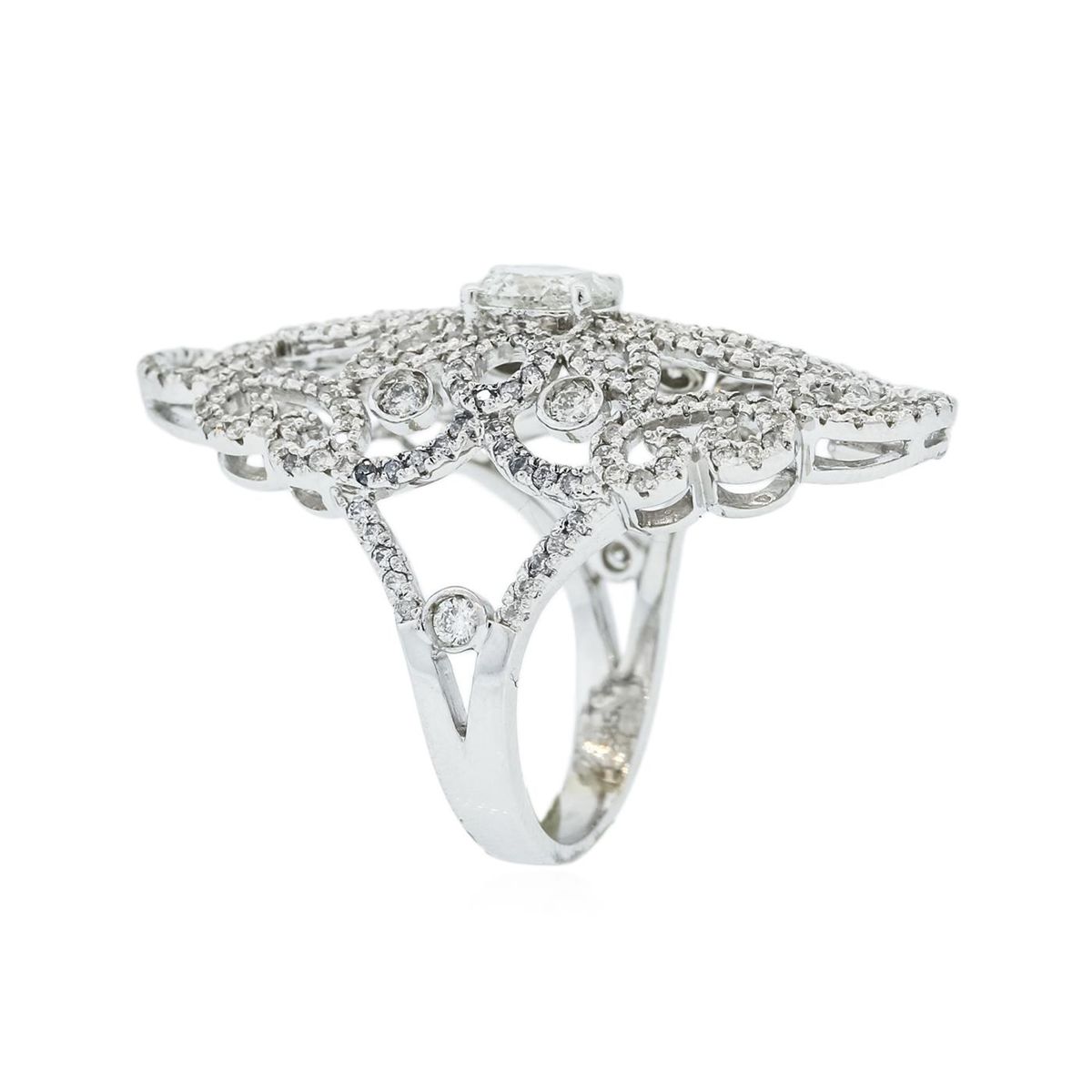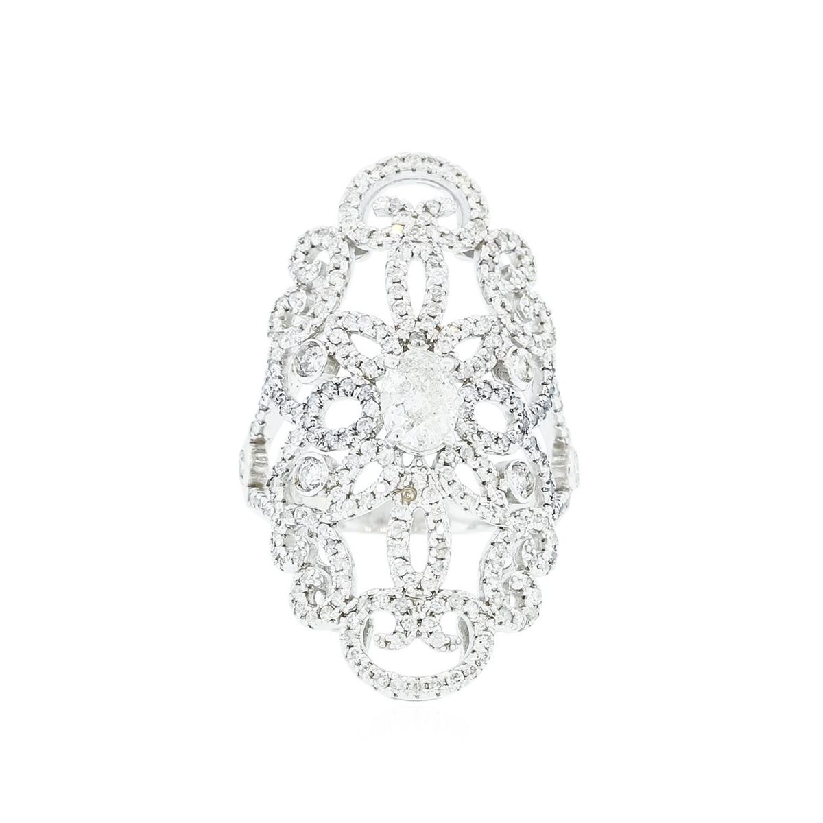 One electronically tested 14KT white gold ladies cast diamond engagement ring with a bright polish finish. Identified with markings of "585". Condition is new. Containing: One prong set round brilliant cut diamond, measuring 6.20 - 4.50 x 3.21mm (depth est.) approximate weight of 0.56ct. Clarity: I-2. Color: K, Cut is Good. Six bezel set round brilliant cut diamonds, measuring 1.90 - 1.90 x 1.14mm (depth est.) approximate total weight of 6 Stones = 0.15ct. Clarity: I-1. Color: K, Cut is Good. Two Hundred Forty prong set round brilliant cut diamonds, measuring 1.00 - 1.00 x 1.00mm (depth est.) approximate total weight of 240 Stones = 1.46ct. Clarity: I-1 to I-2. Color: H - I, Cut is Good. All diamonds are graded in the mounting, unless otherwise stated. Total Weight of Diamonds 2.18ct. Total Weight of Ring 8.30 grams. GGL Appraised at $7,590.00.
