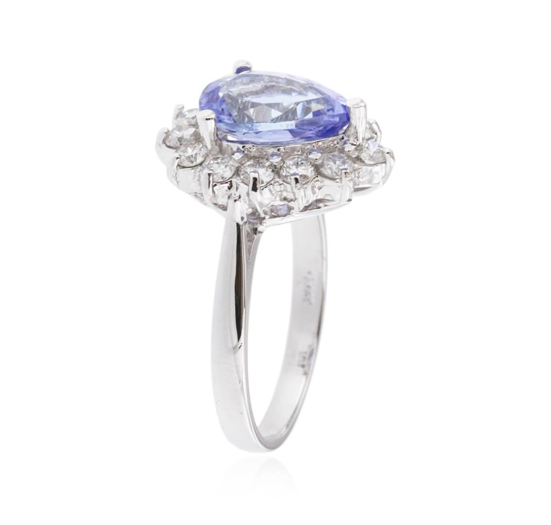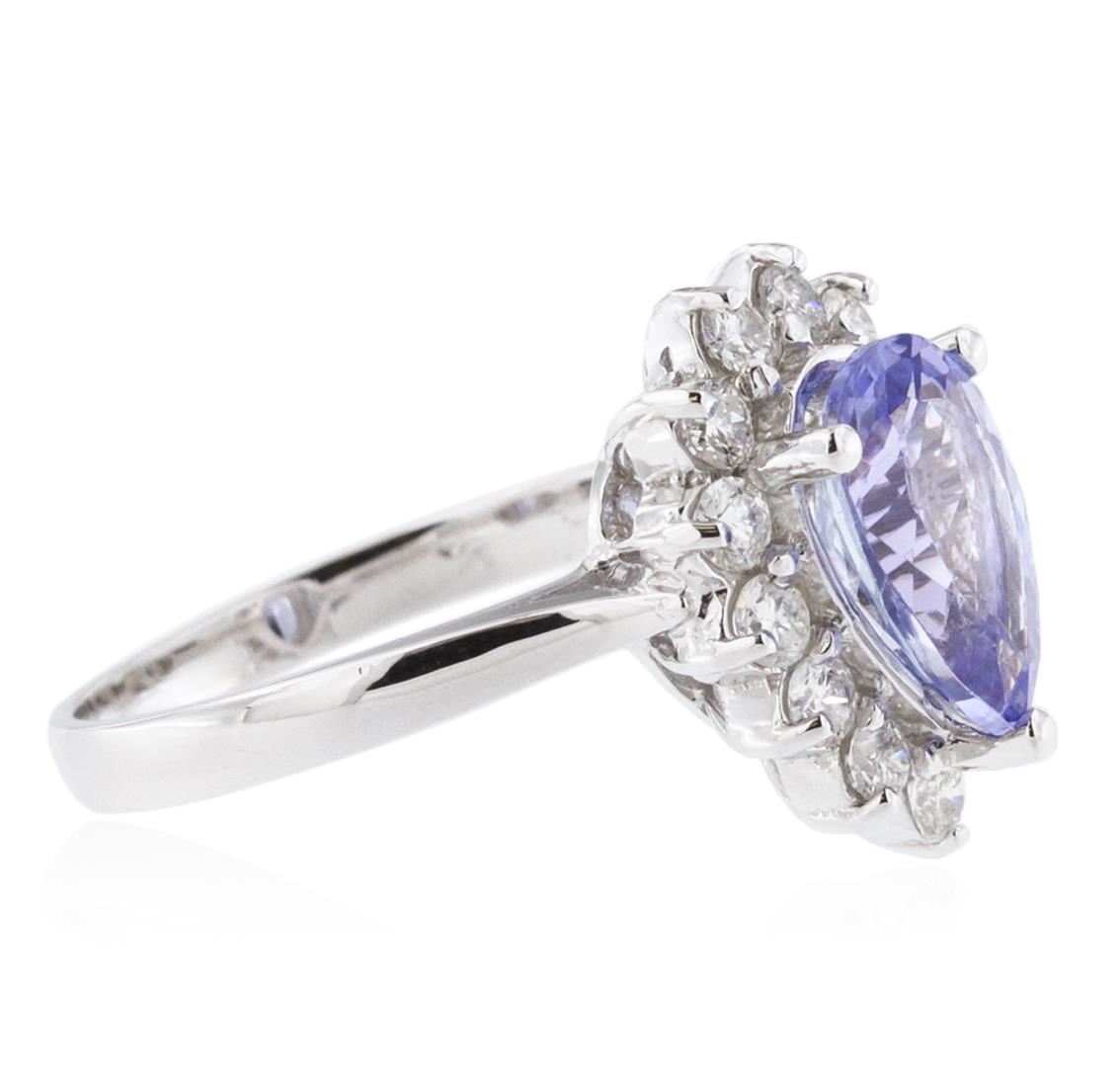 One electronically tested 14KT white gold ladies cast tanzanite and diamond ring with a bright polish finish. Identified with markings of "K14". Condition is new. Containing: One prong set pear modified brilliant cut natural tanzanite, measuring 10.90 x 6.80 x 4.42mm, approximate weight of 2.19ct., clarity is eye clean, type I, medium light, very slightly grayish, violet color, (GIA V 4/3), cut is good. Thirteen prong set round brilliant cut diamonds, measuring 2.10 - 2.10 x 1.26mm (depth est.) approximate total weight of 13 Stones = 0.44ct. Clarity: SI-1 to I-1. Color: H - I, Cut is Good. Colored gemstones are presumed to have been subjected to commonly used enhancement processes. All diamonds and colored gemstones are graded in the mounting, unless otherwise stated. Total Weight of Colored Stones 2.19ct. Total Weight of Diamonds 0.44ct. Total Weight of Ring 4.50 grams. GGL Appraised at $3,550.00.