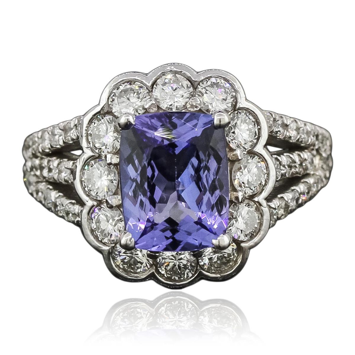 One electronically tested 14KT white gold ladies combination cast & assembled tanzanite and diamond ring with a bright polish finish. Identified with markings of "14K". Condition is new. Containing: One prong set rectangular cushion modified brilliant cut natural tanzanite, measuring 8.65 x 7.03 x 4.57mm, approximate weight of 2.19ct., clarity is eye clean, type I, medium light, very slightly grayish, violet color, (GIA V 4/3), cut is good. Fifty prong set round brilliant cut diamonds, measuring 1.30 - 1.30 x 0.78mm (depth est.) approximate total weight of 50 Stones = 0.40ct. Clarity: SI-2 to I-1. Color: I - J, Cut is Good. Twelve prong set round brilliant cut diamonds, measuring 2.50 - 2.50 x 1.50mm (depth est.) approximate total weight of 12 Stones = 0.69ct. Clarity: SI-1 to SI-2. Color: H - I, Cut is Good. Colored gemstones are presumed to have been subjected to commonly used enhancement processes. All diamonds and colored gemstones are graded in the mounting, unless otherwise stated. Total Weight of Colored Stones 2.19ct. Total Weight of Diamonds 1.09ct. Total Weight of Ring 5.80 grams. GGL Appraised at $5,460.00.