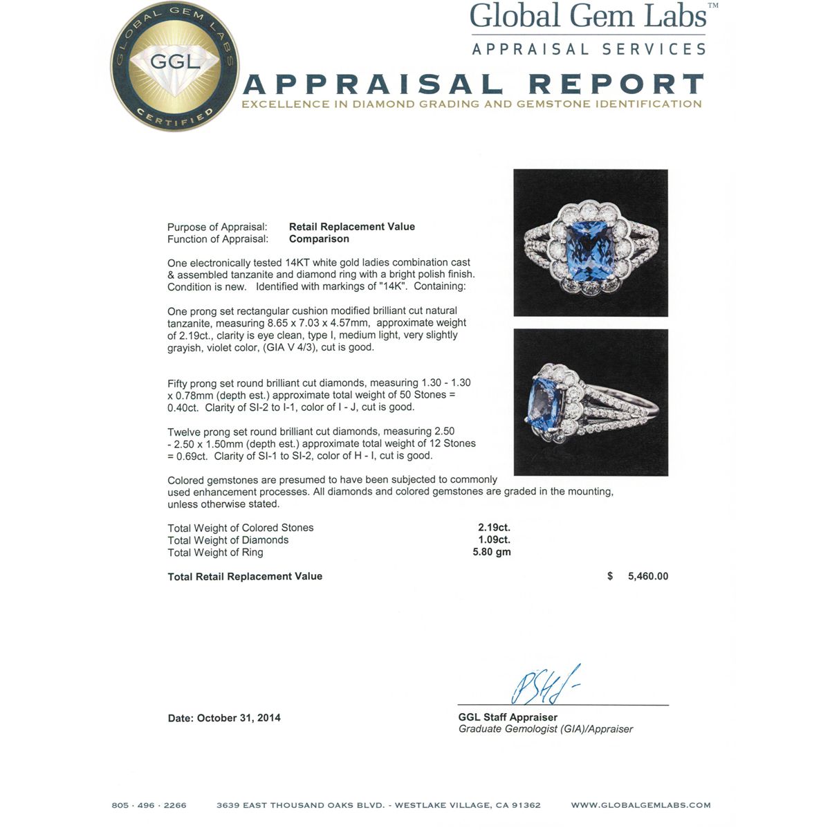 One electronically tested 14KT white gold ladies combination cast & assembled tanzanite and diamond ring with a bright polish finish. Identified with markings of "14K". Condition is new. Containing: One prong set rectangular cushion modified brilliant cut natural tanzanite, measuring 8.65 x 7.03 x 4.57mm, approximate weight of 2.19ct., clarity is eye clean, type I, medium light, very slightly grayish, violet color, (GIA V 4/3), cut is good. Fifty prong set round brilliant cut diamonds, measuring 1.30 - 1.30 x 0.78mm (depth est.) approximate total weight of 50 Stones = 0.40ct. Clarity: SI-2 to I-1. Color: I - J, Cut is Good. Twelve prong set round brilliant cut diamonds, measuring 2.50 - 2.50 x 1.50mm (depth est.) approximate total weight of 12 Stones = 0.69ct. Clarity: SI-1 to SI-2. Color: H - I, Cut is Good. Colored gemstones are presumed to have been subjected to commonly used enhancement processes. All diamonds and colored gemstones are graded in the mounting, unless otherwise stated. Total Weight of Colored Stones 2.19ct. Total Weight of Diamonds 1.09ct. Total Weight of Ring 5.80 grams. GGL Appraised at $5,460.00.