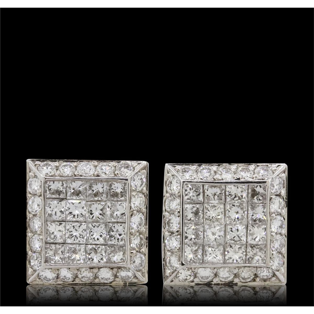One pair electronically tested 14KT white gold cast & assembled diamond cluster earrings with standard backs. Bright polish finish. Identified with markings of "14K". Condition is new, good workmanship. Containing: Thirty-Two invisible set princess cut diamonds, measuring 1.90 x 1.80 x 1.35mm (depth est.) approximate total weight of 32 Stones = 1.31ct. Graded in the setting. Clarity: SI-1 to SI-2. Color: G - I Forty bead set round brilliant cut diamonds, measuring 1.80 - 1.70 x 1.05mm (depth est.) approximate total weight of 40 Stones = 0.88ct. Graded in the setting. Clarity: SI-1 to I-1. Color: G - I. Total Weight of Diamonds 2.19ct. Total Weight of Earrings 3.00 grams. AIG Appraised at $5,990.00.