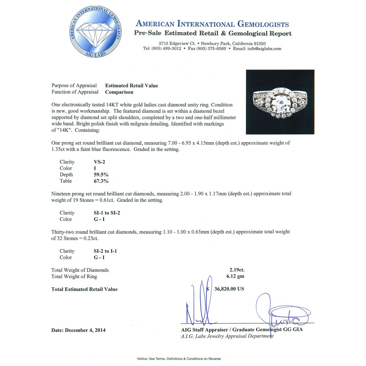 One electronically tested 14KT white gold ladies cast diamond unity ring. The featured diamond is set within a diamond bezel supported by diamond set split shoulders, completed by a two and one-half millimeter wide band. Bright polish finish with milgrain detailing. Identified with markings of "14K". Condition is new, good workmanship. Containing: One prong set round brilliant cut diamond, measuring 7.00 - 6.95 x 4.15mm (depth est.) approximate weight of 1.35ct with a faint blue fluorescence. Graded in the setting. Clarity: VS-2. Color: I. Depth 59.5%. Table 67.3%. Nineteen prong set round brilliant cut diamonds, measuring 2.00 - 1.90 x 1.17mm (depth est.) approximate total weight of 19 Stones = 0.61ct. Graded in the setting. Clarity: SI-1 to SI-2. Color: G - I Thirty-Two round brilliant cut diamonds, measuring 1.10 - 1.00 x 0.63mm (depth est.) approximate total weight of 32 Stones = 0.23ct. Clarity: SI-2 to I-1. Color: G - I. Total Weight of Diamonds 2.19ct. Total Weight of Ring 6.12 grams. AIG Appraised at $36,820.00.