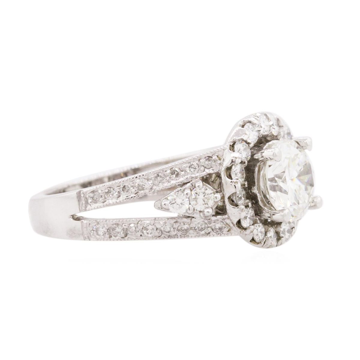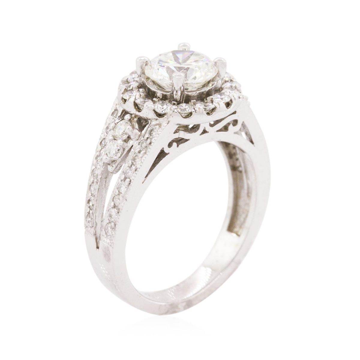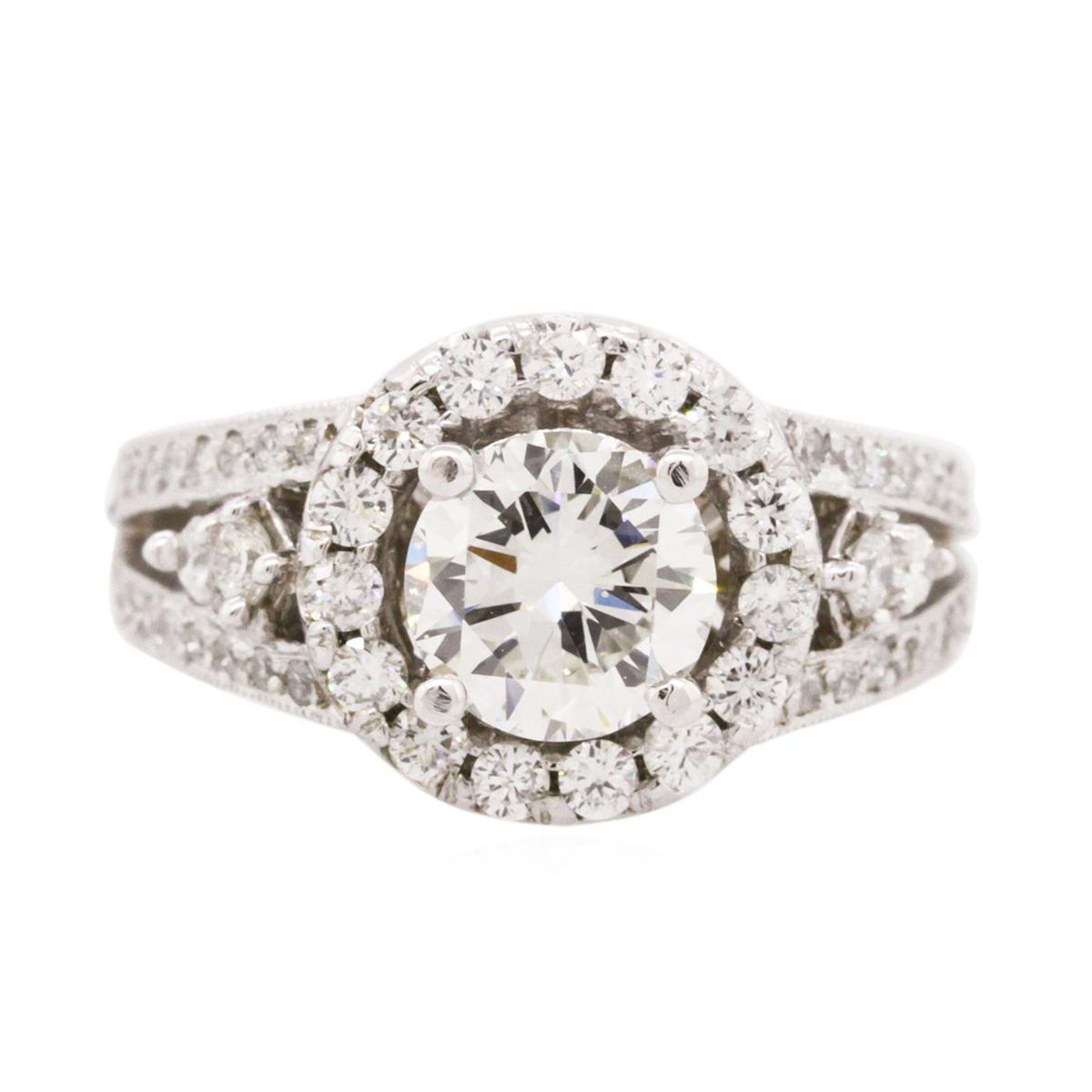 One electronically tested 14KT white gold ladies cast diamond unity ring. The featured diamond is set within a diamond bezel supported by diamond set split shoulders, completed by a two and one-half millimeter wide band. Bright polish finish with milgrain detailing. Identified with markings of "14K". Condition is new, good workmanship. Containing: One prong set round brilliant cut diamond, measuring 7.00 - 6.95 x 4.15mm (depth est.) approximate weight of 1.35ct with a faint blue fluorescence. Graded in the setting. Clarity: VS-2. Color: I. Depth 59.5%. Table 67.3%. Nineteen prong set round brilliant cut diamonds, measuring 2.00 - 1.90 x 1.17mm (depth est.) approximate total weight of 19 Stones = 0.61ct. Graded in the setting. Clarity: SI-1 to SI-2. Color: G - I Thirty-Two round brilliant cut diamonds, measuring 1.10 - 1.00 x 0.63mm (depth est.) approximate total weight of 32 Stones = 0.23ct. Clarity: SI-2 to I-1. Color: G - I. Total Weight of Diamonds 2.19ct. Total Weight of Ring 6.12 grams. AIG Appraised at $36,820.00.