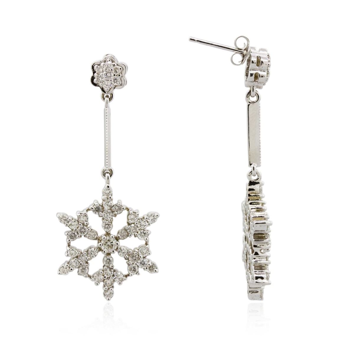 One pair electronically tested 14KT white gold ladies cast diamond earrings with friction posts with a bright polish finish. Identified with markings of "14K". Condition is new. Containing: Eighty-Eight prong set round brilliant cut diamonds, measuring 3.00 - 1.90 x 1.47mm (depth est.) approximate total weight of 88 Stones = 2.20ct. Clarity: SI-2 to I-1. Color: I - J. All diamonds are graded in the mounting, unless otherwise stated. Total Weight of Diamonds 2.20ct. Total Weight of Earrings 8.60 grams. GGL Appraised at $5,205.00.
