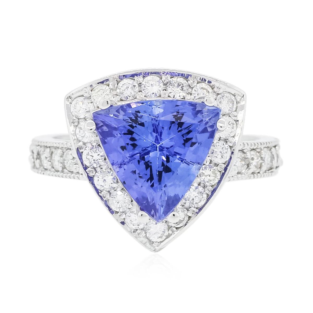 One electronically tested 14KT white gold ladies combination cast & assembled tanzanite and diamond ring with a flat shank with a bright polish finish. Identified with markings of "K14". Condition is new. Containing: One prong set triangle modified brilliant cut natural tanzanite, measuring 9.81 x 8.95 x 4.15mm, approximate weight of 2.20ct., clarity is eye clean, type I, medium, moderately strong, violet color, (GIA V 5/4), cut is good. Thirty prong set round brilliant cut diamonds, measuring 1.70 - 1.70 x 1.02mm (depth est.) approximate total weight of 30 Stones = 0.54ct. Clarity: SI-2 to I-1. Color: I - J, Cut is Good. Colored gemstones are presumed to have been subjected to commonly used enhancement processes. All diamonds and colored gemstones are graded in the mounting, unless otherwise stated. Total Weight of Colored Stones 2.20ct. Total Weight of Diamonds 0.54ct. Total Weight of Ring 5.60 grams. GGL Appraised at $6,085.00.