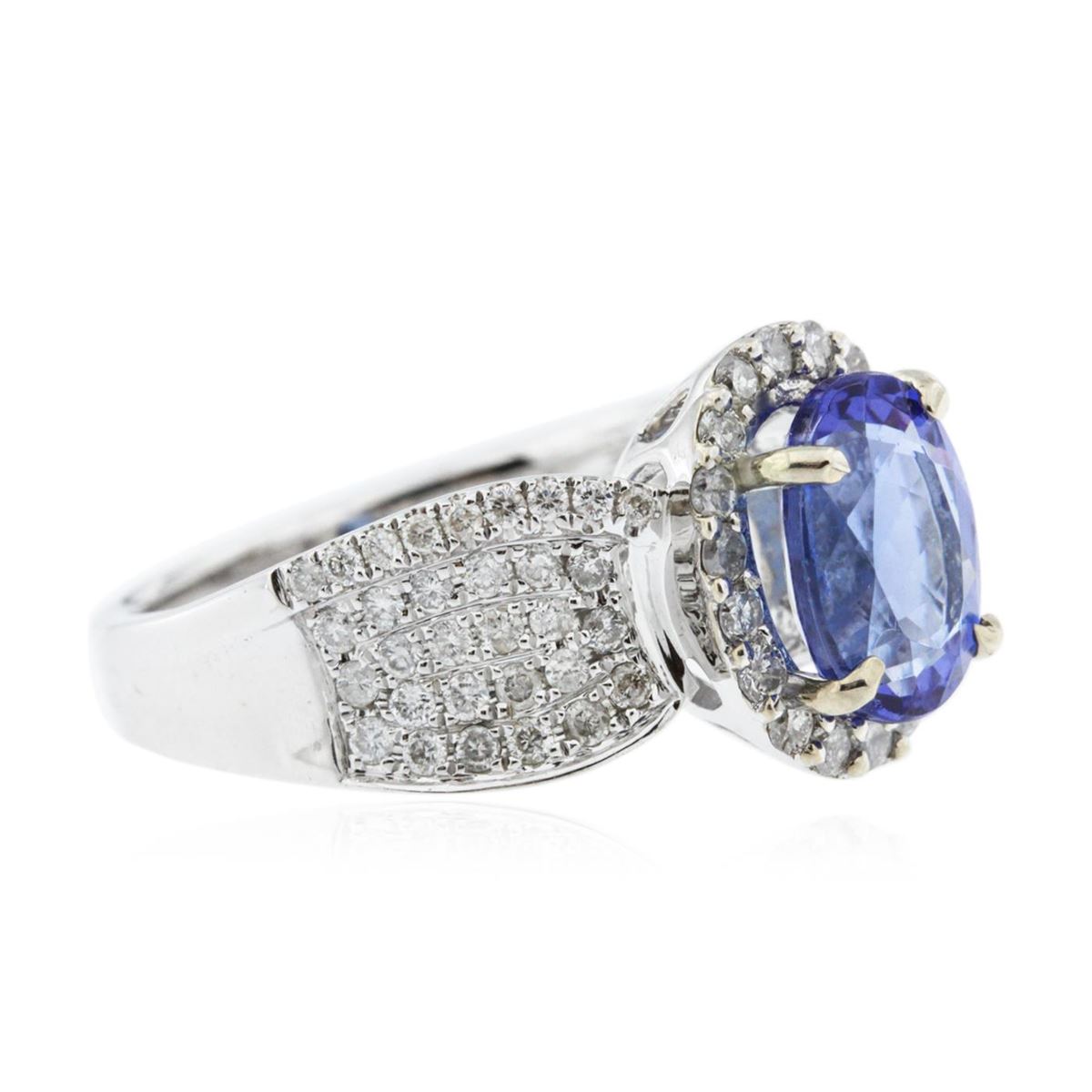 One electronically tested 14KT white gold Ladies combination cast & assembled ring with a bright polish finish. Condition is new. Identified with markings of "14K". Containing: Eighteen bead set round brilliant cut diamonds, measuring 1.50 - 1.50 x 0.90mm (depth est.) approximate. Total Weight of 18 Stones = 0.25ct. Clarity: I-1 to I-2. Color: H - I, Cut is Good. Thirty-Six bead set round brilliant cut diamonds, measuring 1.00 - 1.00 x 0.60mm (depth est.) approximate. Total Weight of 36 Stones = 0.10ct. Clarity: I-1 to I-2. Color: H - I, Cut is Good. Forty-Four prong set round brilliant cut diamonds, measuring 1.30 - 1.30 x 0.78mm (depth est.) approximate. Total Weight of 44 Stones = 0.50ct. Clarity: I-1 to I-2. Color: H - I, Cut is Good. One prong set oval modified brilliant cut natural tanzanite, measuring 9.00 x 7.00 x 4.60mm, approximate weight of 2.20ct., clarity is eye clean, medium light, very slightly grayish, violet color, (GIA V 4/3), cut is very good. Colored gemstones are presumed to have been subjected to commonly used color/clarity enhancement processes. Total Weight of Colored Stones 2.20ct. Total Weight of Diamonds 0.85ct. Total Weight of Ring 6.80 grams. GGL Appraised at $6,850.00.