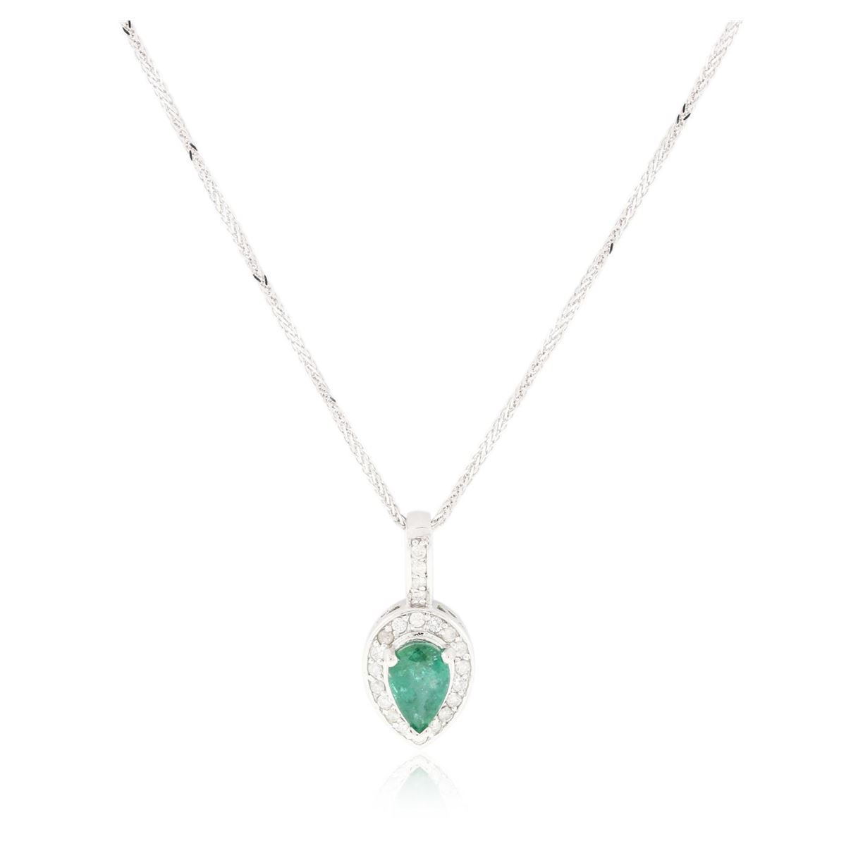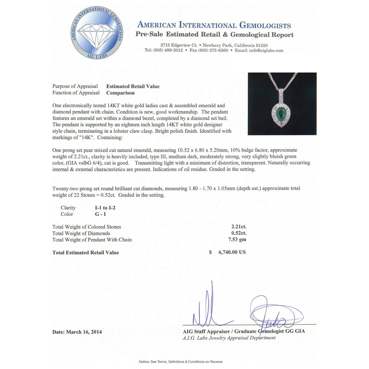One electronically tested 14KT white gold ladies cast & assembled emerald and diamond pendant with chain. Condition is new, good workmanship. The pendant features an emerald set within a diamond bezel, completed by a diamond set bail. The pendant is supported by an eighteen inch length 14KT white gold designer style chain, terminating in a lobster claw clasp. Bright polish finish. Identified with markings of "14K". Containing: One prong set pear mixed cut natural emerald, measuring 10.52 x 6.80 x 5.20mm, 10%. bulge factor, approximate weight of 2.21ct., clarity is heavily included, type III, medium dark, moderately strong, very slightly bluish green color, (GIA vslbG 6/4), cut is good. Transmitting light with a minimum of distortion, transparent. Naturally occurring internal & external characteristics are present. Indications of oil residue. Graded in the setting. Twenty-Two prong set round brilliant cut diamonds, measuring 1.80 - 1.70 x 1.05mm (depth est.) approximate. Total Weight of 22 Stones = 0.52ct. Graded in the setting. Clarity: I-1 to I-2. Color: G - I. Total Weight of Colored Stones 2.21ct. Total Weight of Diamonds 0.52ct. Total Weight of Pendant With Chain 7.53 grams. AIG Appraised at $6,740.00.