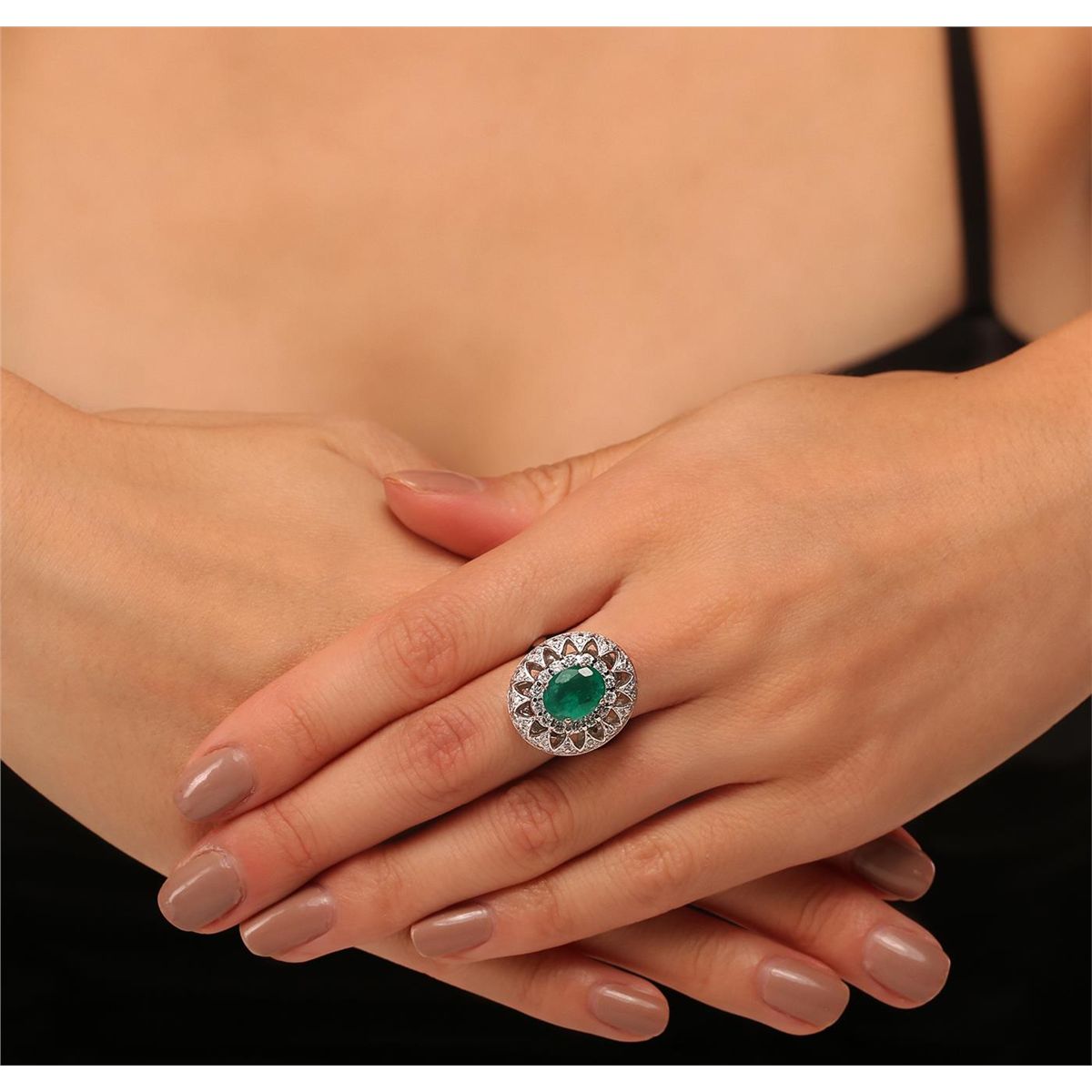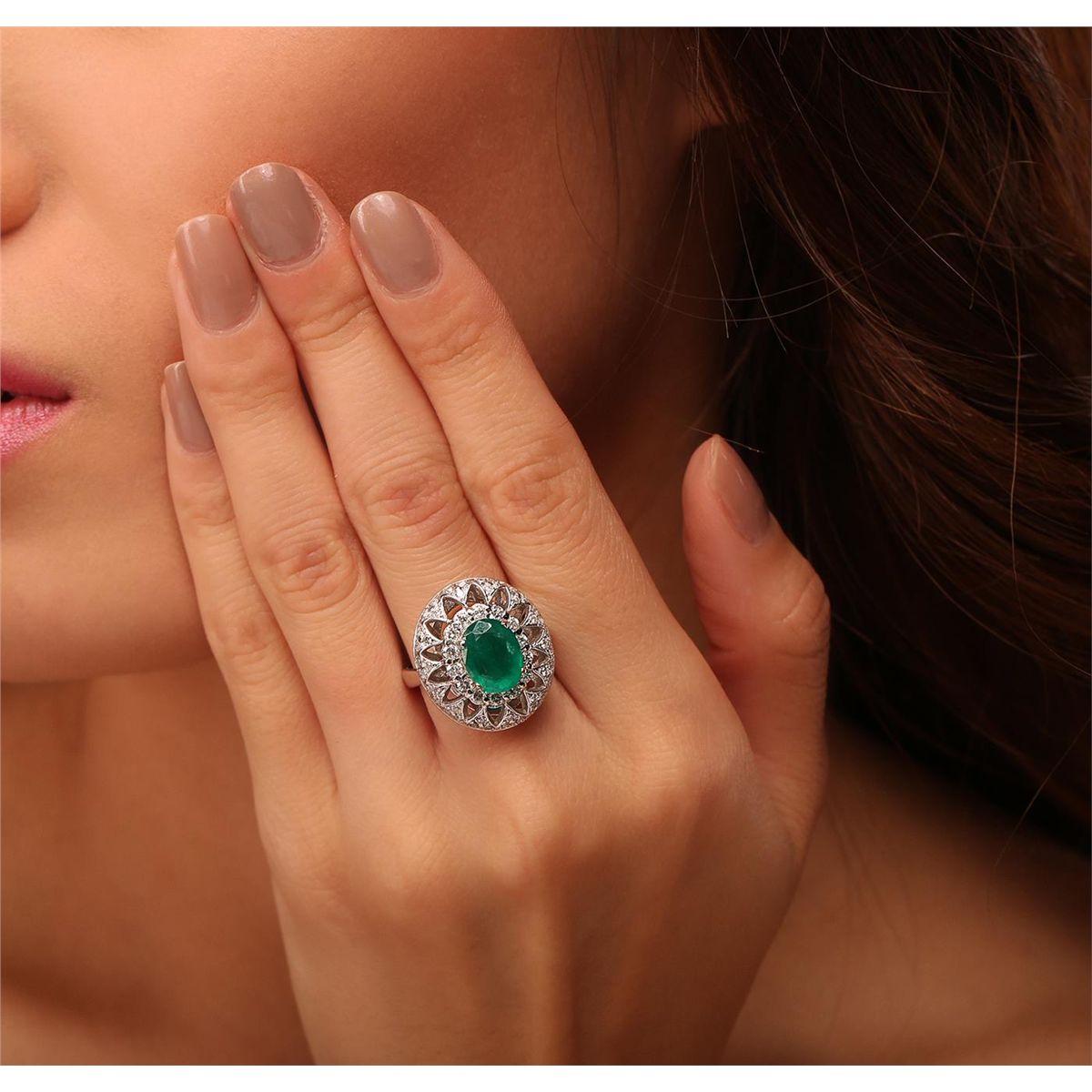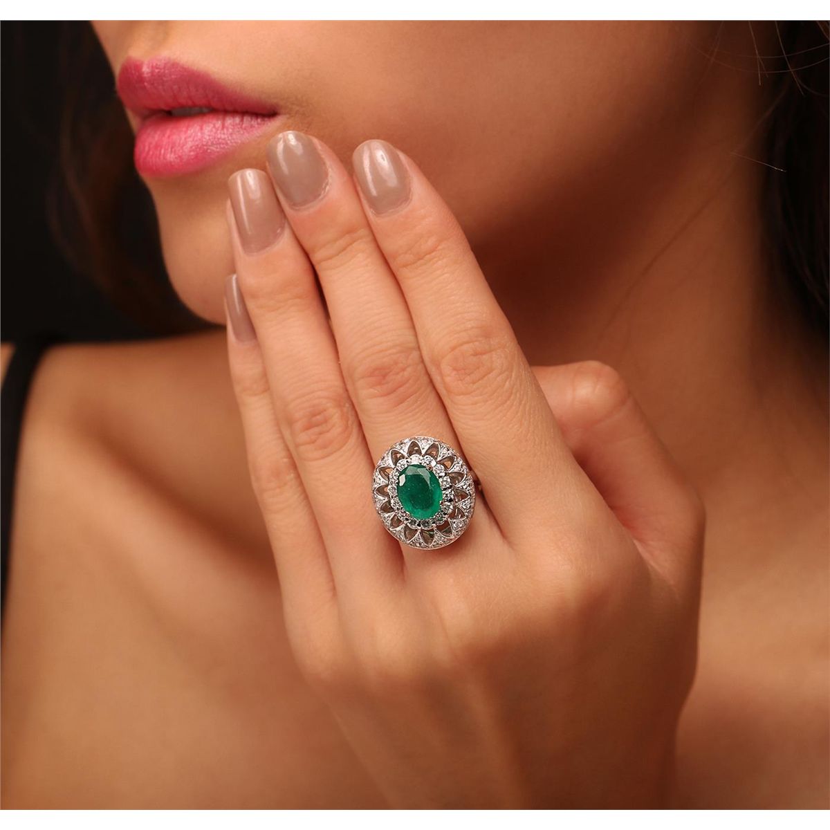 One electronically tested 14KT white gold Ladies combination cast & assembled ring with a bright polish finish. Condition is new. Identified with markings of "14K". Containing: One prong set oval modified brilliant cut natural emerald, measuring 10.10 x 7.80 x 5.07mm, approximate weight of 2.21ct., clarity is heavily included, type III, medium dark, moderately strong, green color, (GIA G 6/4), cut is good. Colored gemstones are presumed to have been subjected to commonly used color/clarity enhancement processes. Fifty-Six prong set round brilliant cut diamonds, measuring 2.00 - 1.30 x 0.99mm (depth est.) approximate. Total Weight of 56 Stones = 0.92ct. Clarity: SI-2 to I-2. Color: H - I, Cut is Good. Total Weight of Colored Stones 2.21ct. Total Weight of Diamonds 0.92ct. Total Weight of Ring 8.50 grams. GGL Appraised at $9,220.00.