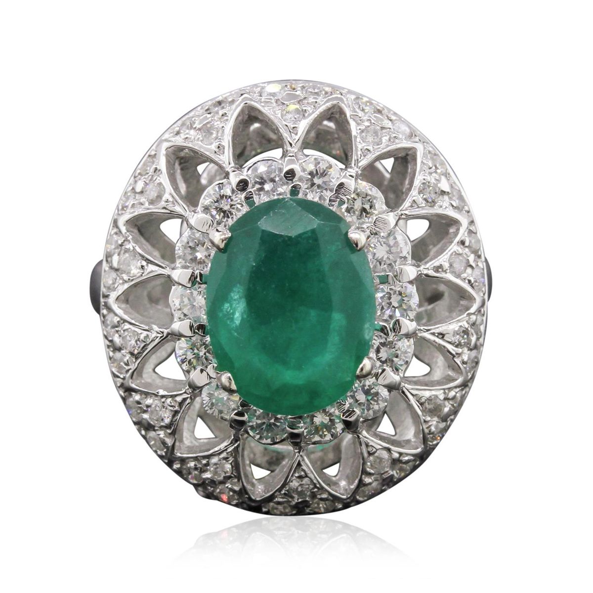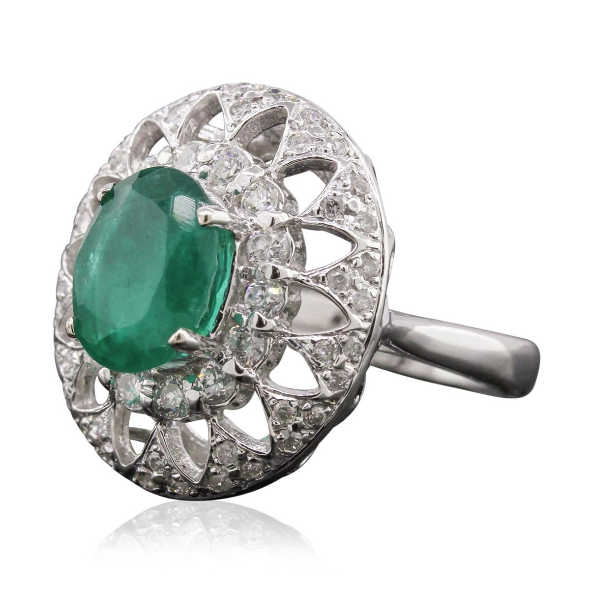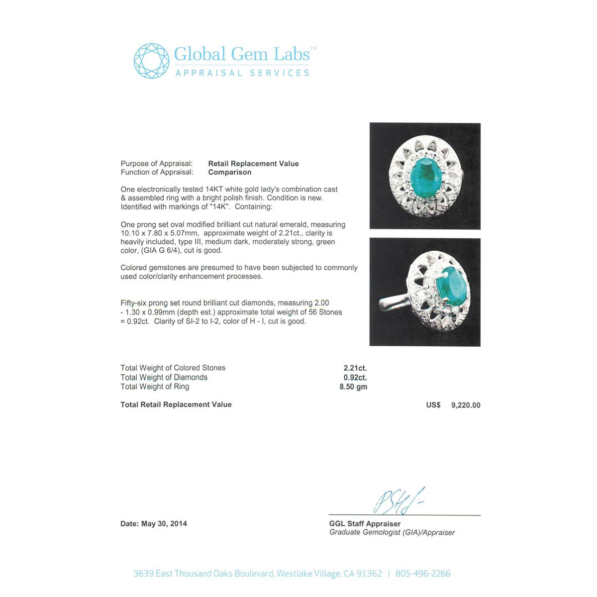 One electronically tested 14KT white gold Ladies combination cast & assembled ring with a bright polish finish. Condition is new. Identified with markings of "14K". Containing: One prong set oval modified brilliant cut natural emerald, measuring 10.10 x 7.80 x 5.07mm, approximate weight of 2.21ct., clarity is heavily included, type III, medium dark, moderately strong, green color, (GIA G 6/4), cut is good. Colored gemstones are presumed to have been subjected to commonly used color/clarity enhancement processes. Fifty-Six prong set round brilliant cut diamonds, measuring 2.00 - 1.30 x 0.99mm (depth est.) approximate. Total Weight of 56 Stones = 0.92ct. Clarity: SI-2 to I-2. Color: H - I, Cut is Good. Total Weight of Colored Stones 2.21ct. Total Weight of Diamonds 0.92ct. Total Weight of Ring 8.50 grams. GGL Appraised at $9,220.00.