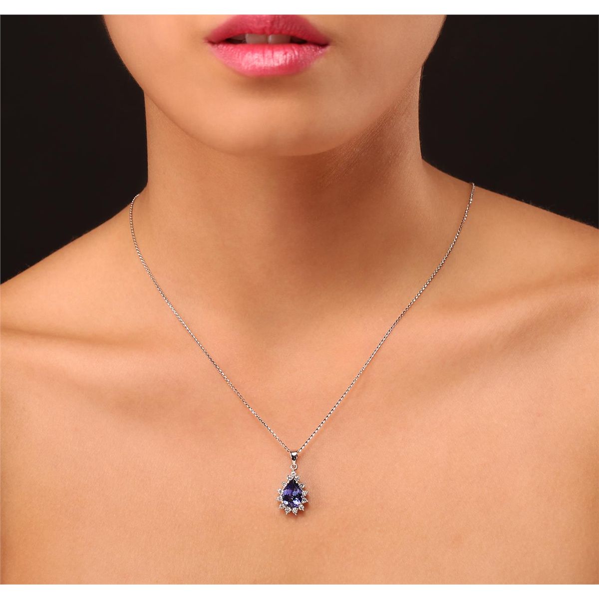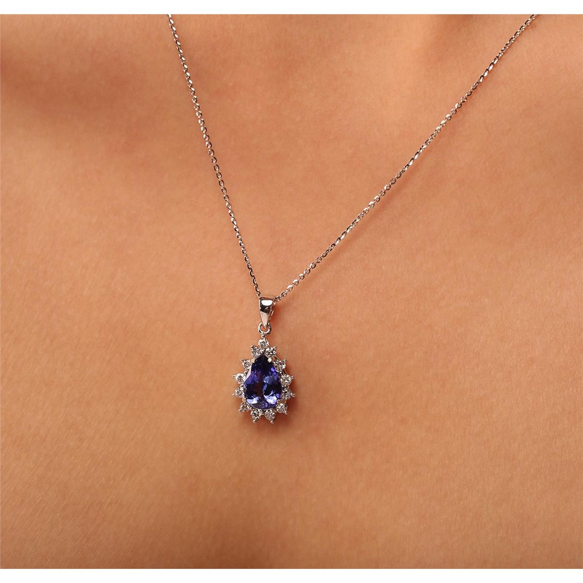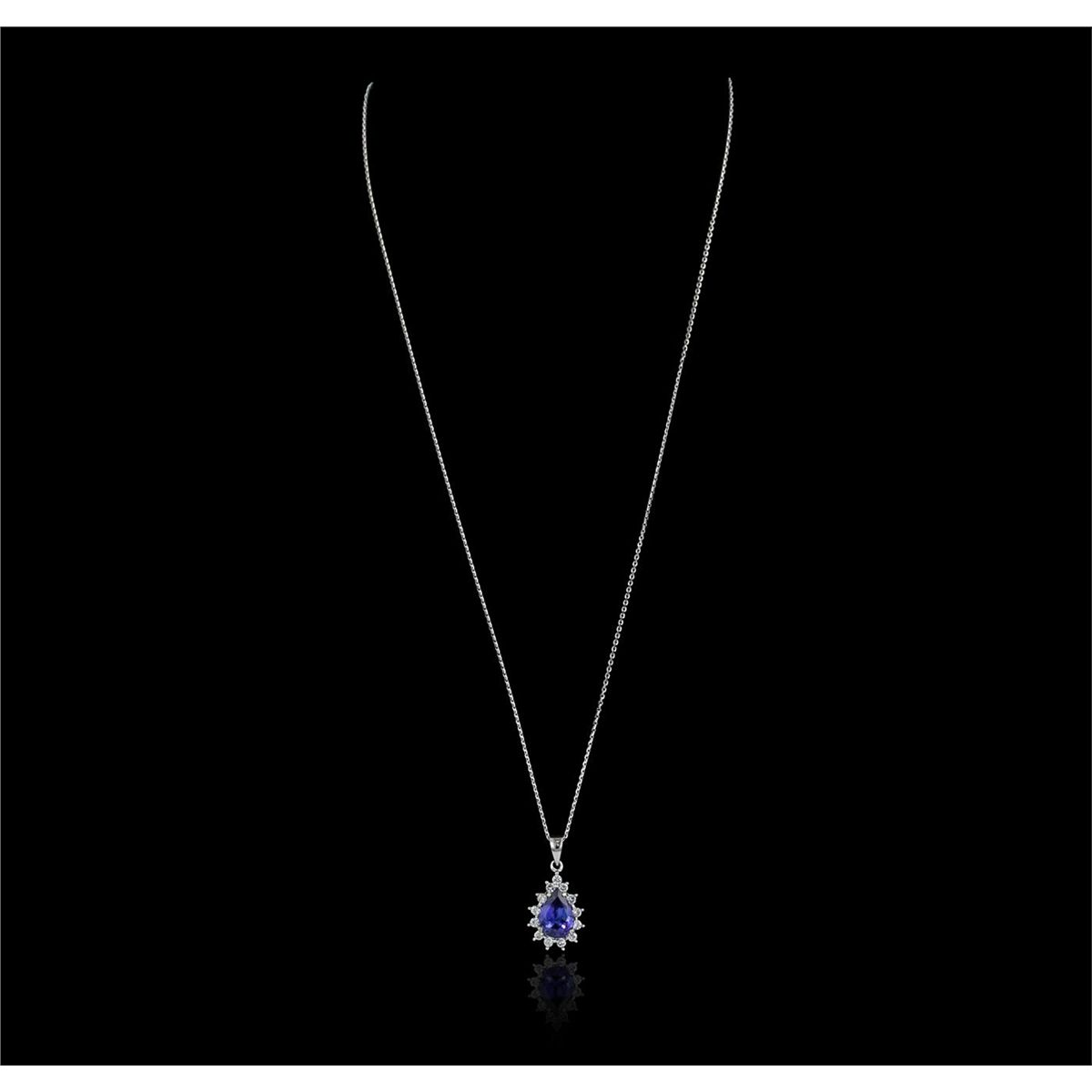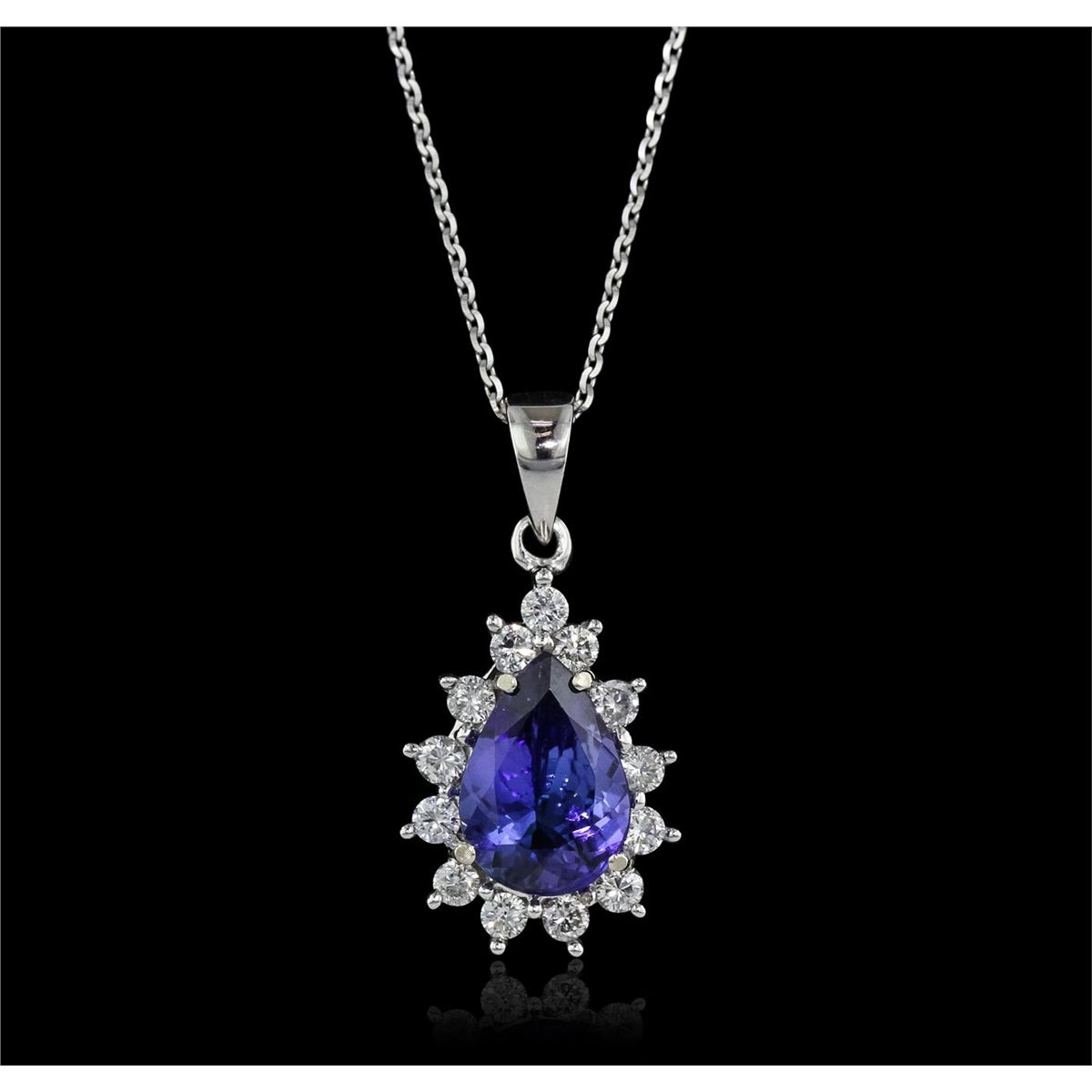 One electronically tested 14KT white gold ladies cast & assembled tanzanite and diamond pendant with chain. Condition is new, good workmanship. The featured tanzanite is set within a diamond bezel, completed by a white gold bail. The pendant is supported by an eighteen inch length 14KT white gold designer style chain, terminating in a spring ring clasp. Bright polish finish. Trademark is Orianne. Identified with markings of "14K". Containing: One prong set pear mixed cut natural tanzanite, measuring 10.60 x 7.35 x 4.00mm, 6%. bulge factor, approximate weight of 2.21ct., clarity is eye clean, type I, medium dark, very slightly grayish, violetish blue color, (GIA vB 6/3), cut is good. Transmitting light with no distortion, transparent. Graded in the setting. Tanzanite is a very rare gemstone that is only found in the country of Tanzania. Originally discovered in 1967. Tiffany & Company, named the stone Tanzanite. It is found in the Usumburu Mountains that border the Umba Valley of northern Tanzania. Tanzanite occurs in gray, brown, violet, blue, reddish-purple, & green. The gem is interesting because of its exceptional pleochroism. Rotated in different directions a tanzanite will exhibit multiple changes of color. Tanzanite has a low tolerance to ultrasonic cleaning, and should not be cleaned using this method. Thirteen prong set round brilliant cut diamonds, measuring 2.10 - 2.00 x 1.23mm (depth est.) approximate. Total Weight of 13 Stones = 0.51ct. Graded in the setting. Clarity: SI-1 to SI-2. Color: H - J. Total Weight of Colored Stones 2.21ct. Total Weight of Diamonds 0.51ct. Total Weight of Pendant With Chain 3.89 grams. AIG Appraised at $7,350.00.