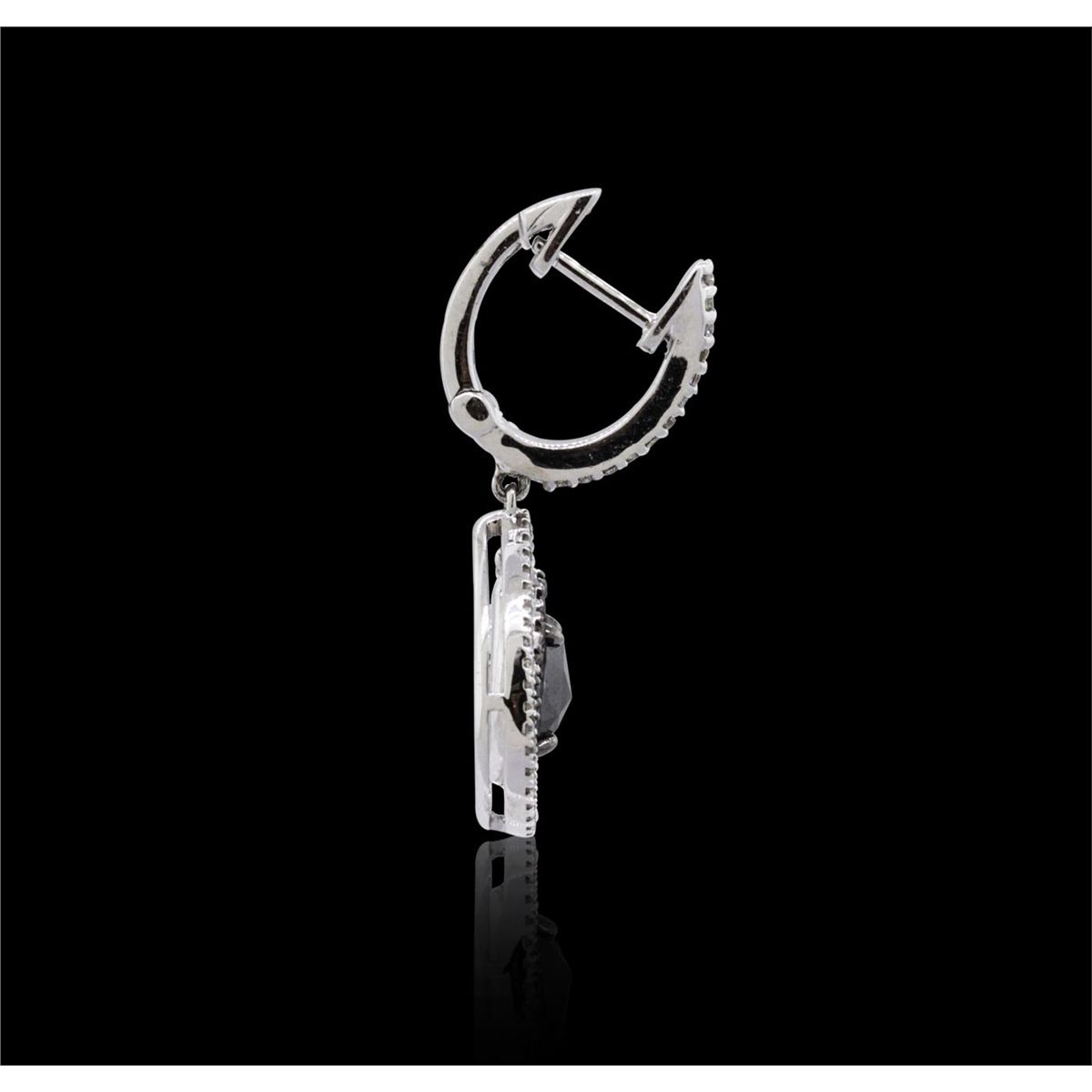 One pair of 14KT white gold earrings containing two natural pear rose cut fancy black diamonds, enhanced for color, with a total weight of 1.50ct. The earrings also contain black side stones: fancy black (color enhanced), and white side stone: H-I / SI3-I1 weighing 0.33ct and 0.38ct respectively. Total weight of the earrings is 5.60 grams. EGL Appraised at $3,040.00.