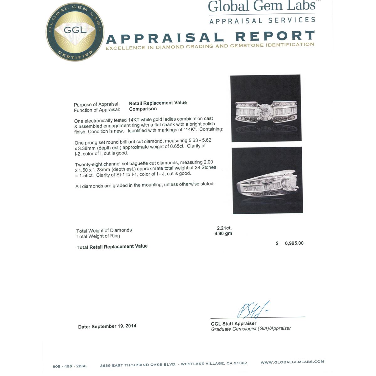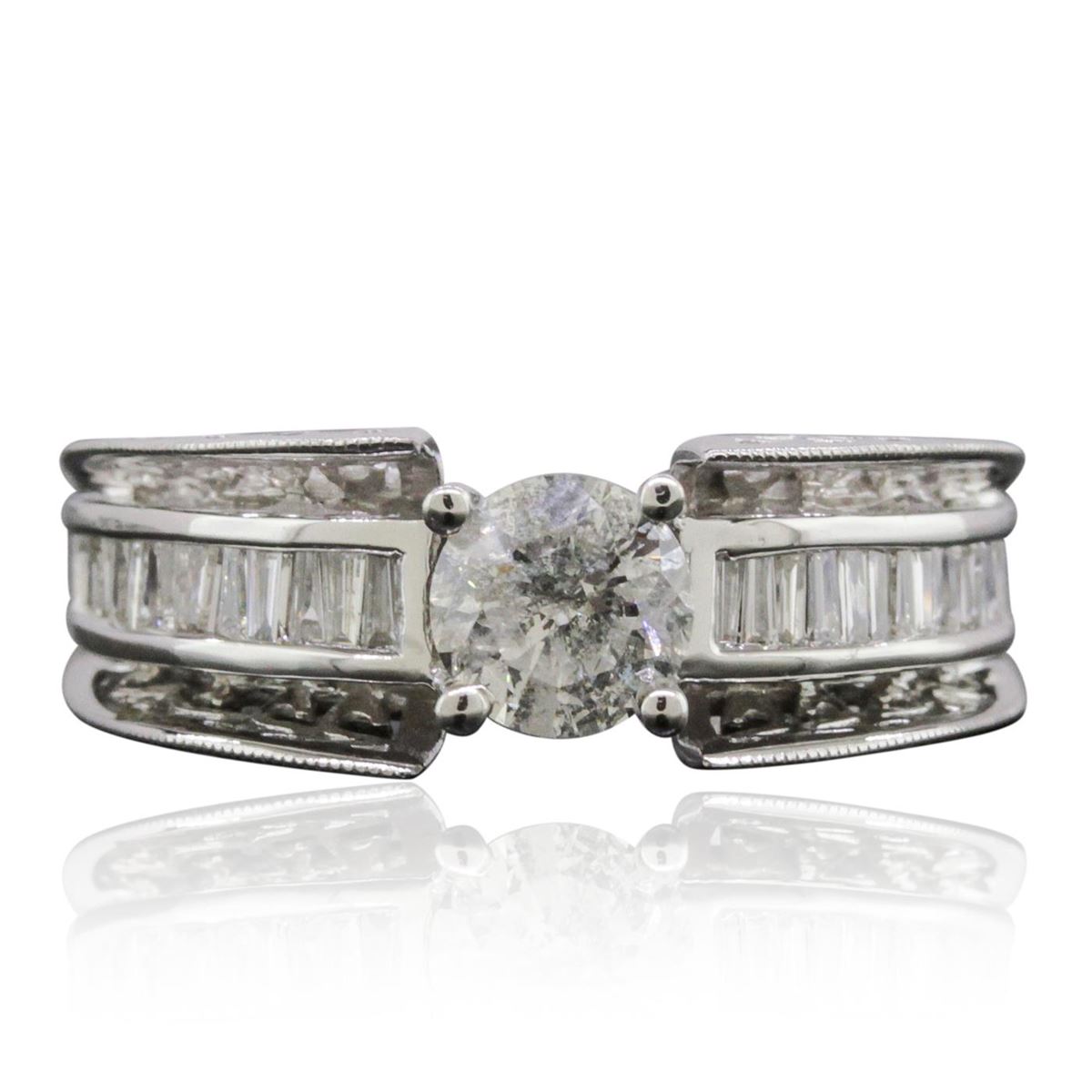 One electronically tested 14KT white gold ladies combination cast & assembled engagement ring with a flat shank with a bright polish finish. Identified with markings of "14K". Condition is new. Containing: One prong set round brilliant cut diamond, measuring 5.63 - 5.62 x 3.38mm (depth est.) approximate weight of 0.65ct. Clarity: I-2. Color: I, Cut is Good. Twenty-Eight channel set baguette cut diamonds, measuring 2.00 x 1.50 x 1.28mm (depth est.) approximate total weight of 28 Stones = 1.56ct. Clarity: SI-1 to I-1. Color: I - J, Cut is Good. All diamonds are graded in the mounting, unless otherwise stated. Total Weight of Diamonds 2.21ct. Total Weight of Ring 4.90 grams. GGL Appraised at $6,995.00.