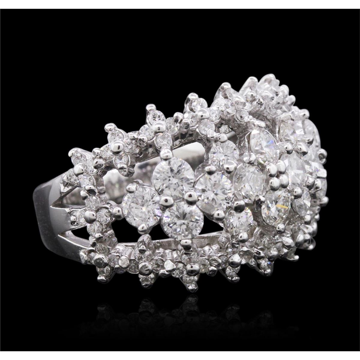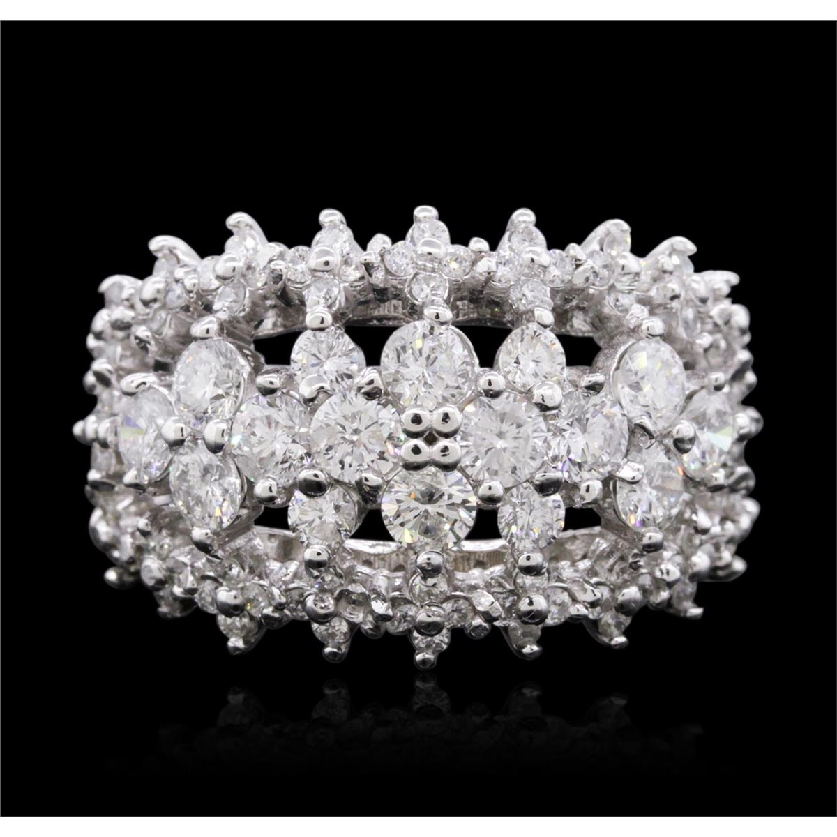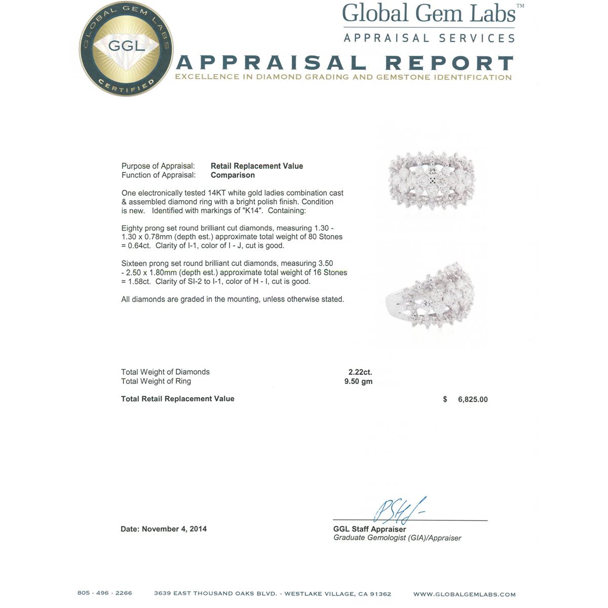 One electronically tested 14KT white gold ladies combination cast & assembled diamond ring with a bright polish finish. Identified with markings of "K14". Condition is new. Containing: Eighty prong set round brilliant cut diamonds, measuring 1.30 - 1.30 x 0.78mm (depth est.) approximate total weight of 80 Stones = 0.64ct. Clarity: I-1. Color: I - J, Cut is Good. Sixteen prong set round brilliant cut diamonds, measuring 3.50 - 2.50 x 1.80mm (depth est.) approximate total weight of 16 Stones = 1.58ct. Clarity: SI-2 to I-1. Color: H - I, Cut is Good. All diamonds are graded in the mounting, unless otherwise stated. Total Weight of Diamonds 2.22ct. Total Weight of Ring 9.50 grams. GGL Appraised at $6,825.00.