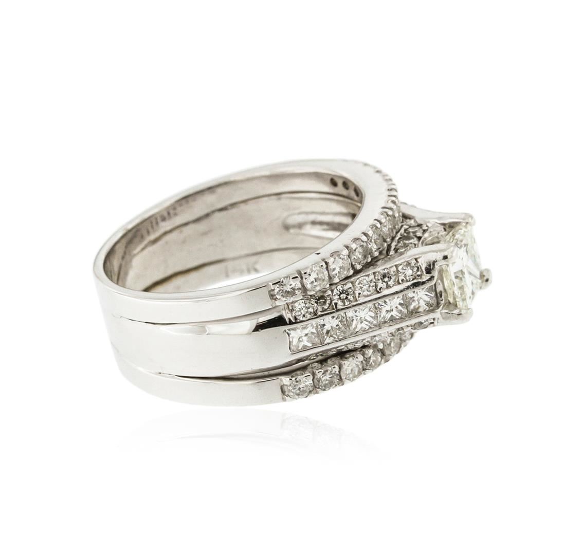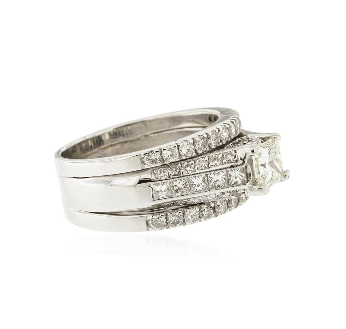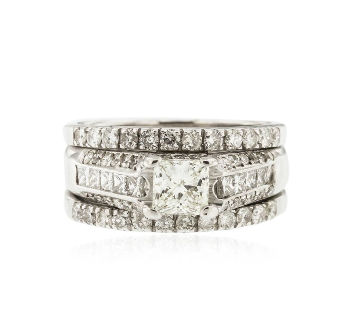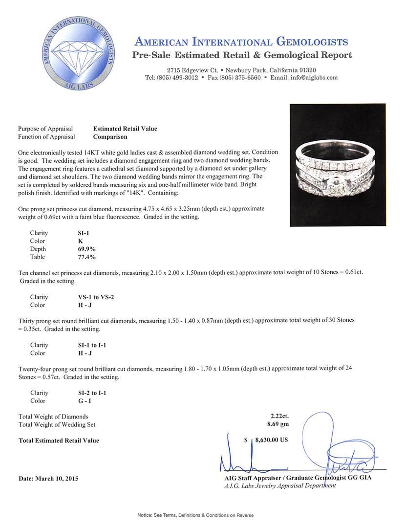 One electronically tested 14KT white gold ladies cast & assembled diamond wedding set. The wedding set includes a diamond engagement ring and two diamond wedding bands. The engagement ring features a cathedral set diamond supported by a diamond set under gallery and diamond set shoulders. The two diamond wedding bands mirror the engagement ring. The set is completed by soldered bands measuring six and one-half millimeter wide band. Bright polish finish. Identified with markings of "14K". Condition is good. Containing: One prong set princess cut diamond, measuring 4.75 x 4.65 x 3.25mm (depth est.) approximate weight of 0.69ct with a faint blue fluorescence. Graded in the setting. Clarity: SI-1. Color: 69.9%. Table 77.4%. Ten channel set princess cut diamonds, measuring 2.10 x 2.00 x 1.50mm (depth est.) approximate total weight of 10 Stones = 0.61ct. Graded in the setting. Clarity: VS-1 to VS-2. Color: H - J Thirty prong set round brilliant cut diamonds, measuring 1.50 - 1.40 x 0.87mm (depth est.) approximate total weight of 30 Stones = 0.35ct. Graded in the setting. Clarity: SI-1 to I-1. Color: H - J Twenty-Four prong set round brilliant cut diamonds, measuring 1.80 - 1.70 x 1.05mm (depth est.) approximate total weight of 24 Stones = 0.57ct. Graded in the setting. Clarity: SI-2 to I-1. Color: G - I. Total Weight of Diamonds 2.22ct. Total Weight of Wedding Set 8.69 grams. AIG Appraised at $8,630.00.