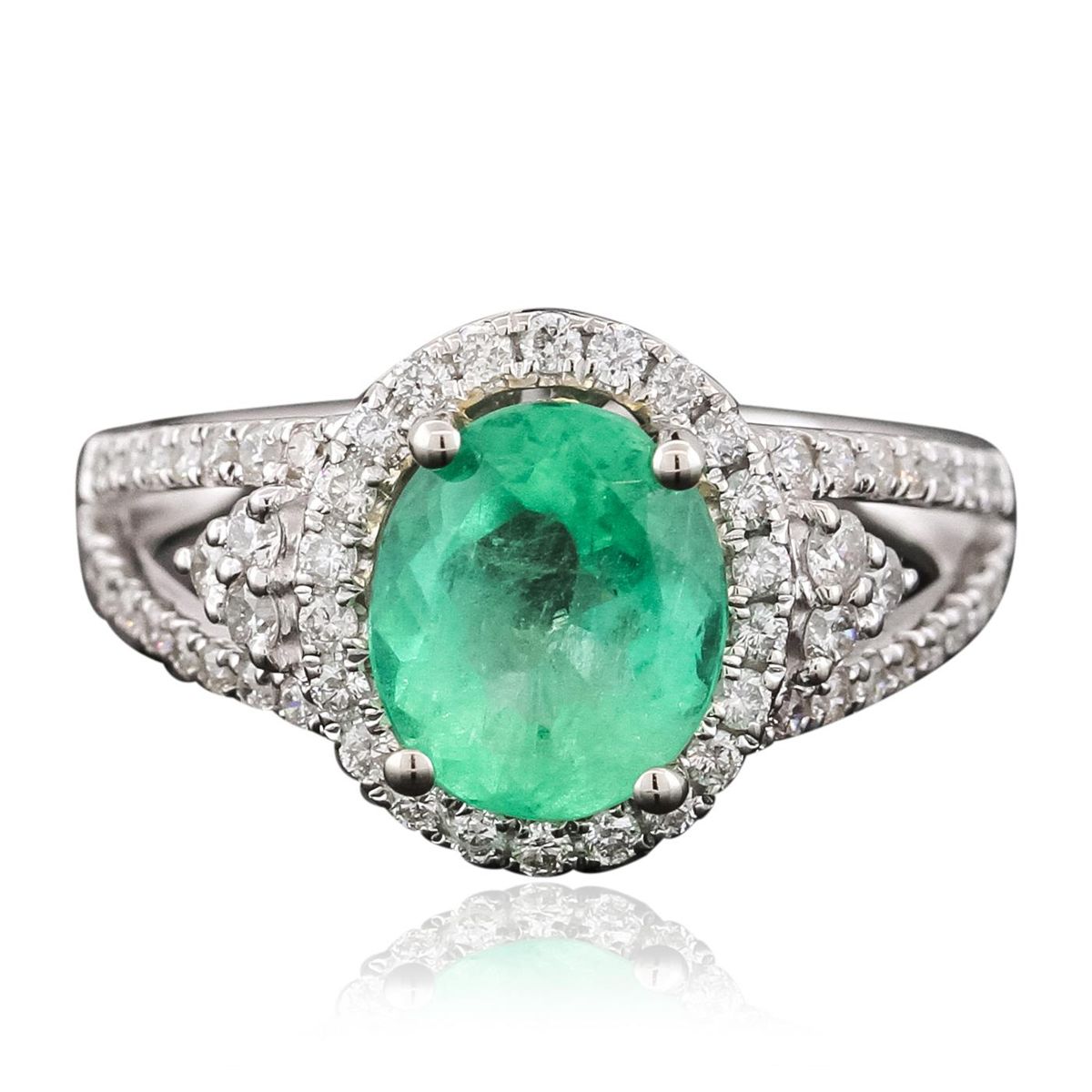 One electronically tested 14KT white gold ladies combination cast & assembled ring with a bright polish finish. Identified with markings of "14K". Condition is new. Containing: One prong set oval modified brilliant cut natural emerald, measuring 8.94 x 7.68 x 5.90mm, approximate weight of 2.22ct., clarity is moderately included, type III, medium light, very slightly grayish, very slightly bluish green color, (GIA vslbG 4/3), cut is good. Sixty prong set round brilliant cut diamonds, measuring 2.00 - 1.30 x 0.99mm (depth est.) approximate total weight of 60 Stones = 0.70ct. Clarity: SI-2 to I-1. Color: I - J, Cut is Good. Colored gemstones are presumed to have been subjected to commonly used enhancement processes. All diamonds and colored gemstones are graded in the mounting, unless otherwise stated. Total Weight of Colored Stones 2.22ct. Total Weight of Diamonds 0.70ct. Total Weight of Ring 3.70 grams. GGL Appraised at $7,025.00.