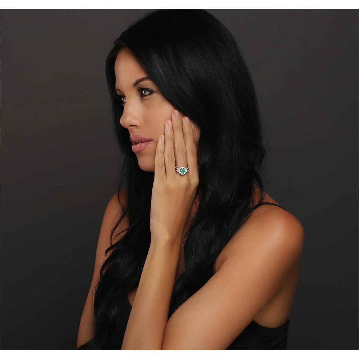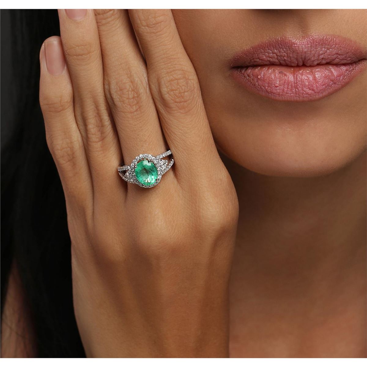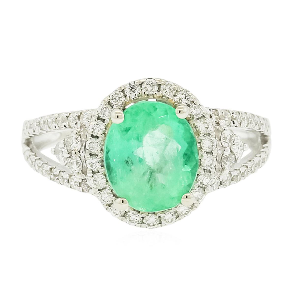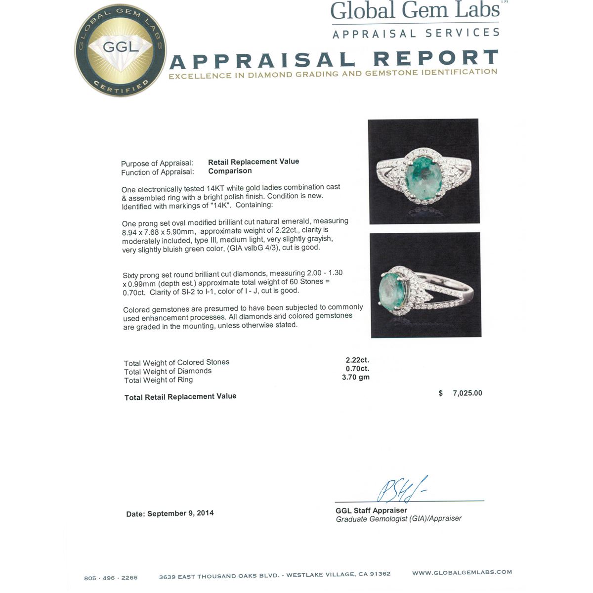 One electronically tested 14KT white gold ladies combination cast & assembled ring with a bright polish finish. Identified with markings of "14K". Condition is new. Containing: One prong set oval modified brilliant cut natural emerald, measuring 8.94 x 7.68 x 5.90mm, approximate weight of 2.22ct., clarity is moderately included, type III, medium light, very slightly grayish, very slightly bluish green color, (GIA vslbG 4/3), cut is good. Sixty prong set round brilliant cut diamonds, measuring 2.00 - 1.30 x 0.99mm (depth est.) approximate total weight of 60 Stones = 0.70ct. Clarity: SI-2 to I-1. Color: I - J, Cut is Good. Colored gemstones are presumed to have been subjected to commonly used enhancement processes. All diamonds and colored gemstones are graded in the mounting, unless otherwise stated. Total Weight of Colored Stones 2.22ct. Total Weight of Diamonds 0.70ct. Total Weight of Ring 3.70 grams. GGL Appraised at $7,025.00.