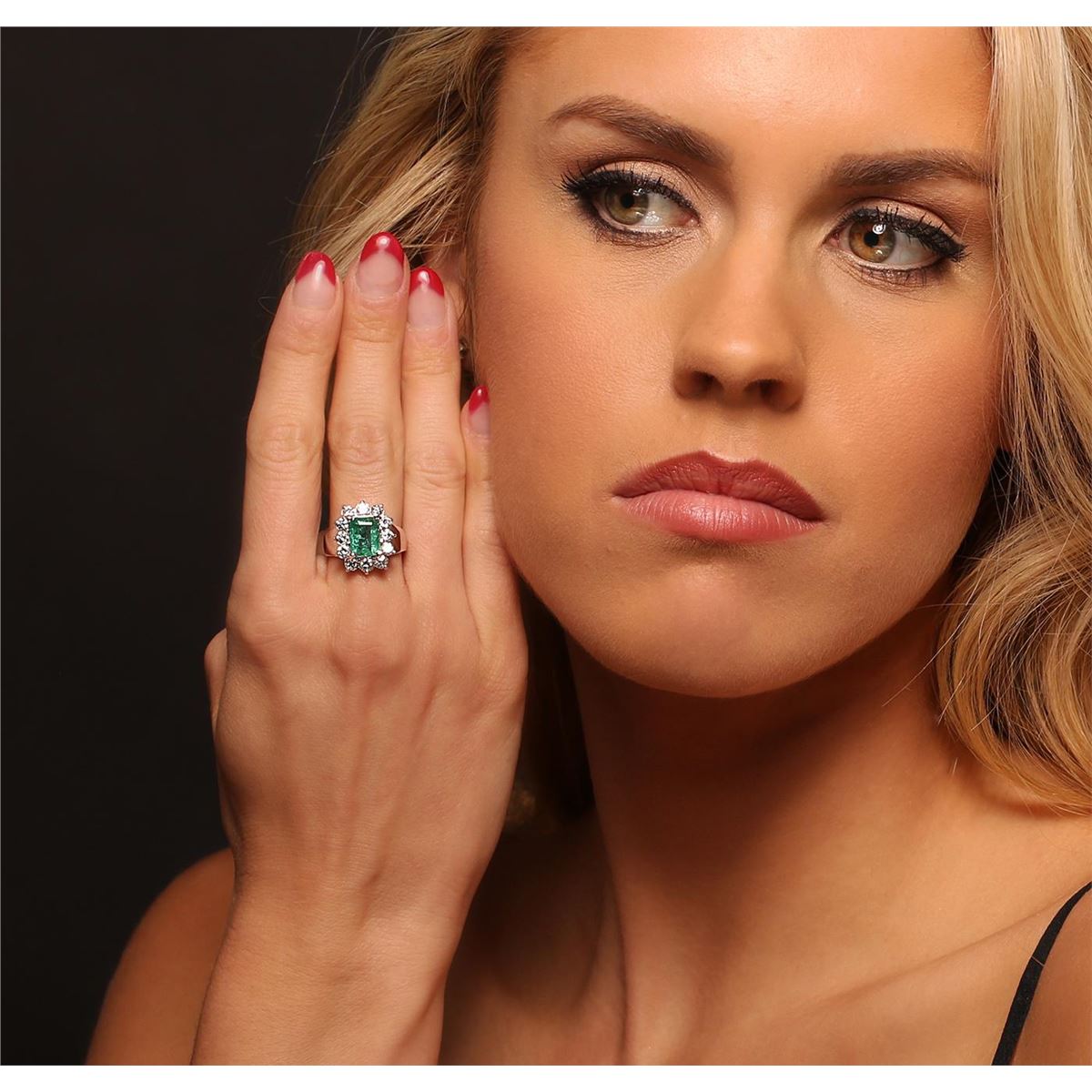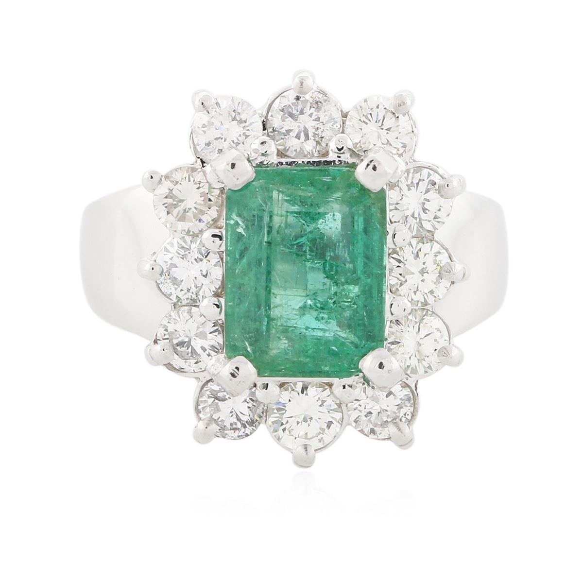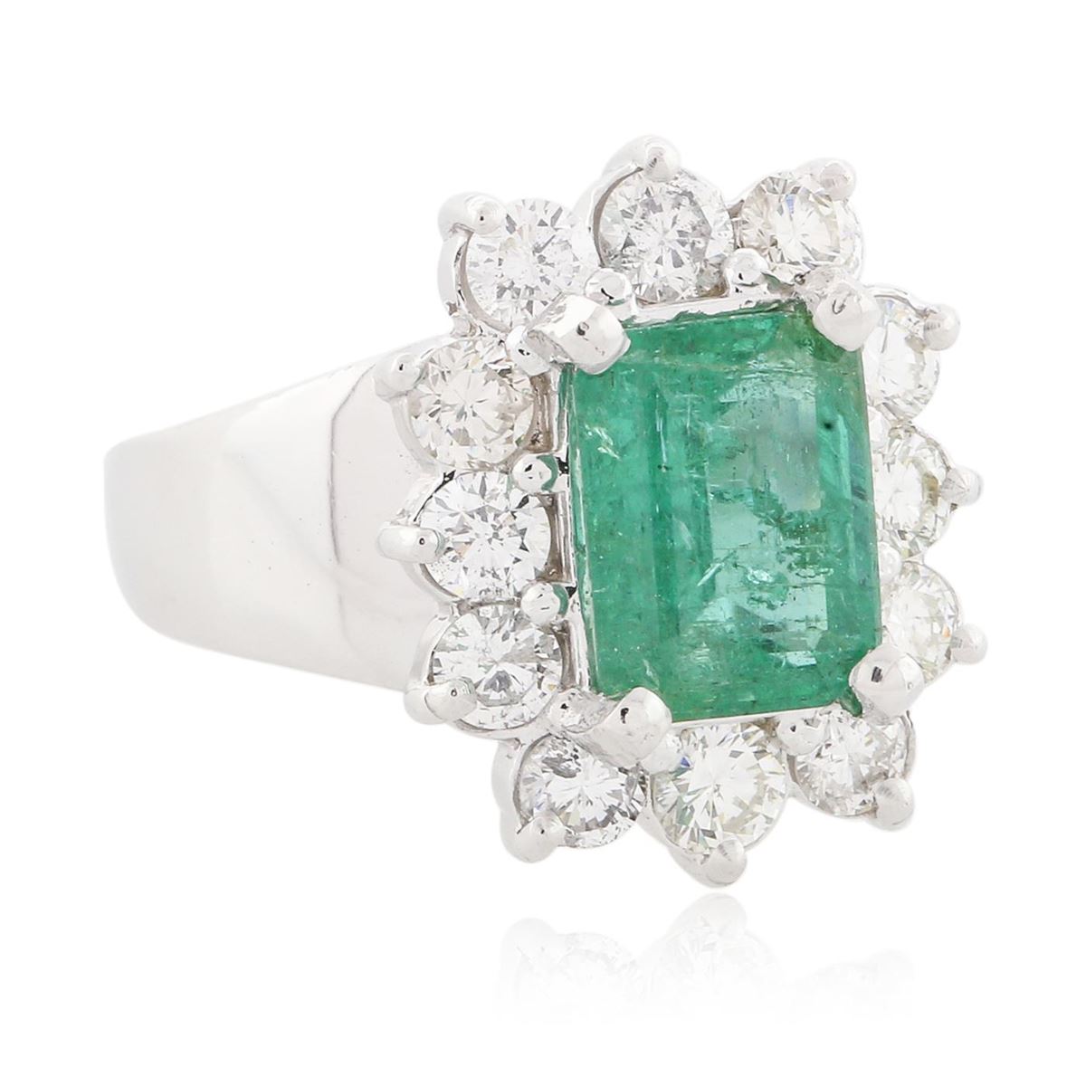 Great Condition! One electronically tested 14KT white gold Ladies combination cast & assembled fashion ring with a bright polish finish. Condition is new. Identified with markings of "14K". Containing: One prong set emerald standard step cut natural emerald, measuring 9.00 x 7.00 x 4.80mm, approximate weight of 2.22ct., clarity is heavily included, type III, medium light, very slightly grayish, bluish green color, (GIA bG 4/3), cut is good. Colored gemstones are presumed to have been subjected to commonly used and possible undetectable color/clarity enhancement processes. Twelve prong set round brilliant cut diamonds, measuring 3.00 - 3.00 x 1.80mm (depth est.) approximate total weight of 12 Stones = 1.19ct. Clarity of SI-1 to SI-2, Color of I - K, Cut is Good. Total Weight of Colored Stones 2.22ct. Total Weight of Diamonds 1.19ct. Total Weight of Ring 8.50 grams. GGL Appraised at $9,875.00.