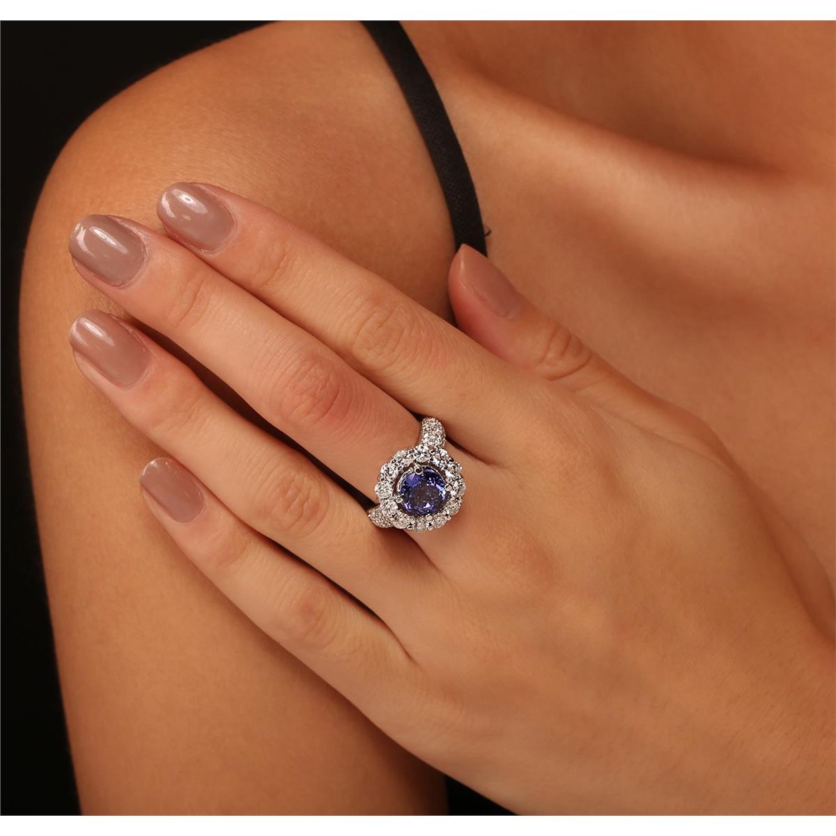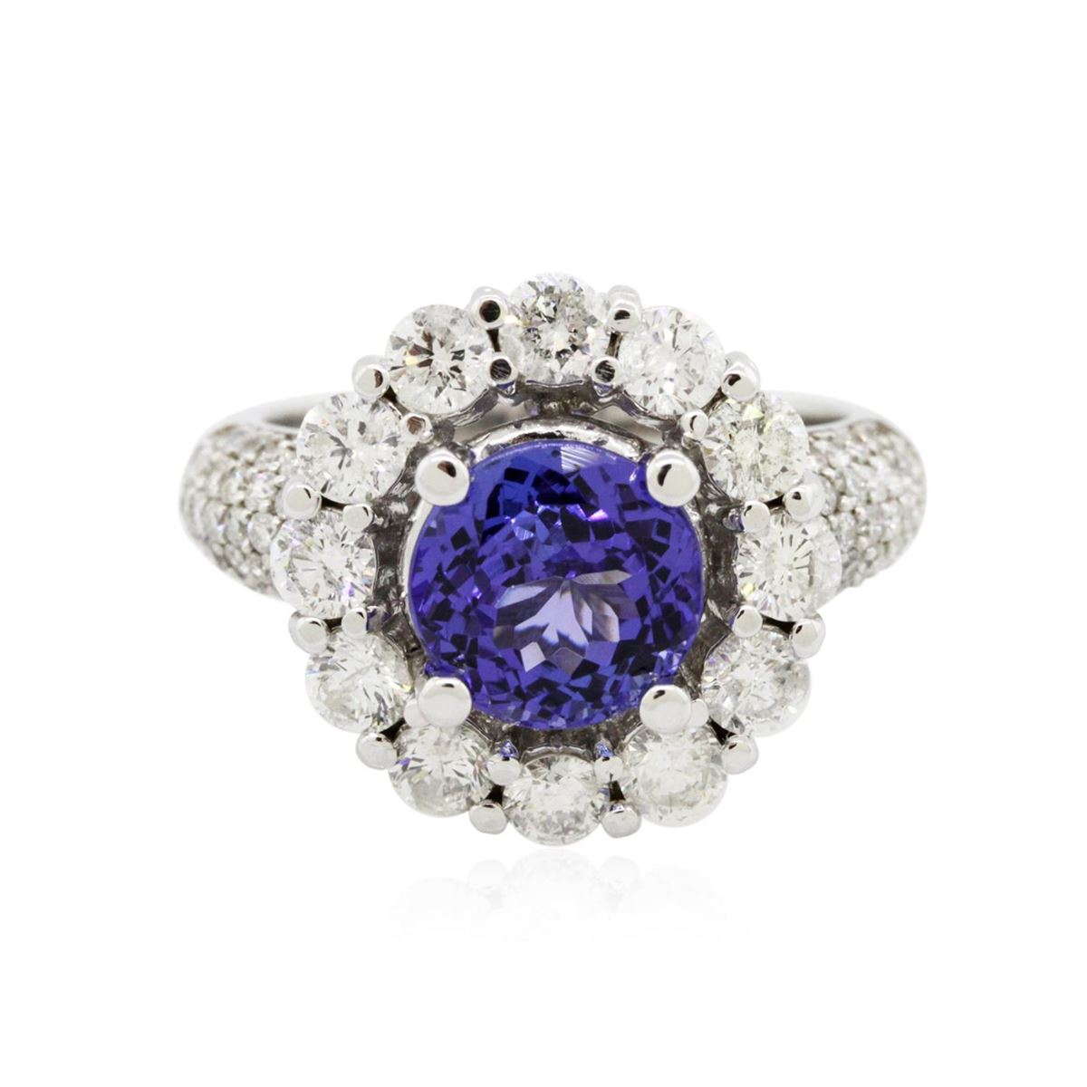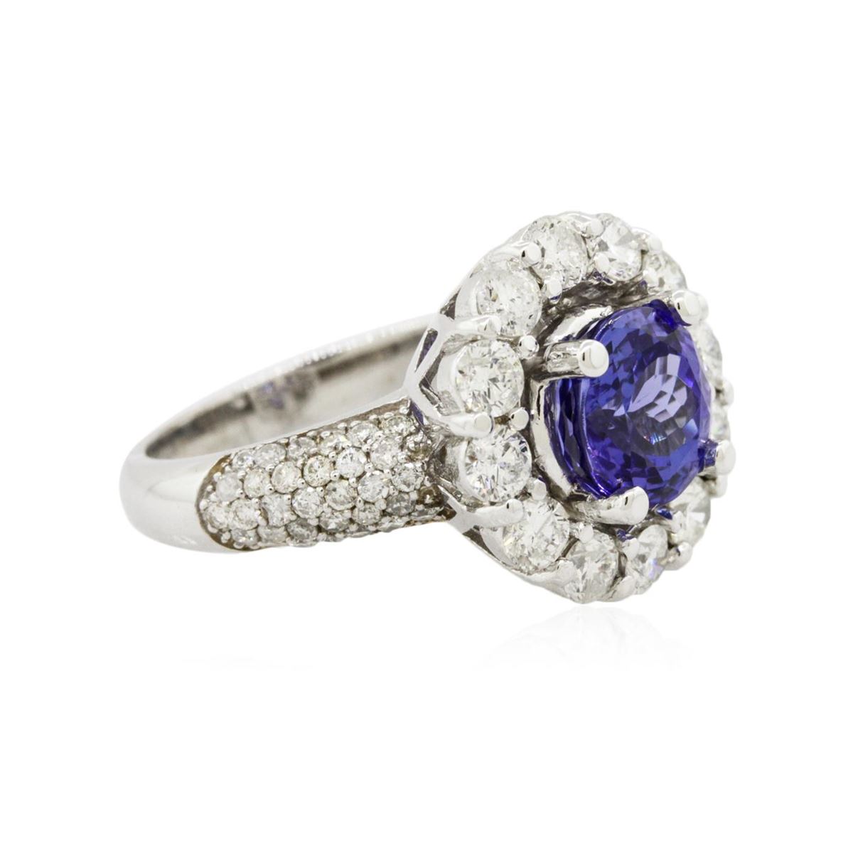 One electronically tested 14KT white gold Ladies combination cast & assembled ring with a bright polish finish. Condition is new. Identified with markings of "K14". Containing: One prong set round modified brilliant cut natural tanzanite, measuring 8.00 - 8.00 x 5.20 mm, approximate weight of 2.23ct., clarity is eye clean, type I, medium, moderately strong, bluish violet color, (GIA bV 5/4), cut is very good. Colored gemstones are presumed to have been subjected to commonly used color/clarity enhancement processes. Twelve prong set round brilliant cut diamonds, measuring 3.00 - 3.00 x 1.80mm (depth est.) approximate. Total Weight of 12 Stones = 1.19ct. Clarity: I-1 to I-2. Color: I - J, Cut is Good. Sixty-Two prong set round brilliant cut diamonds, measuring 1.30 - 1.30 x 0.78mm (depth est.) approximate. Total Weight of 62 Stones = 0.50ct. Clarity: I-1 to I-2. Color: I - J, Cut is Good. Total Weight of Colored Stones 2.23ct. Total Weight of Diamonds 1.68ct. Total Weight of Ring 8.40 grams. GGL Appraised at $9,525.00.