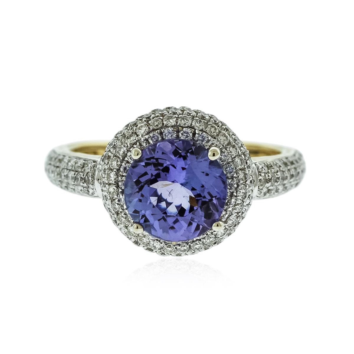 One electronically tested 14KT white gold ladies cast tanzanite and diamond ring with a bright polish finish. Identified with markings of "14K". Condition is new. Containing: One prong set round modified brilliant cut natural tanzanite, measuring 8.00. - 8.00. x 5.20 mm, approximate weight of 2.23ct., clarity is eye clean, type I, light, very slightly grayish, violet color, (GIA V 3/3), cut is good. One Hundred Ninety-Six prong set round brilliant cut diamonds, measuring 1.00. - 1.00. x 0.60mm (depth est.) approximate total weight of 196 Stones = 0.71ct. Clarity: I-1 to I-2. Color: I - J, Cut is Good. Colored gemstones are presumed to have been subjected to commonly used enhancement processes. All diamonds and colored gemstones are graded in the mounting, unless otherwise stated. Total Weight of Colored Stones 2.23ct. Total Weight of Diamonds 0.71ct. Total Weight of Ring 4.90 grams. GGL Appraised at $3,215.00.