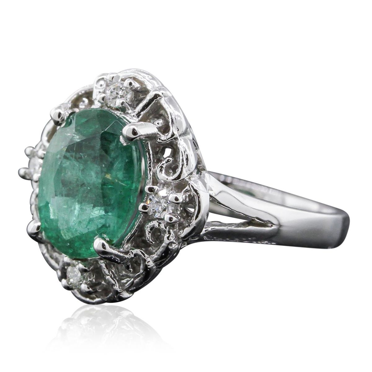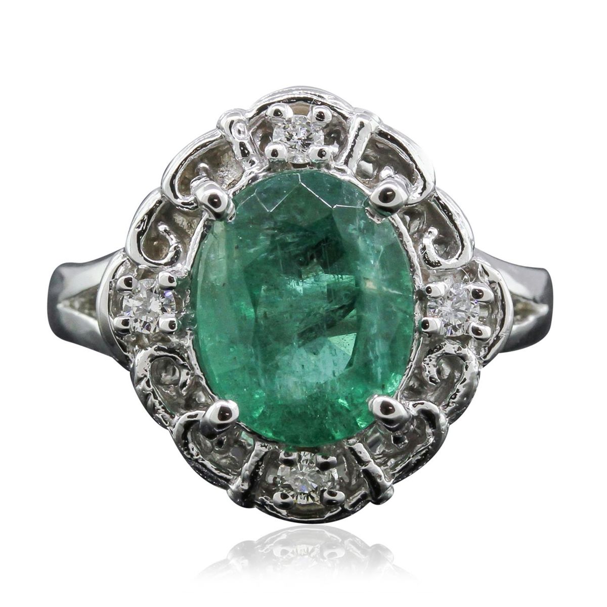 One electronically tested 14KT white gold Ladies combination cast & assembled fashion ring with a high polish finish. Condition is new. Identified with markings of "14K". Containing: One prong set oval modified mixed cut natural emerald, measuring 9.90 x 7.20 x 5.60mm, approximate weight of 2.23ct., clarity is heavily included, type III, medium, moderately strong, very slightly bluish green color, (GIA vslbG 5/4), cut is good. Colored gemstones are presumed to have been subjected to commonly used and possible undetectable color/clarity enhancement processes. Four prong set round brilliant cut diamonds, measuring 1.80 - 1.80 x 1.08mm (depth est.) approximate total weight of 4 Stones = 0.09ct. Clarity of SI-2 to I-1, Color of I - J, Cut is Good. Total Weight of Colored Stones 2.23ct. Total Weight of Diamonds 0.09ct. Total Weight of Ring 5.50 grams. GGL Appraised at $6,820.00.