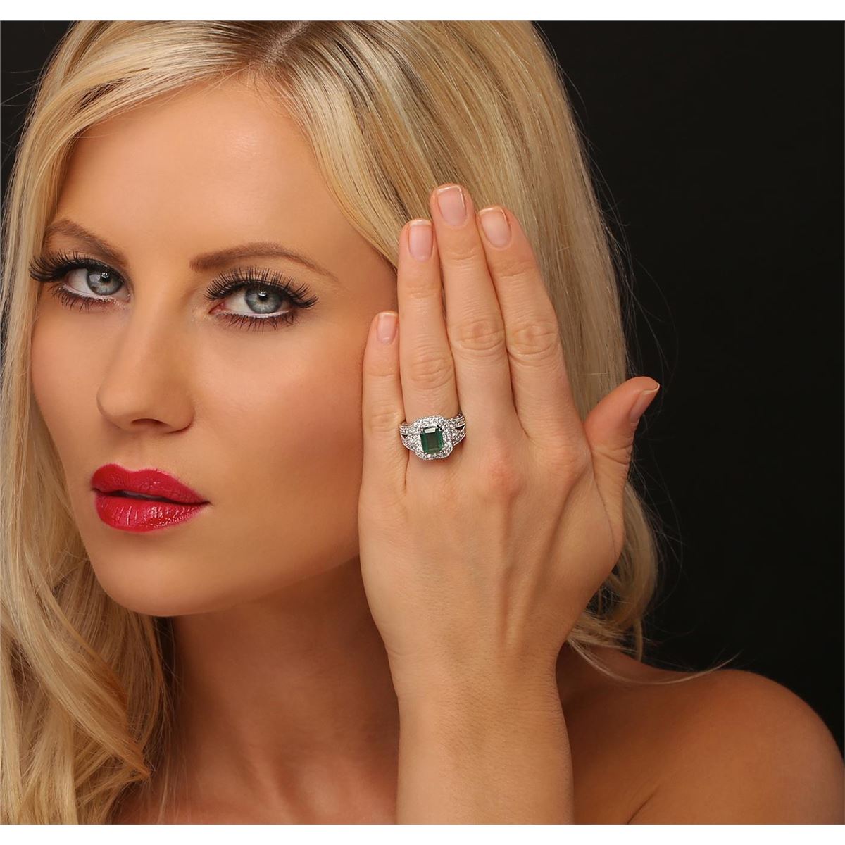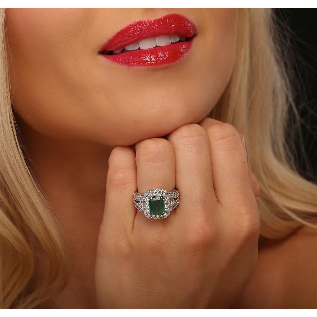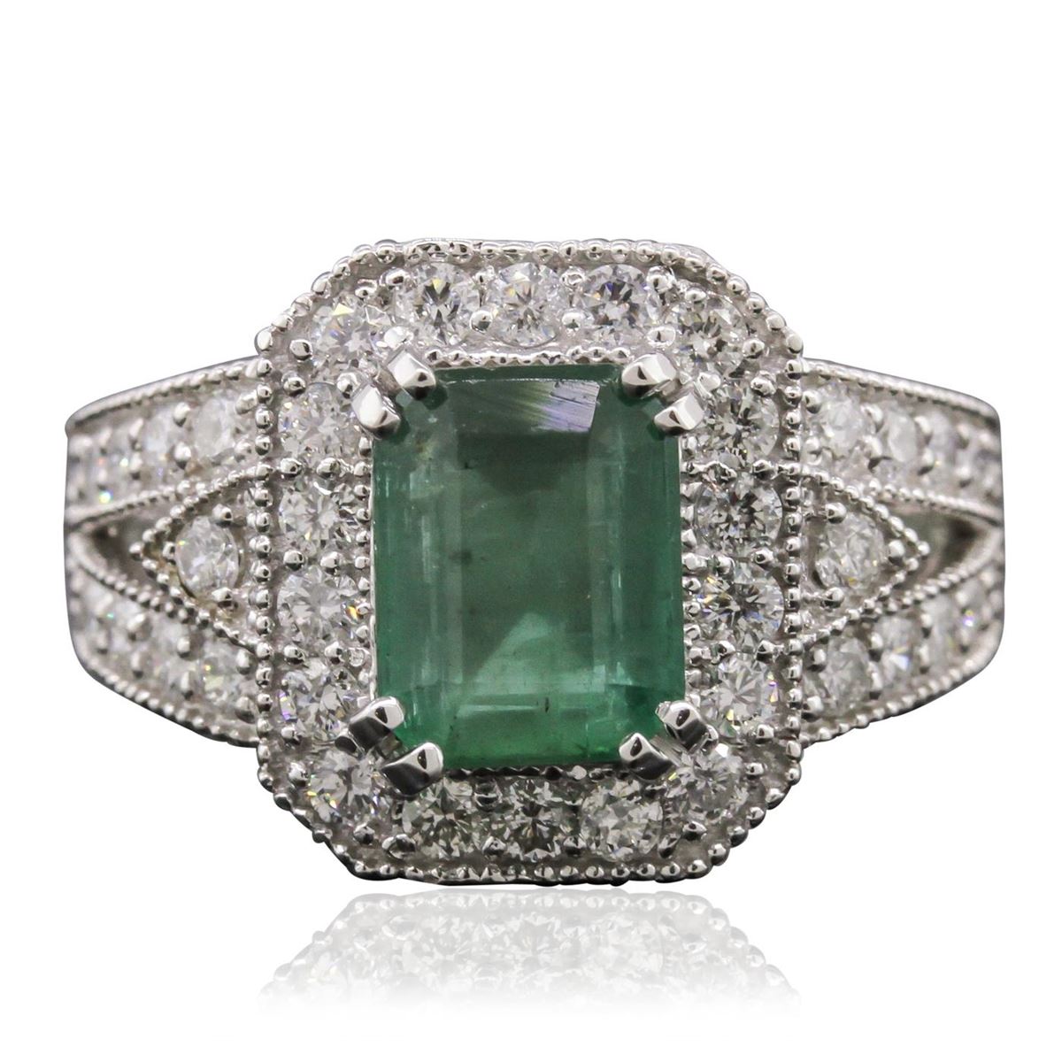 One electronically tested 14KT white gold ladies cast emerald and diamond ring with a bright and milgrain finish. Condition is new, good workmanship. The featured emerald is set within a diamond lattice gallery, supported by diamond set split shoulders and completed by a four millimeter wide band. Identified with markings of "K14". Containing: One prong set rectangular step cut natural emerald, measuring 8.85 x 6.80 x 4.50mm, approximate weight of 2.23ct., clarity is heavily included, type III, medium, very slightly grayish, very slightly bluish green color, (GIA vslbG 5/3), cut is good. Transmitting light somewhat diffusely, translucent. Naturally occurring internal & external characteristics are present. Indications of oil residue. Graded in the setting. Forty-Two prong & bead set round brilliant cut diamonds, measuring 2.10 - 1.90 x 1.20mm (depth est.) approximate. Total Weight of 42 Stones = 1.27ct. Graded in the setting. Clarity: I-1 to I-2. Color: G - I. Total Weight of Colored Stones 2.23ct. Total Weight of Diamonds 1.27ct. Total Weight of Ring 7.50 grams. AIG Appraised at $5,250.00.