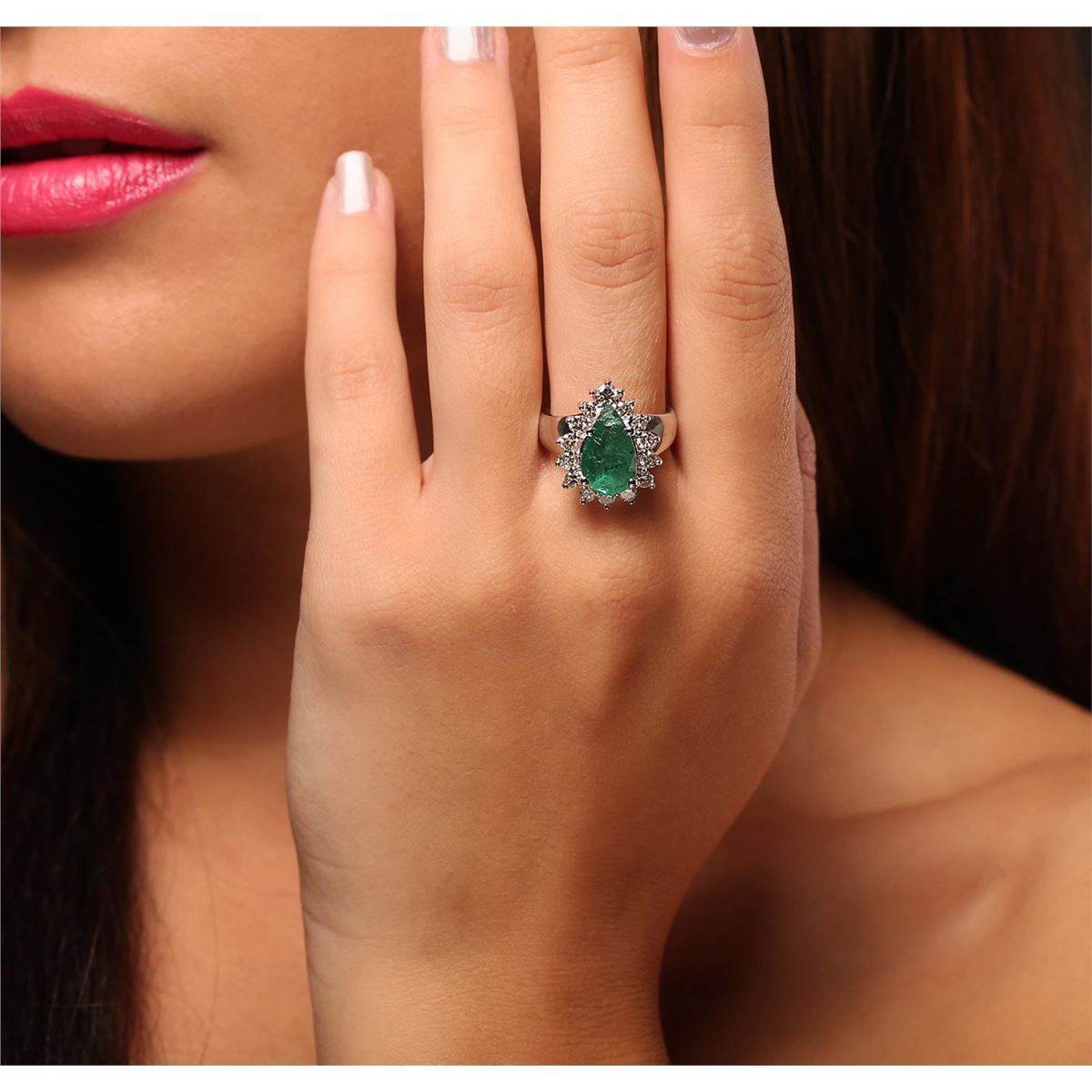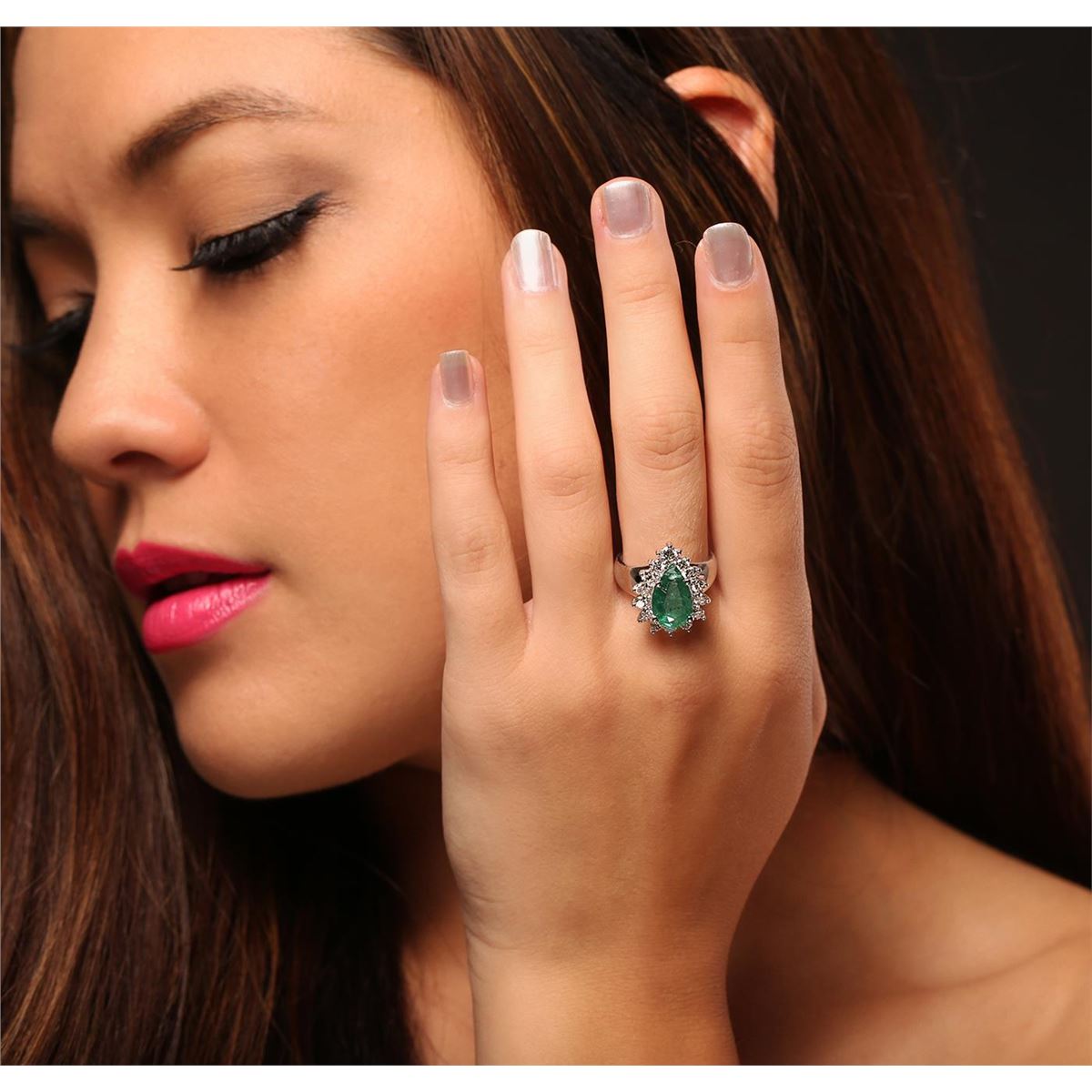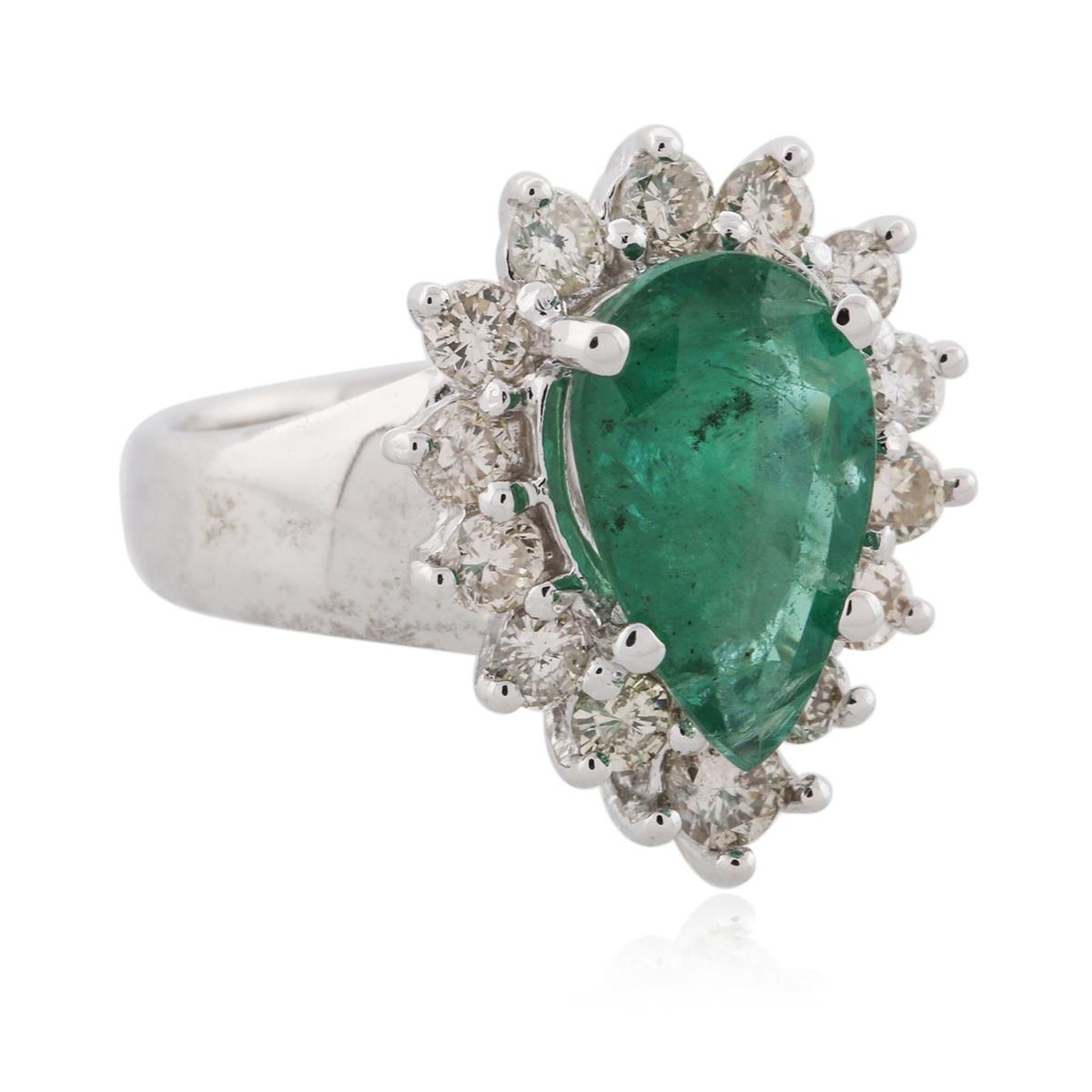 One electronically tested 14KT white gold Ladies combination cast & assembled fashion ring with a high polish finish. Condition is new. Identified with markings of "14K". Containing: One prong set pear modified mixed cut natural emerald, measuring 12.50 x 7.80 x 4.20mm, approximate weight of 2.23ct., clarity is heavily included, type III, medium, very slightly grayish, very slightly bluish green color, (GIA vslbG 5/3), cut is good. Colored gemstones are presumed to have been subjected to commonly used and possible undetectable color/clarity enhancement processes. Fourteen prong set round brilliant cut diamonds, measuring 2.50 - 2.50 x 1.50mm (depth est.) approximate total weight of 14 Stones = 0.80ct. Clarity of SI-1 to I-1, Color of J - L, Cut is Good. Total Weight of Colored Stones 2.23ct. Total Weight of Diamonds 0.80ct. Total Weight of Ring 8.50 grams. GGL Appraised at $8,920.00.