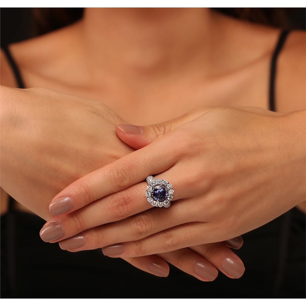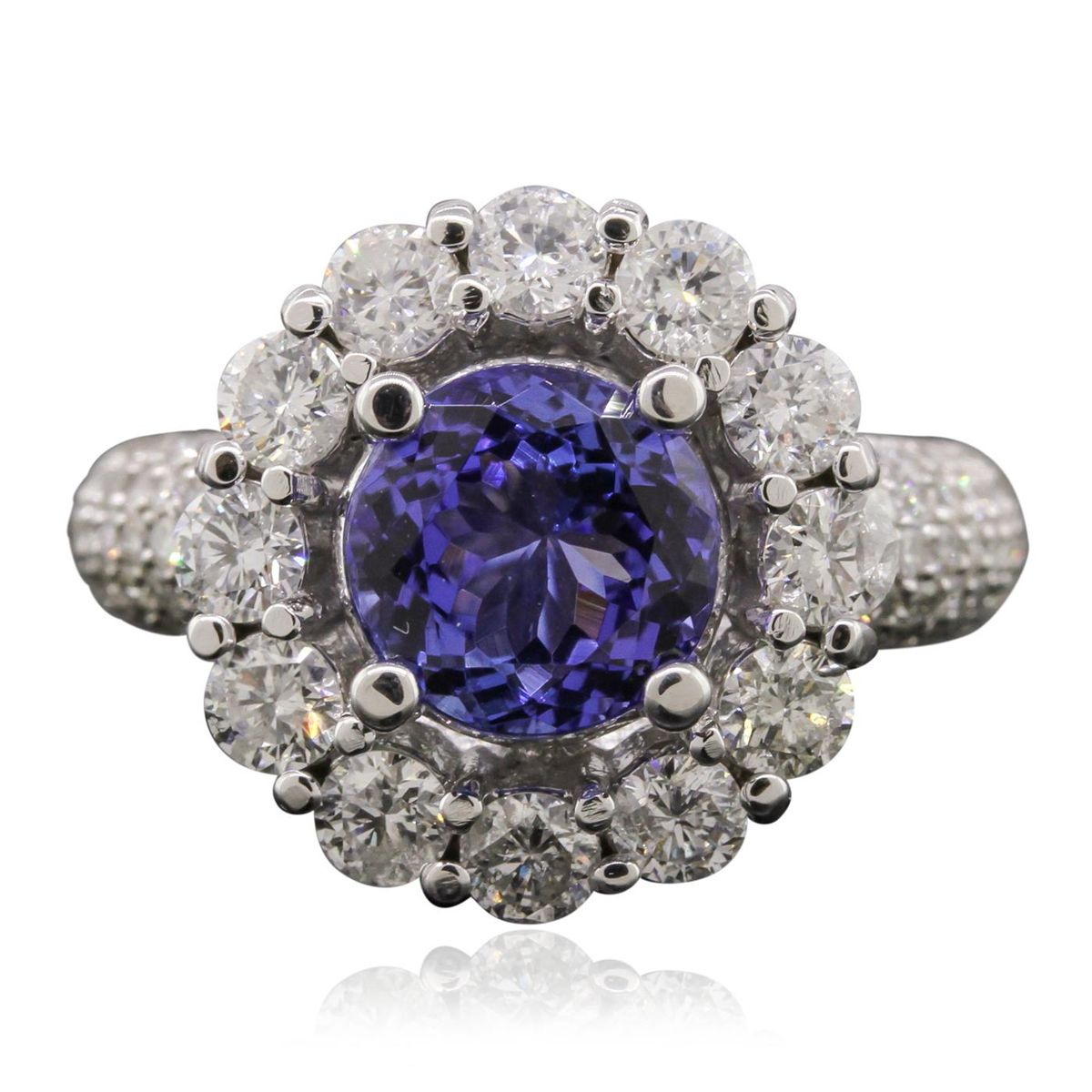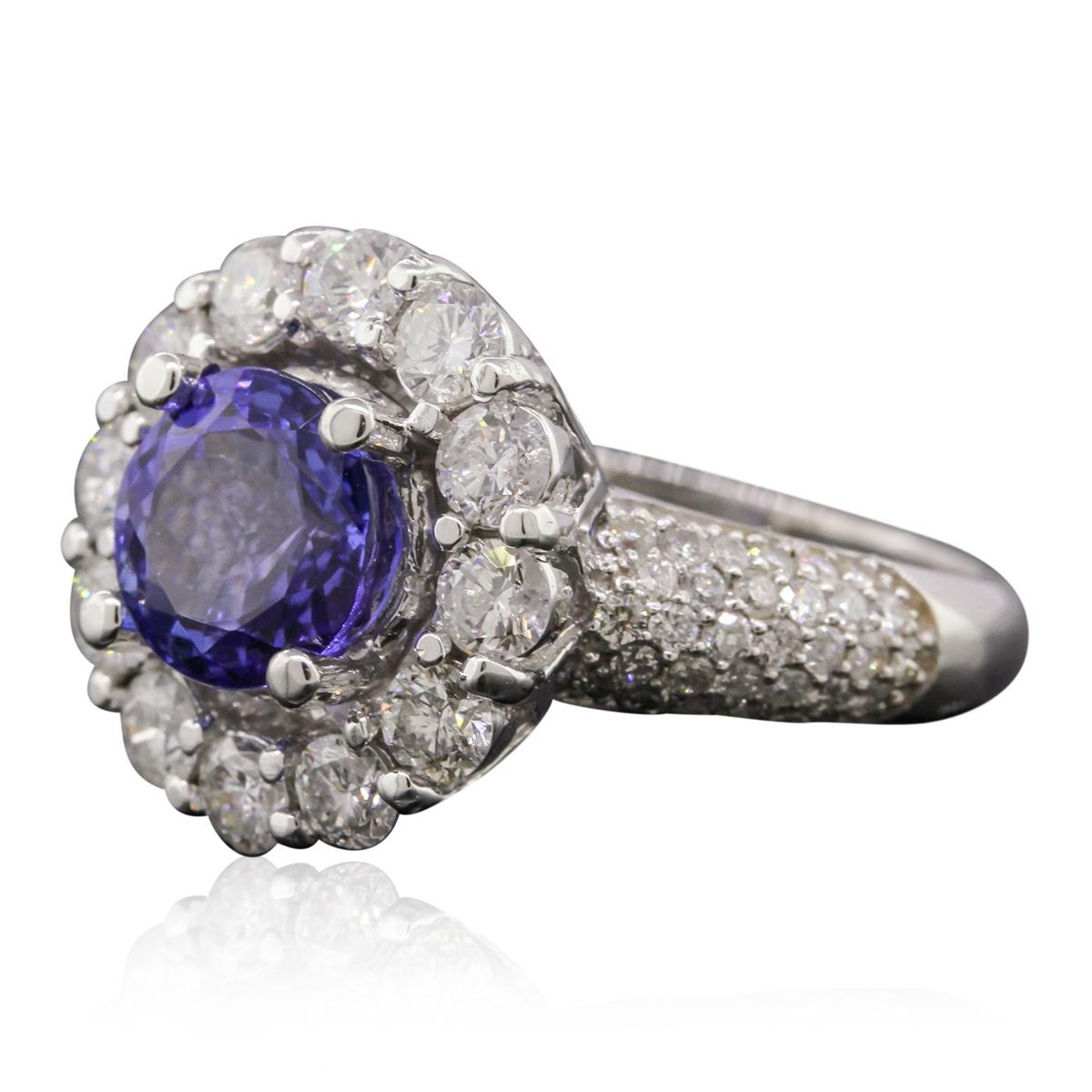 One electronically tested 14KT white gold Ladies combination cast & assembled ring with a bright polish finish. Condition is new. Identified with markings of "K14". Containing: One prong set round modified brilliant cut natural tanzanite, measuring 8.00 - 8.00 x 5.20 mm, approximate weight of 2.23ct., clarity is eye clean, type I, medium, moderately strong, bluish violet color, (GIA bV 5/4), cut is very good. Colored gemstones are presumed to have been subjected to commonly used color/clarity enhancement processes. Twelve prong set round brilliant cut diamonds, measuring 3.00 - 3.00 x 1.80mm (depth est.) approximate. Total Weight of 12 Stones = 1.19ct. Clarity: I-1 to I-2. Color: I - J, Cut is Good. Sixty-Two prong set round brilliant cut diamonds, measuring 1.30 - 1.30 x 0.78mm (depth est.) approximate. Total Weight of 62 Stones = 0.50ct. Clarity: I-1 to I-2. Color: I - J, Cut is Good. Total Weight of Colored Stones 2.23ct. Total Weight of Diamonds 1.68ct. Total Weight of Ring 8.40 grams. GGL Appraised at $9,525.00.