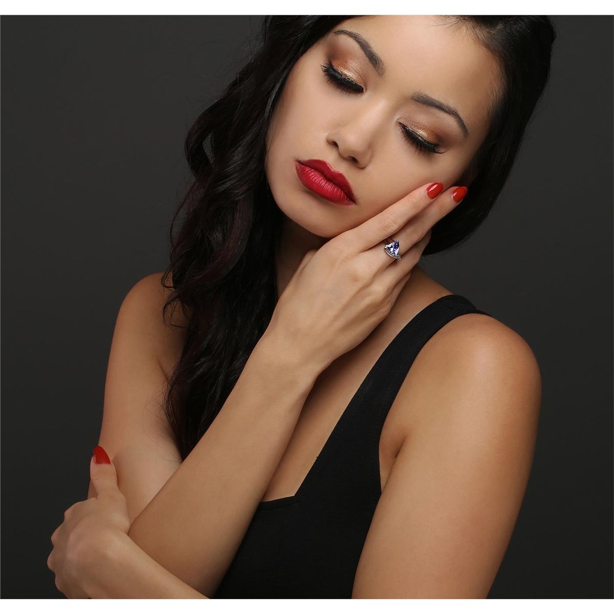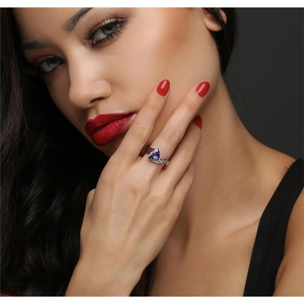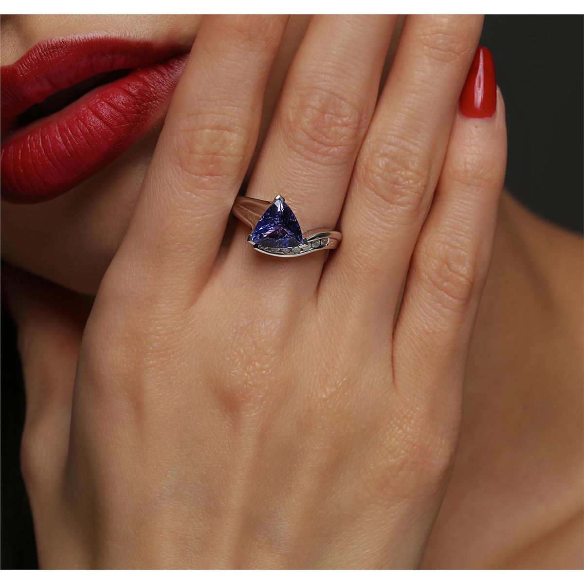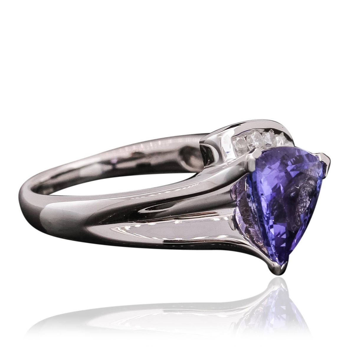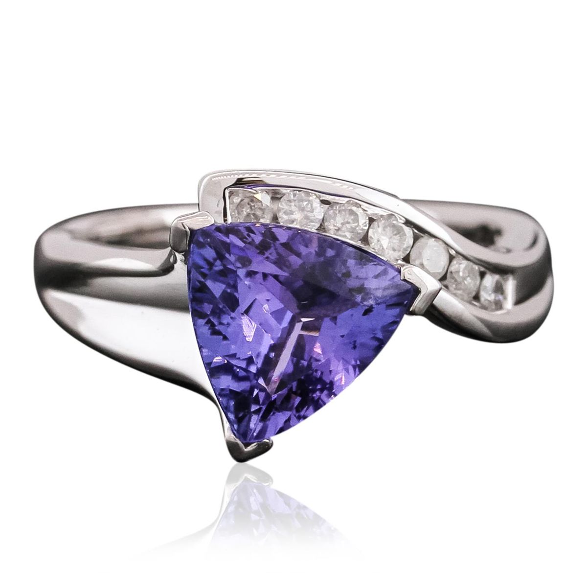One electronically tested 14KT white gold ladies cast tanzanite and diamond ring with a bright polish finish. The featured tanzanite is supported by a diamond ribbon, completed by a two millimeter wide band. Trademark is Orianne. Identified with markings of "14K". Condition is new, good workmanship. Containing: One prong set triangle brilliant cut natural tanzanite, measuring 9.00 x 8.80 x 4.40mm, 6% bulge factor, approximate weight of 2.23ct., clarity is slightly included, type I, medium dark, very slightly grayish, bluish violet color, (GIA bV 6/3), cut is good. Transmitting light with a minimum of distortion, transparent. Graded in the setting. Tanzanite is a very rare gemstone that is only found in the country of Tanzania. Originally discovered in 1967. Tiffany & Company, named the stone Tanzanite. It is found in the Usumburu Mountains that border the Umba Valley of northern Tanzania. Tanzanite occurs in gray, brown, violet, blue, reddish-purple, & green. The gem is interesting because of its exceptional pleochroism. Rotated in different directions a tanzanite will exhibit multiple changes of color. Tanzanite has a low tolerance to ultrasonic cleaning, and should not be cleaned using this method. Seven prong set round brilliant cut diamonds, measuring 1.90 - 1.80 x 1.11mm (depth est.) approximate total weight of 7 Stones = 0.26ct. Graded in the setting. Clarity: I-2 to I-3. Color: H - J. Total Weight of Colored Stones 2.23ct. Total Weight of Diamonds 0.26ct. Total Weight of Ring 4.46 grams. AIG Appraised at $6,135.00.
