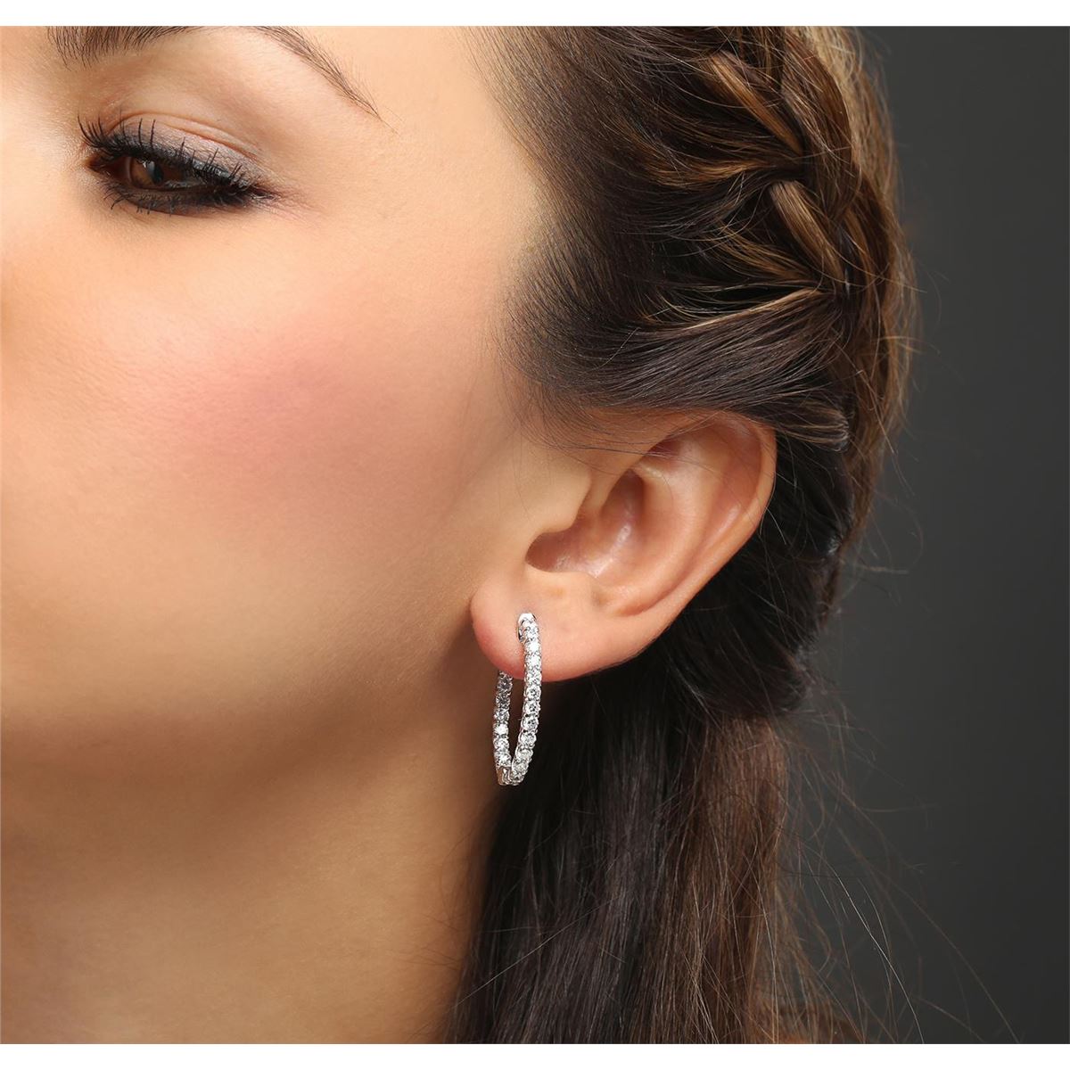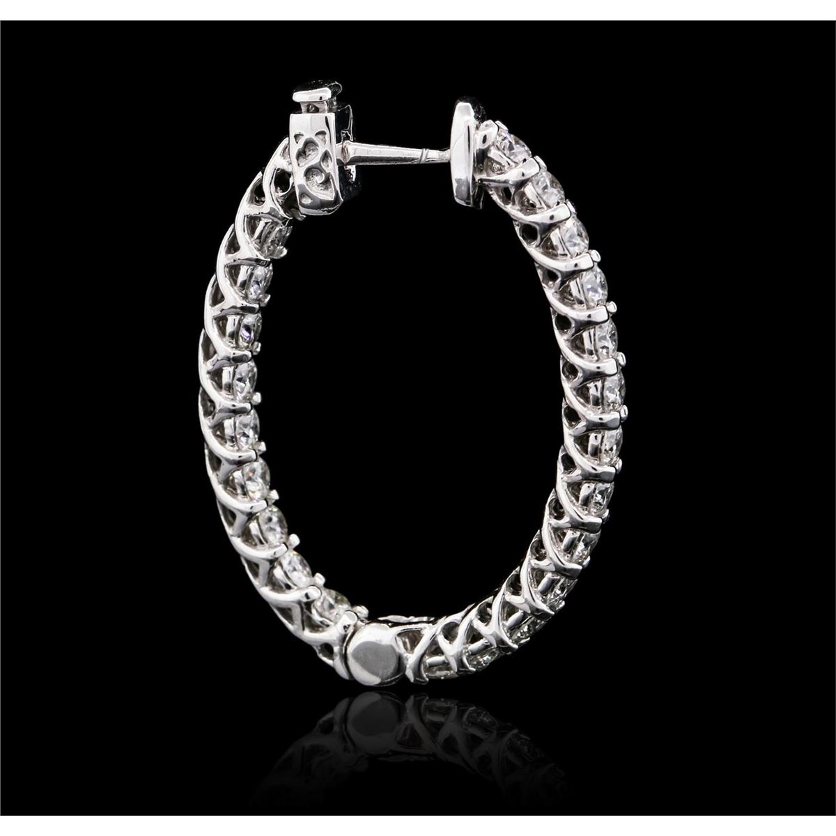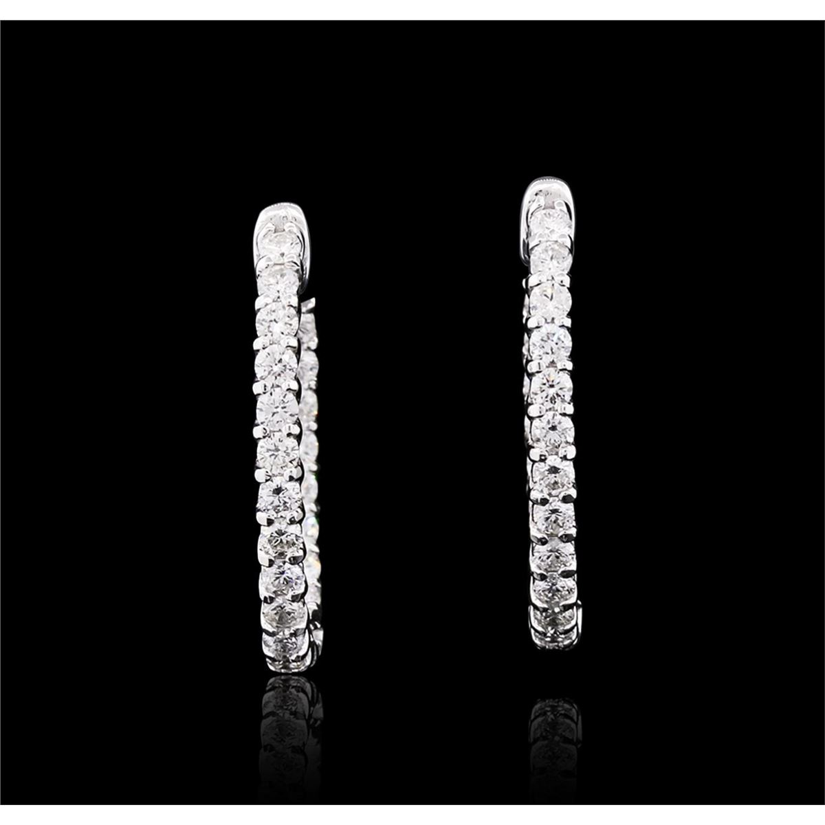 One pair electronically tested 14KT white gold ladies combination cast & assembled diamond hoop earrings with a bright polish finish. Identified with markings of "14K". Condition is new. Containing: Forty-Four prong set round brilliant cut diamonds, measuring 2.40 - 2.40 x 1.44mm (depth est.) approximate total weight of 44 Stones = 2.23ct. Clarity: SI-2 to I-1. Color: I - J, Cut is Good. All diamonds are graded in the mounting, unless otherwise stated. Total Weight of Diamonds 2.23ct. Total Weight of Earrings 7.86 grams. GGL Appraised at $7,445.00.