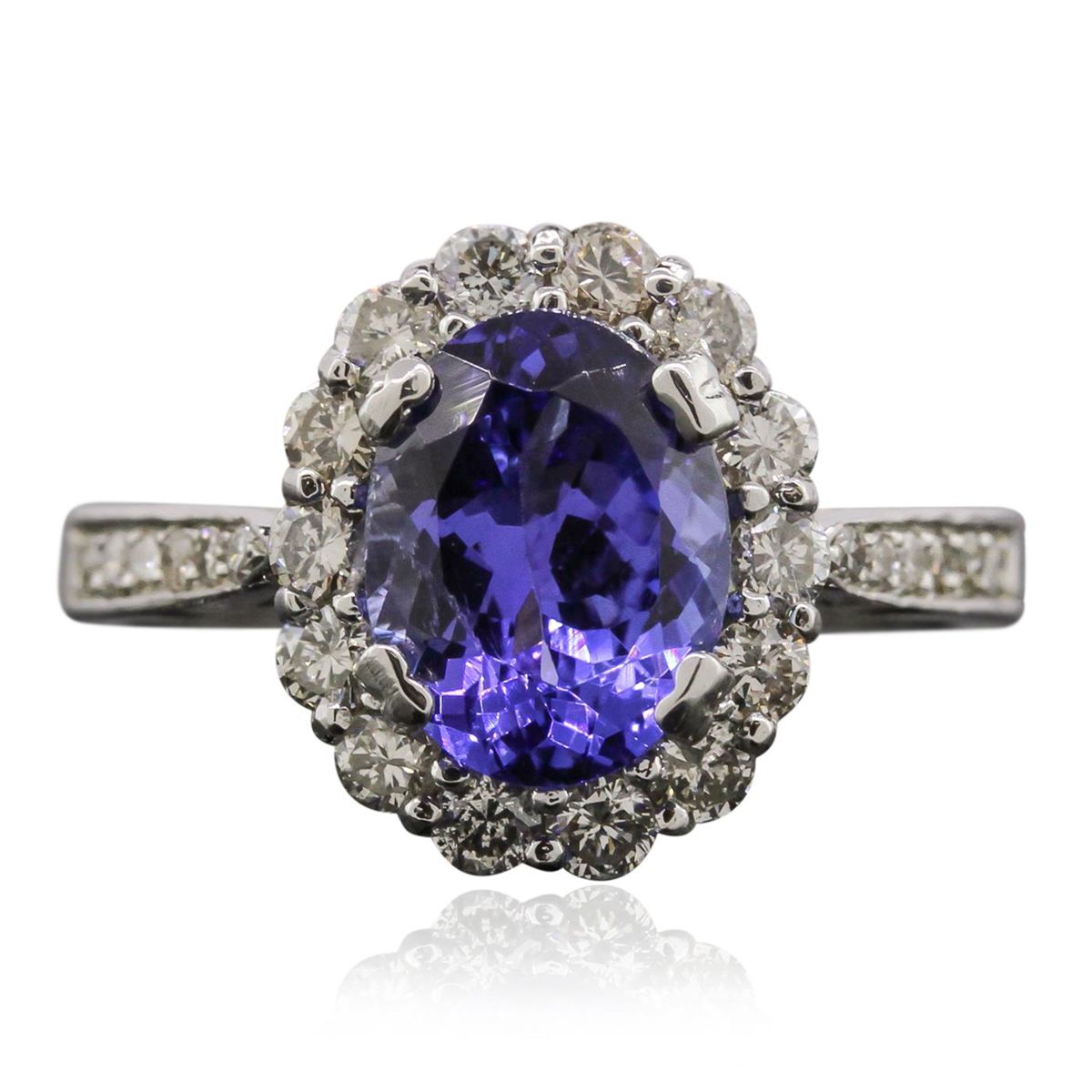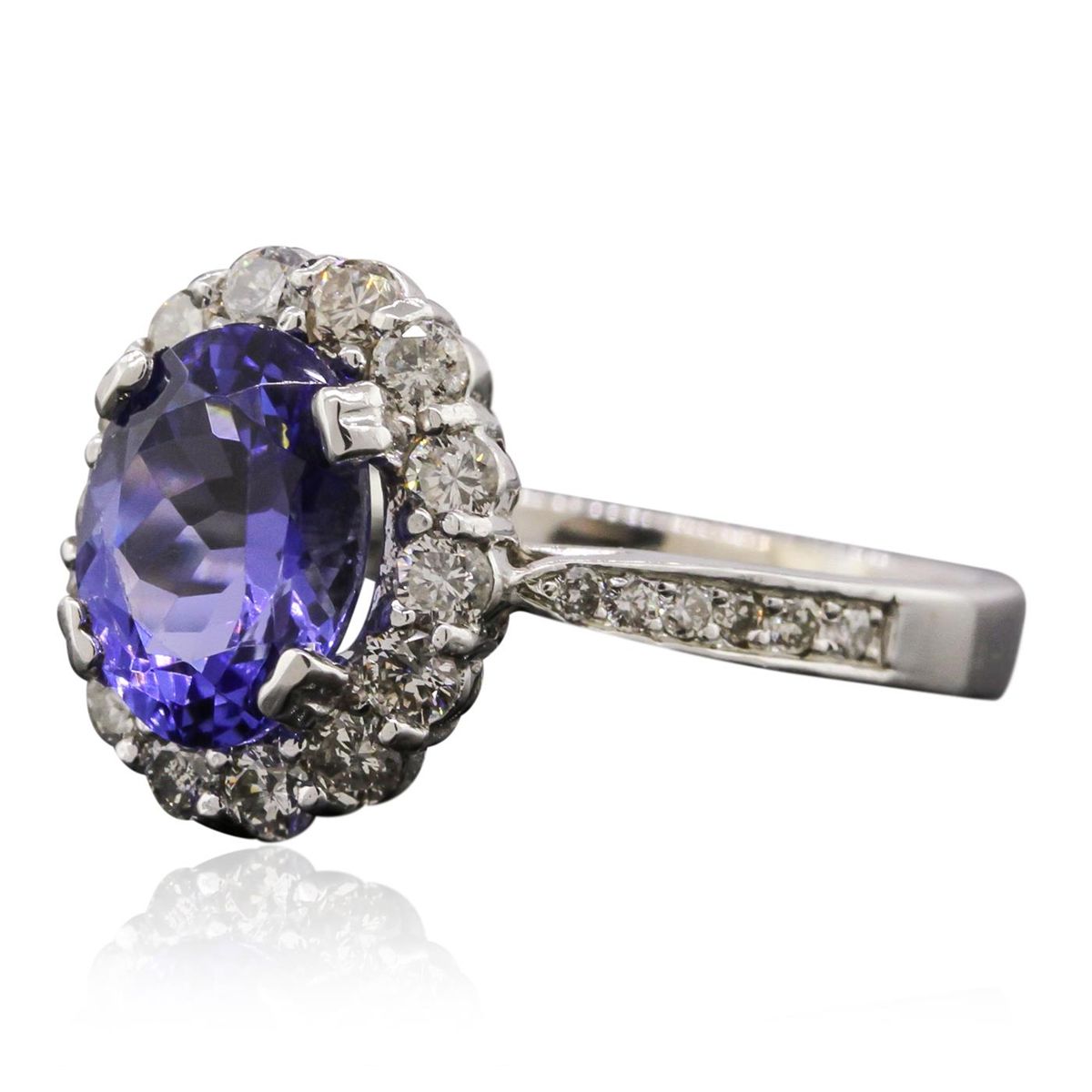 One electronically tested 14KT white gold Ladies combination cast & assembled ring with a bright polish finish. Condition is new. Identified with markings of "K14". Containing: One prong set oval modified brilliant cut natural tanzanite, measuring 9.40 x 7.20 x 4.85mm, approximate weight of 2.24ct., clarity is eye clean, type I, medium, very slightly grayish, bluish violet color, (GIA bV 5/3), cut is good. Colored gemstones are presumed to have been subjected to commonly used color/clarity enhancement processes. Twenty-Six prong set round brilliant cut diamonds, measuring 2.00 - 1.60 x 1.08mm (depth est.) approximate. Total Weight of 26 Stones = 0.55ct. Clarity: I-1 to I-2. Color: J - K, Cut is Good. Total Weight of Colored Stones 2.24ct. Total Weight of Diamonds 0.55ct. Total Weight of Ring 4.60 grams. GGL Appraised at $4,780.00.