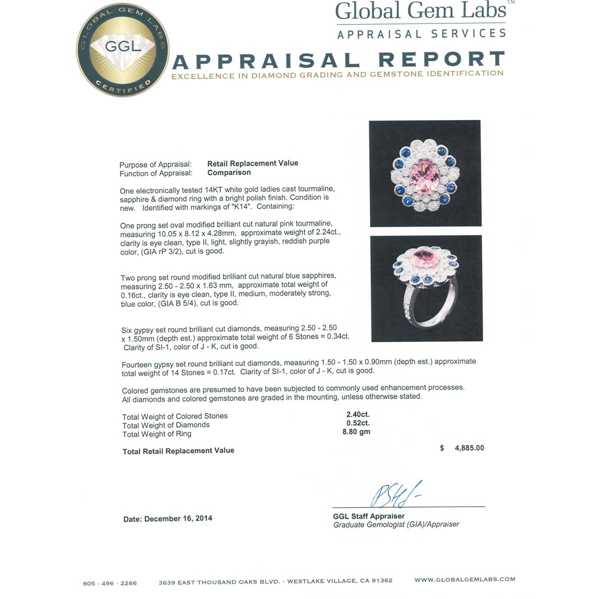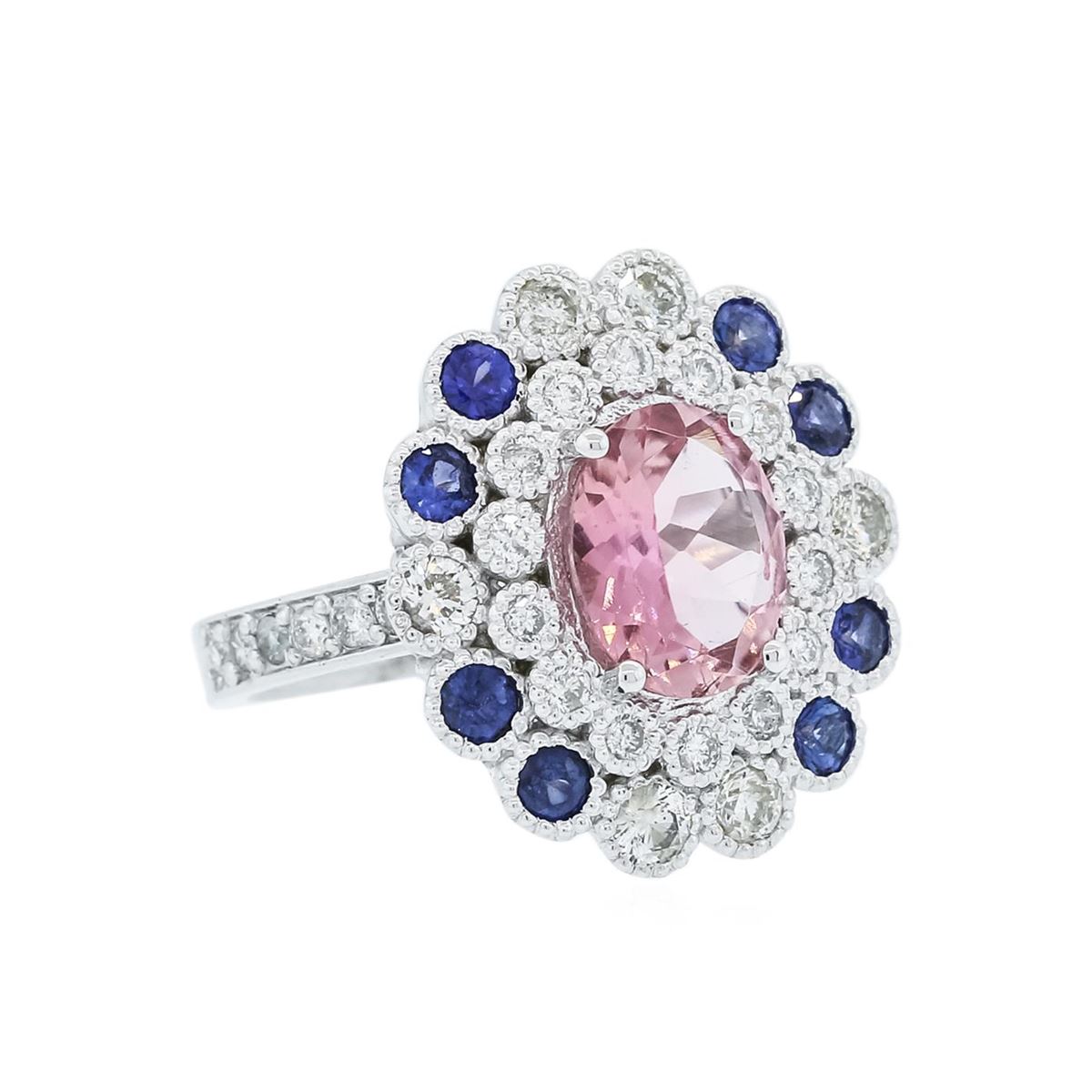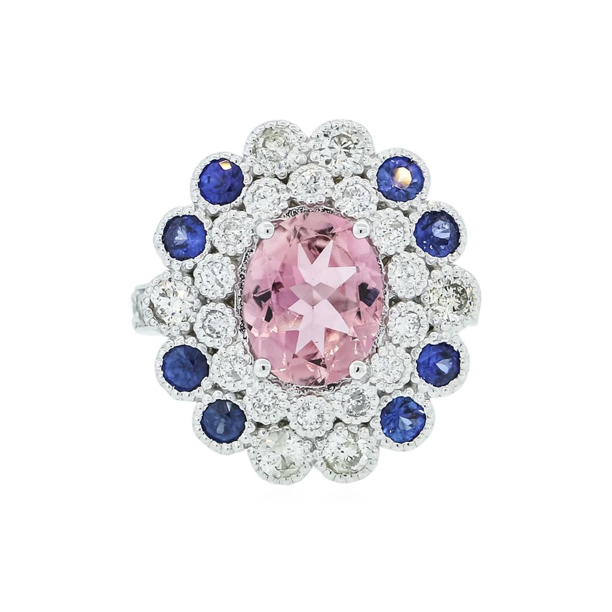 One electronically tested 14KT white gold ladies cast tourmaline, sapphire & diamond ring with a bright polish finish. Identified with markings of "K14". Condition is new. Containing: One prong set oval modified brilliant cut natural pink tourmaline, measuring 10.05 x 8.12 x 4.28mm, approximate weight of 2.24ct., clarity is eye clean, type II, light, slightly grayish, reddish purple color, (GIA rP 3/2), cut is good. Two prong set round modified brilliant cut natural blue sapphires, measuring 2.50 - 2.50 x 1.63 mm, approximate total weight of 0.16ct., clarity is eye clean, type II, medium, moderately strong, blue color, (GIA B 5/4), cut is good. Six gypsy set round brilliant cut diamonds, measuring 2.50 - 2.50 x 1.50mm (depth est.) approximate total weight of 6 Stones = 0.34ct. Clarity: SI-1. Color: J - K, Cut is Good. Fourteen gypsy set round brilliant cut diamonds, measuring 1.50 - 1.50 x 0.90mm (depth est.) approximate total weight of 14 Stones = 0.17ct. Clarity: SI-1. Color: J - K, Cut is Good. Colored gemstones are presumed to have been subjected to commonly used enhancement processes. All diamonds and colored gemstones are graded in the mounting, unless otherwise stated. Total Weight of Colored Stones 2.40ct. Total Weight of Diamonds 0.52ct. Total Weight of Ring 8.80 grams. GGL Appraised at $4,885.00.