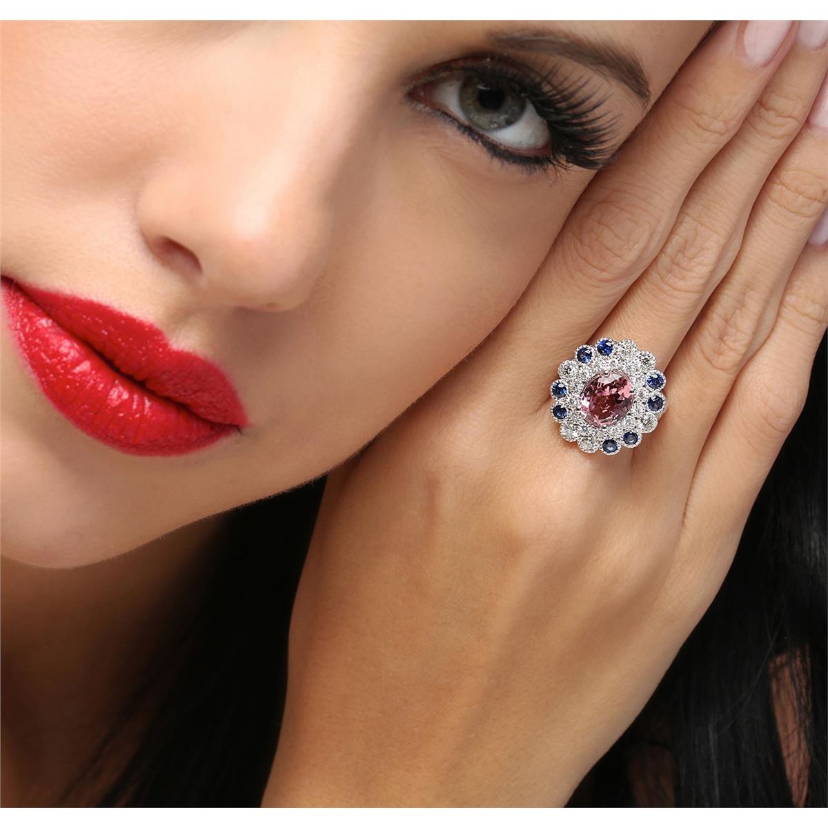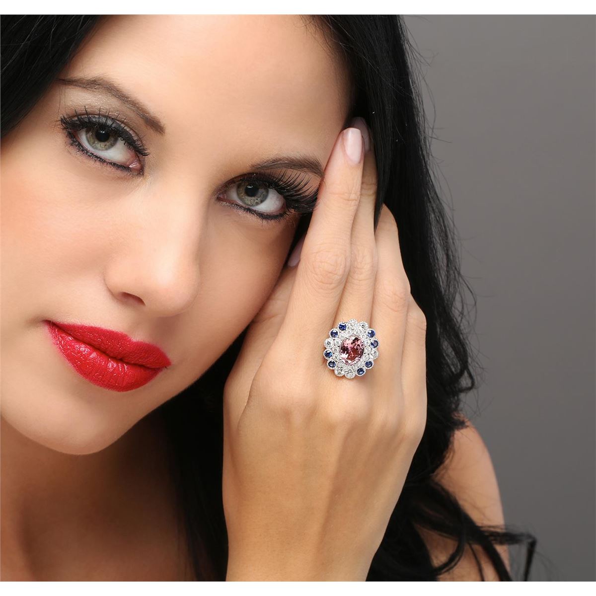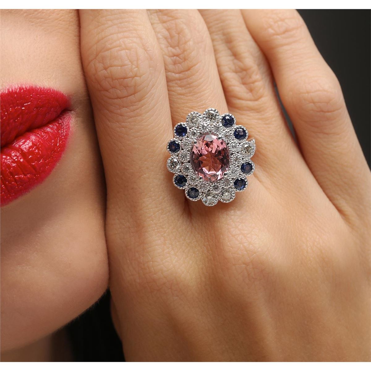 One electronically tested 14KT white gold ladies cast tourmaline, sapphire & diamond ring with a bright polish finish. Identified with markings of "K14". Condition is new. Containing: One prong set oval modified brilliant cut natural pink tourmaline, measuring 10.05 x 8.12 x 4.28mm, approximate weight of 2.24ct., clarity is eye clean, type II, light, slightly grayish, reddish purple color, (GIA rP 3/2), cut is good. Two prong set round modified brilliant cut natural blue sapphires, measuring 2.50 - 2.50 x 1.63 mm, approximate total weight of 0.16ct., clarity is eye clean, type II, medium, moderately strong, blue color, (GIA B 5/4), cut is good. Six gypsy set round brilliant cut diamonds, measuring 2.50 - 2.50 x 1.50mm (depth est.) approximate total weight of 6 Stones = 0.34ct. Clarity: SI-1. Color: J - K, Cut is Good. Fourteen gypsy set round brilliant cut diamonds, measuring 1.50 - 1.50 x 0.90mm (depth est.) approximate total weight of 14 Stones = 0.17ct. Clarity: SI-1. Color: J - K, Cut is Good. Colored gemstones are presumed to have been subjected to commonly used enhancement processes. All diamonds and colored gemstones are graded in the mounting, unless otherwise stated. Total Weight of Colored Stones 2.40ct. Total Weight of Diamonds 0.52ct. Total Weight of Ring 8.80 grams. GGL Appraised at $4,885.00.