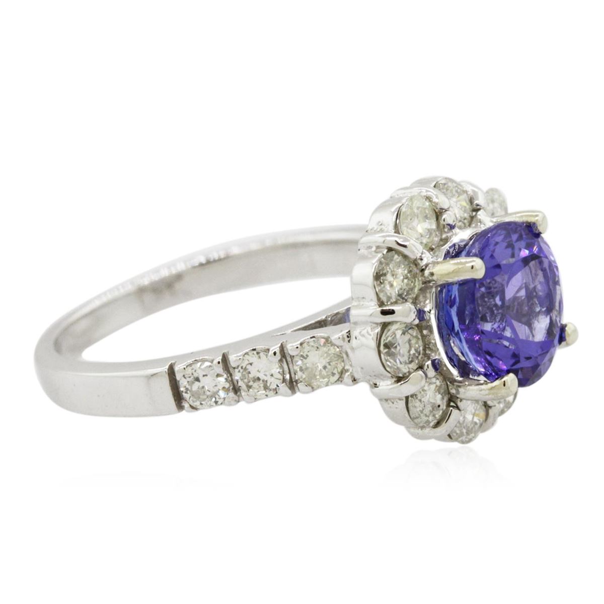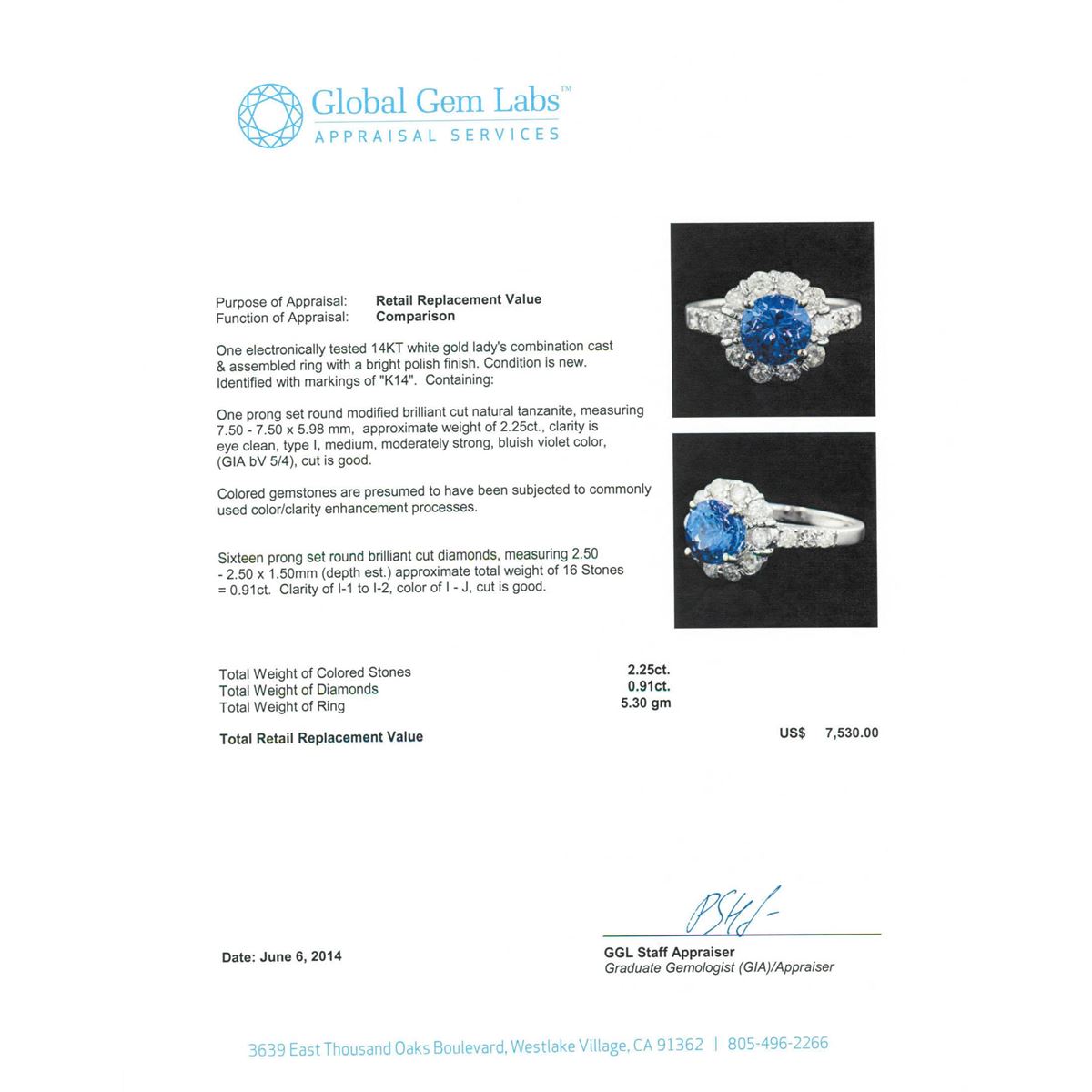 One electronically tested 14KT white gold Ladies combination cast & assembled ring with a bright polish finish. Condition is new. Identified with markings of "K14". Containing: One prong set round modified brilliant cut natural tanzanite, measuring 7.50 - 7.50 x 5.98 mm, approximate weight of 2.25ct., clarity is eye clean, type I, medium, moderately strong, bluish violet color, (GIA bV 5/4), cut is good. Colored gemstones are presumed to have been subjected to commonly used color/clarity enhancement processes. Sixteen prong set round brilliant cut diamonds, measuring 2.50 - 2.50 x 1.50mm (depth est.) approximate. Total Weight of 16 Stones = 0.91ct. Clarity: I-1 to I-2. Color: I - J, Cut is Good. Total Weight of Colored Stones 2.25ct. Total Weight of Diamonds 0.91ct. Total Weight of Ring 5.30 grams. GGL Appraised at $7,530.00.