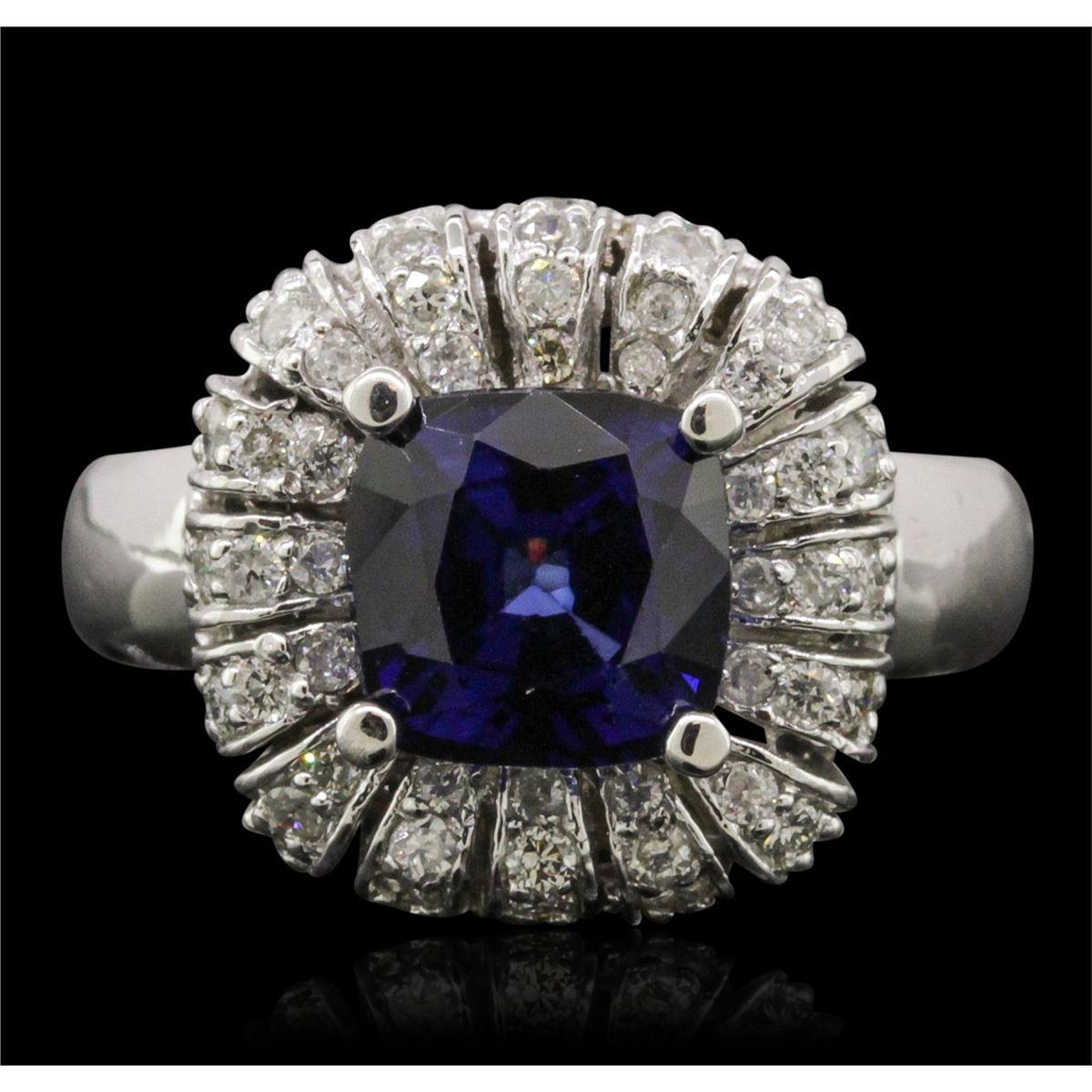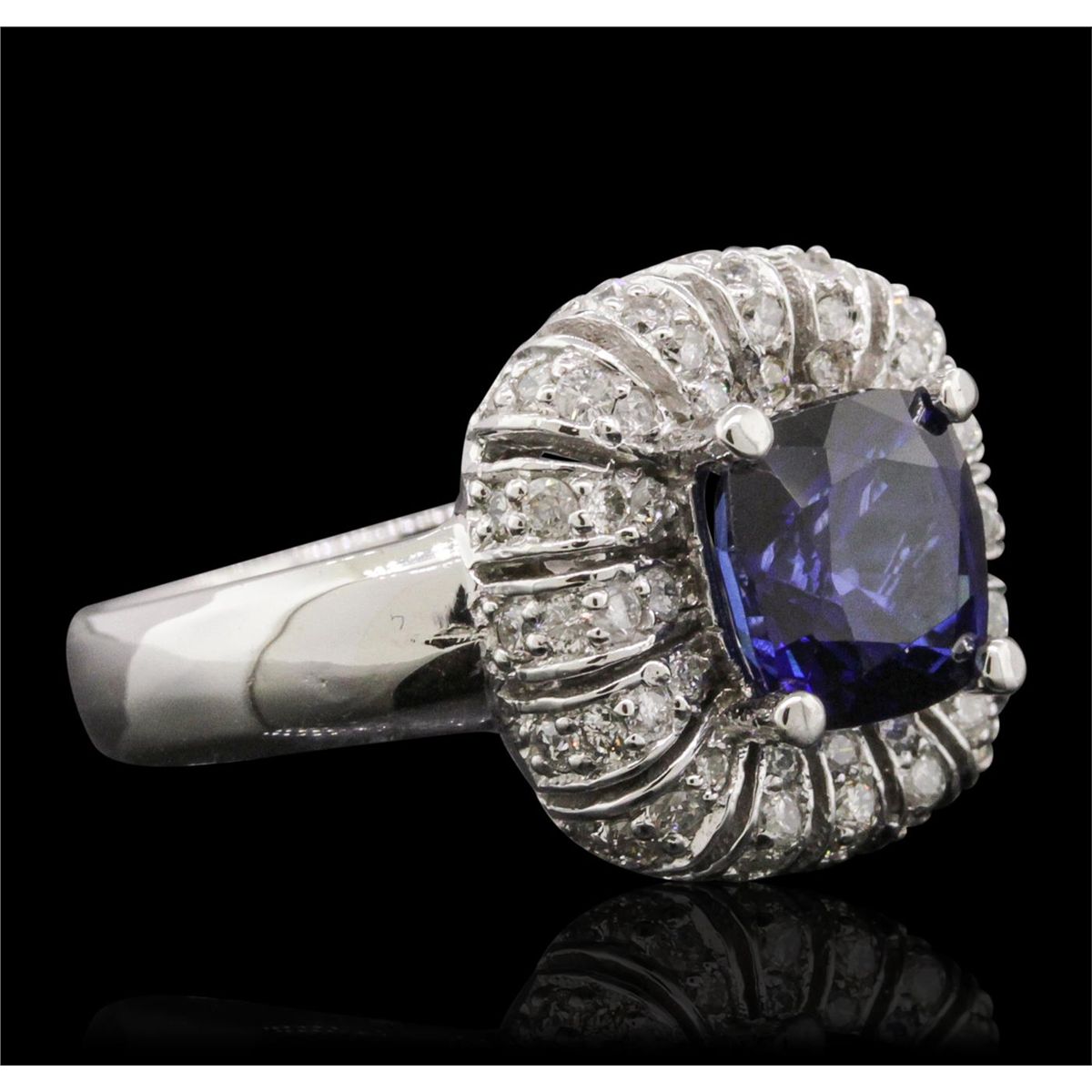 One electronically tested 14KT white gold ladies combination cast & assembled ring with a bright polish finish. Condition is new. Identified with markings of "14K". Containing: Sixty-Four prong set round brilliant cut diamonds, measuring 1.30 - 1.30 x 0.78mm (depth est.) approximate. Total Weight of 64 Stones = 0.51ct. Clarity: I-1 to I-2. Color: H - I, Cut is Good. One prong set square cushion modified brilliant cut natural tanzanite, measuring 7.60 x 7.60 x 4.94mm, approximate weight of 2.25ct., clarity is eye clean, type I, medium, moderately strong, blue color, (GIA B 5/4), cut is good. Colored gemstones are presumed to have been subjected to commonly used enhancement processes. All diamonds and colored gemstones are graded in the mounting, unless otherwise stated. Total Weight of Colored Stones 2.25ct. Total Weight of Diamonds 0.51ct. Total Weight of Ring 6.80 grams. GGL Appraised at $6,970.00.