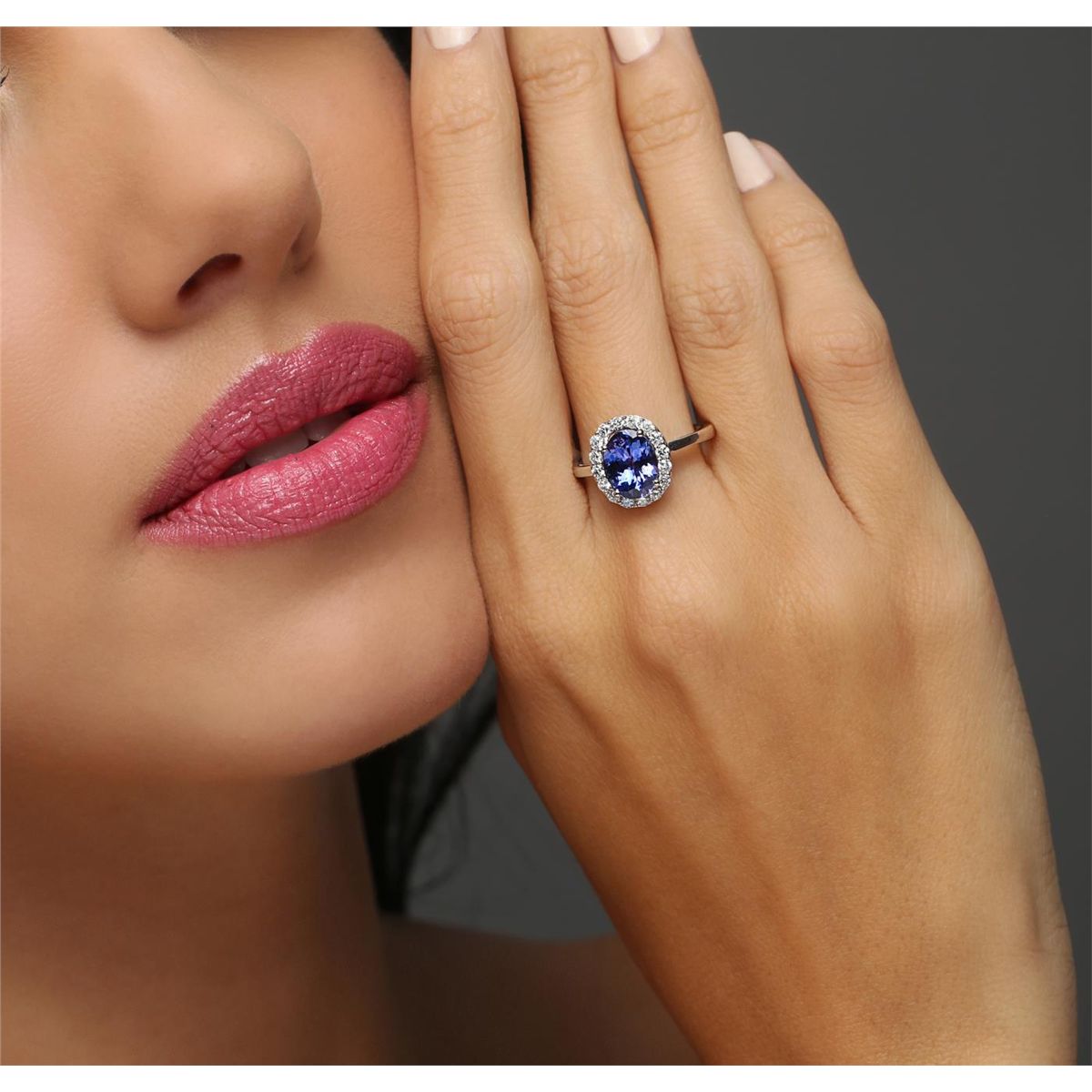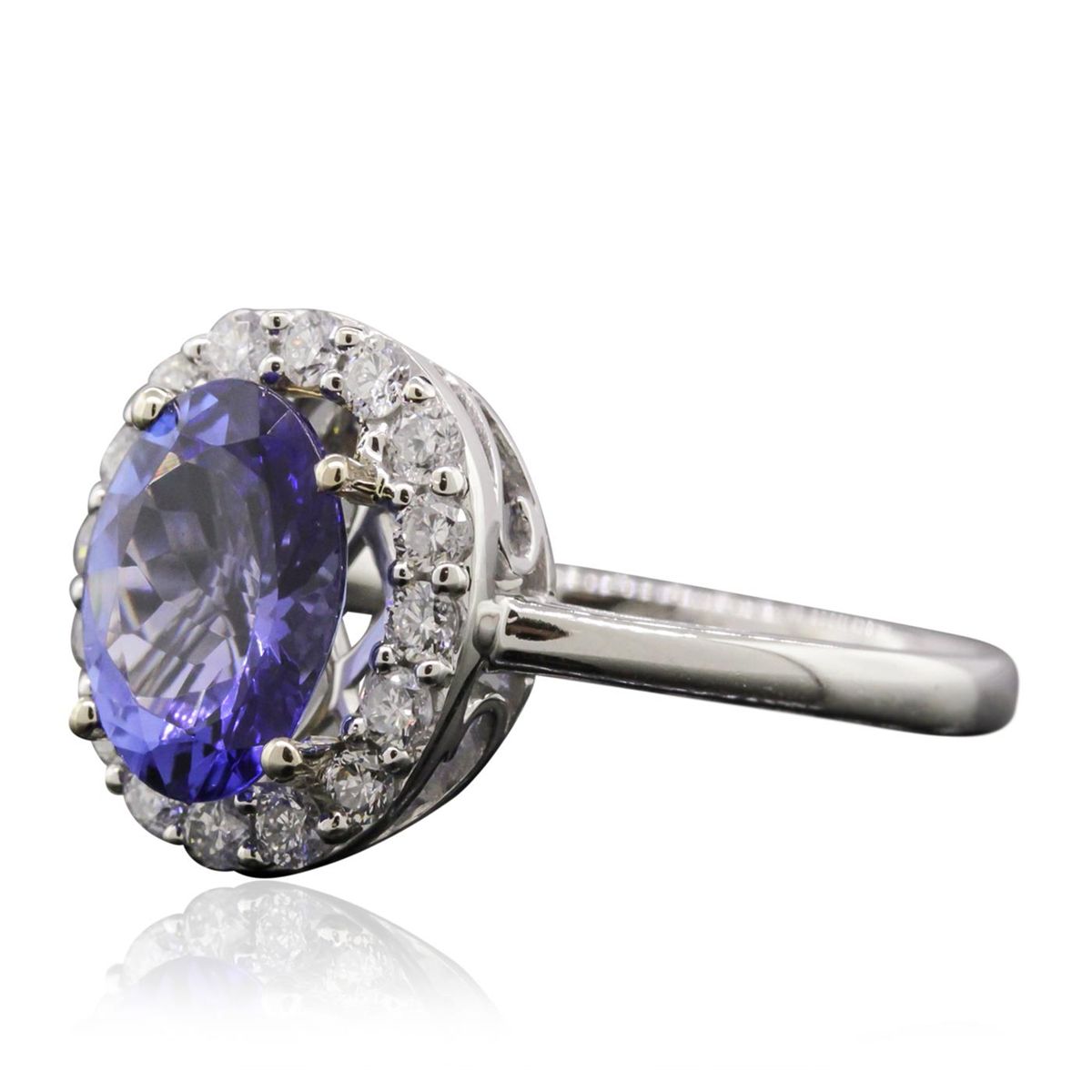 One electronically tested 14KT white gold Ladies combination cast & assembled ring with a bright polish finish. Condition is new. Identified with markings of "14K". Containing: Sixteen prong set round brilliant cut diamonds, measuring 1.80 - 1.80 x 1.08mm (depth est.) approximate total weight of 16 Stones = 0.34ct. Clarity: I-1. Color: H - I, Cut is Good. One prong set oval modified brilliant cut natural tanzanite, measuring 9.30 x 7.40 x 4.81mm, approximate weight of 2.25ct., clarity is eye clean, type I, medium, moderately strong, bluish violet color, (GIA bV 5/4), cut is good. Colored gemstones are presumed to have been subjected to commonly used enhancement processes. All diamonds and colored gemstones are graded in the mounting, unless otherwise stated. Total Weight of Colored Stones 2.25ct. Total Weight of Diamonds 0.34ct. Total Weight of Ring 3.60 grams. GGL Appraised at $5,105.00.